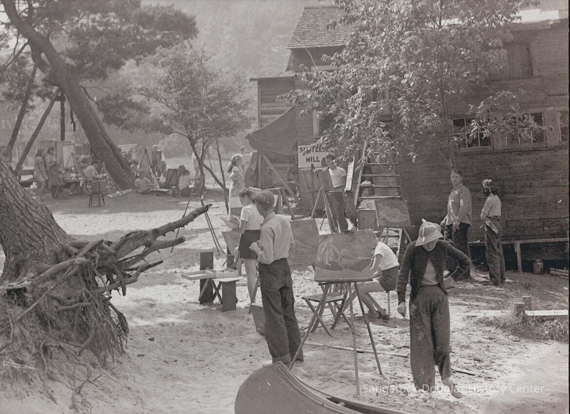 3. Mounted on foam-core 13"w x10"h black and white photo of Ox-Bow artists circa 1950-1960 on the edge of the lagoon with the bent trees in the background. Simmons photos negative number a266