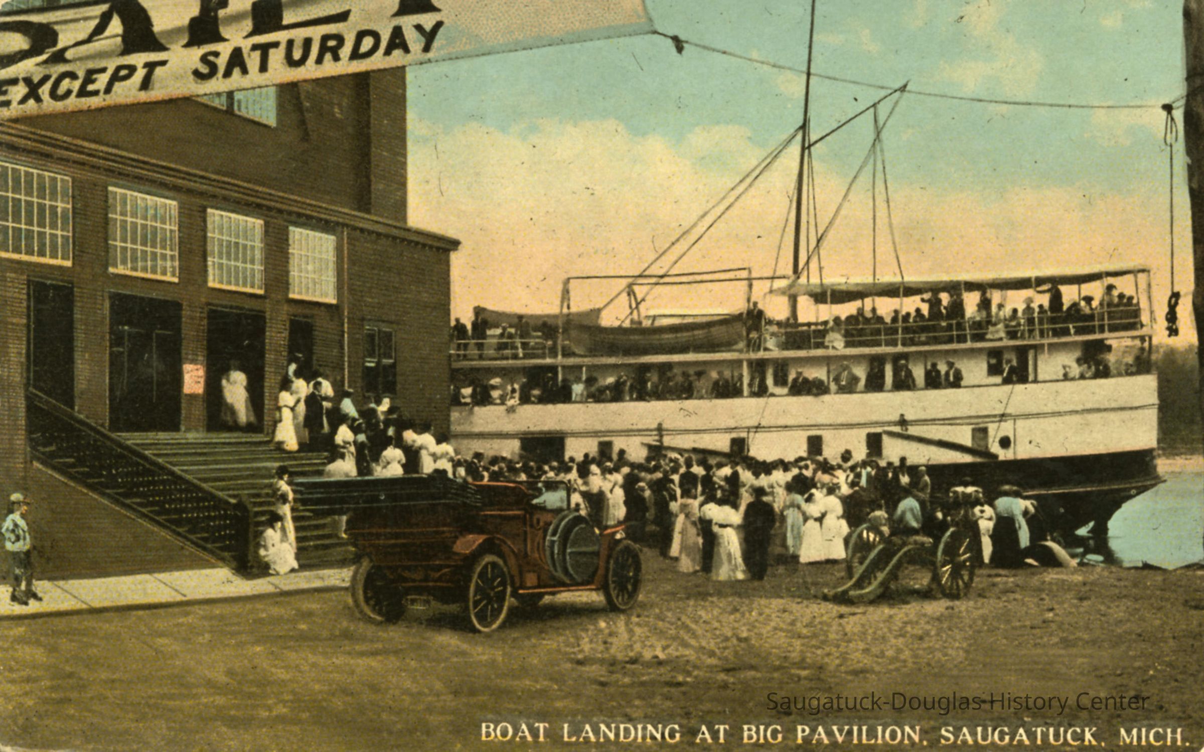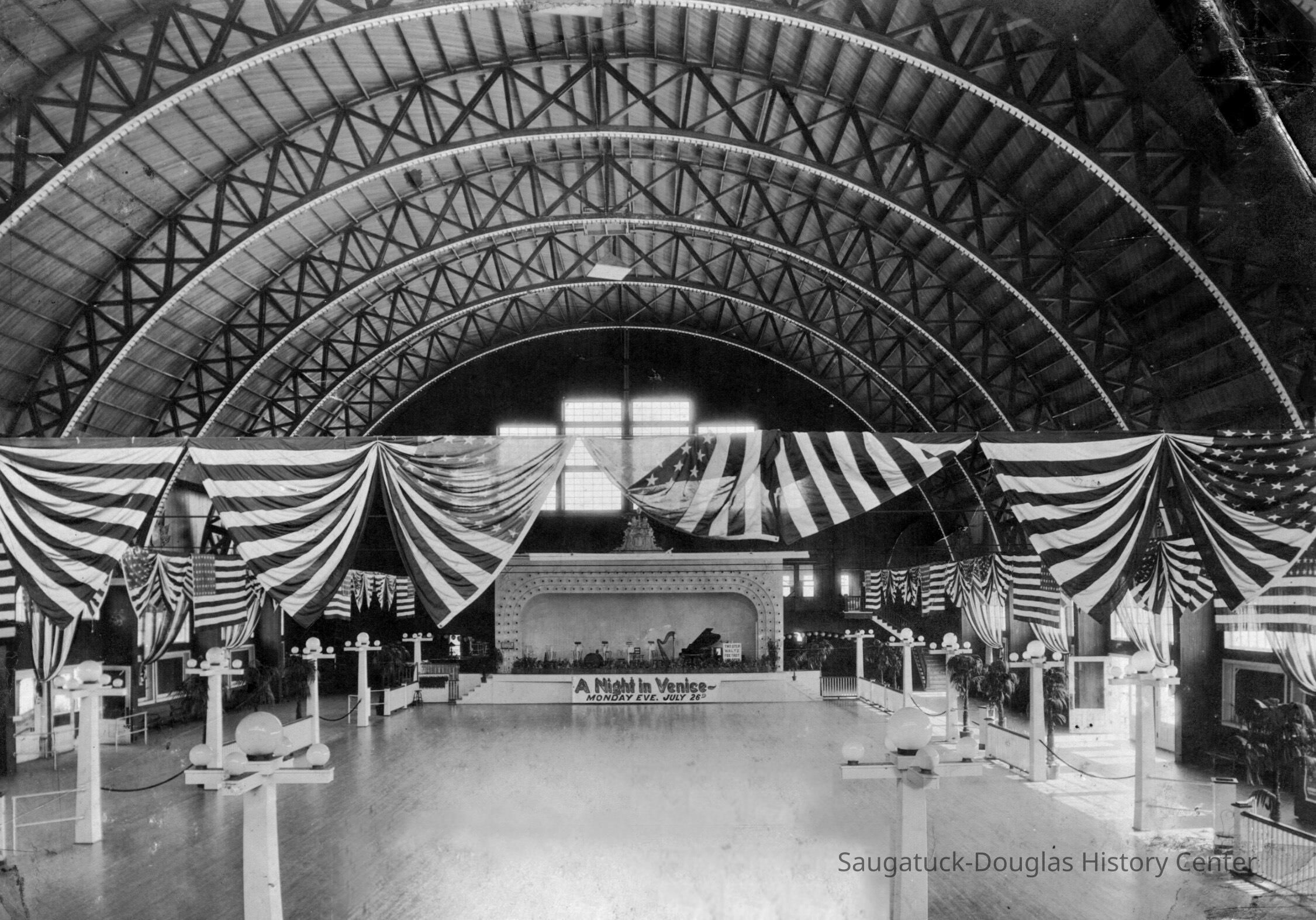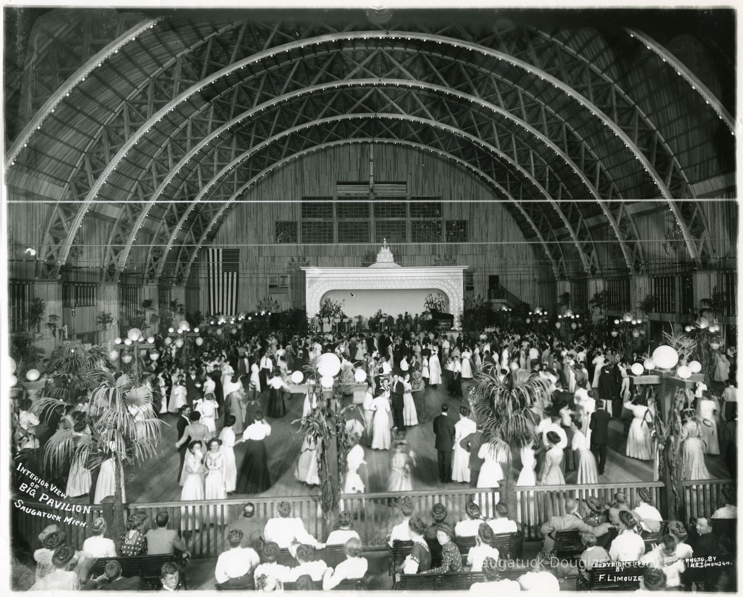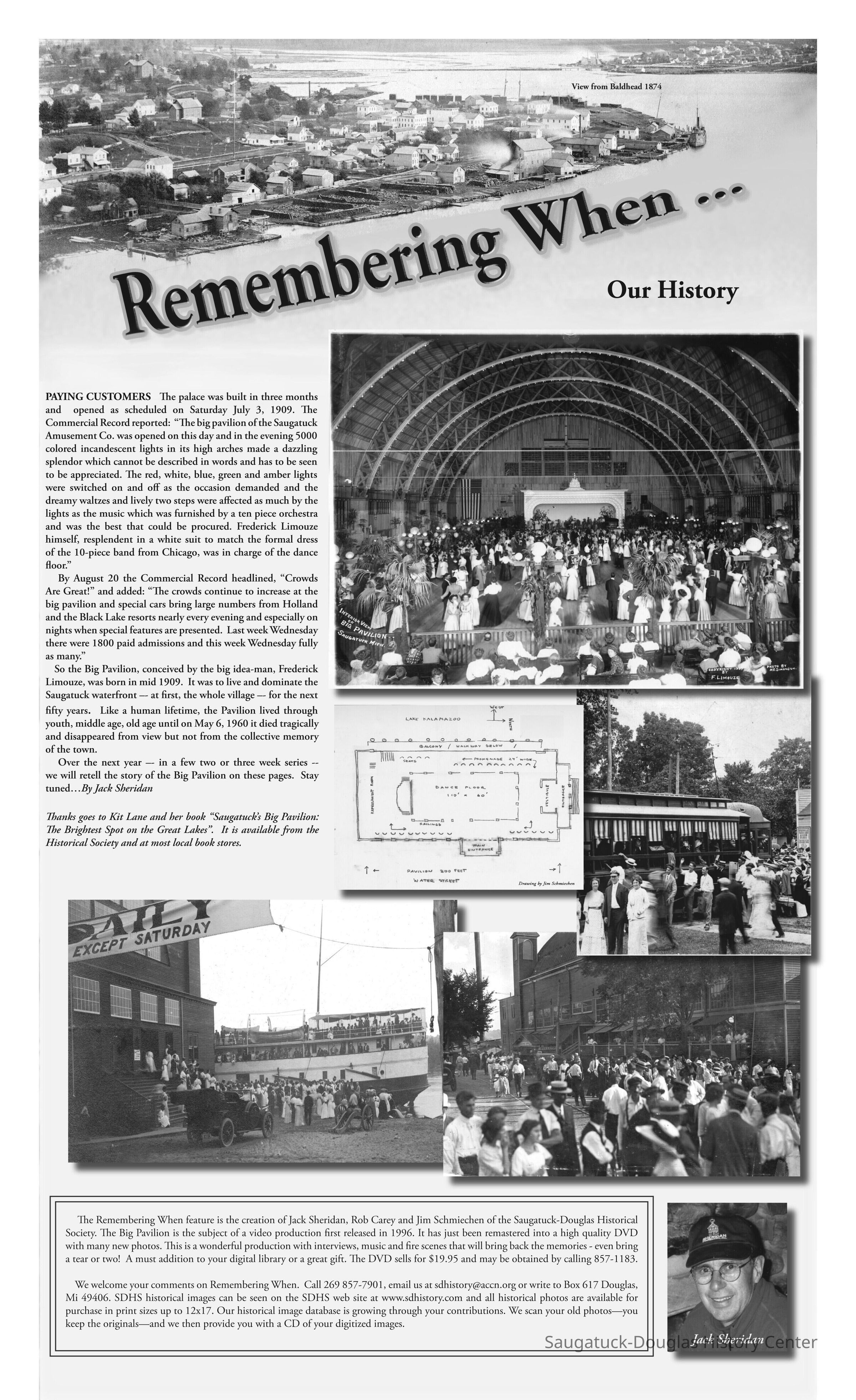 PAYING CUSTOMERS The palace was built in three months and opened as scheduled on Saturday July 3, 1909. The Commercial Record reported: “The big pavilion of the Saugatuck Amusement Co. was opened on this day and in the evening 5000 colored incandescent lights in its high arches made a dazzling splendor which cannot be described in words and has to be seen to be appreciated. The red, white, blue, green and amber lights were switched on and off as the occasion demanded and the dreamy waltzes and lively two steps were affected as much by the lights as the music which was furnished by a ten piece orchestra and was the best that could be procured. Frederick Limouze himself, resplendent in a white suit to match the formal dress of the 10-piece band from Chicago, was in charge of the dance floor.” By August 20 the Commercial Record headlined, “Crowds Are Great!” and added: “The crowds continue to increase at the big pavilion and special cars bring large numbers from Holland and the Black Lake resorts nearly every evening and especially on nights when special features are presented. Last week Wednesday there were 1800 paid admissions and this week Wednesday fully as many.” So the Big Pavilion, conceived by the big idea-man, Frederick Limouze, was born in mid 1909. It was to live and dominate the Saugatuck waterfront –- at first, the whole village –- for the next fifty years. Like a human lifetime, the Pavilion lived through youth, middle age, old age until on May 6, 1960 it died tragically and disappeared from view but not from the collective memory of the town. Over the next year –- in a few two or three week series -- we will retell the story of the Big Pavilion on these pages. Stay tuned…By Jack Sheridan Thanks goes to Kit Lane and her book “Saugatuck’s Big Pavilion: The Brightest Spot on the Great Lakes”. It is available from the Historical Society and at most local book stores.
