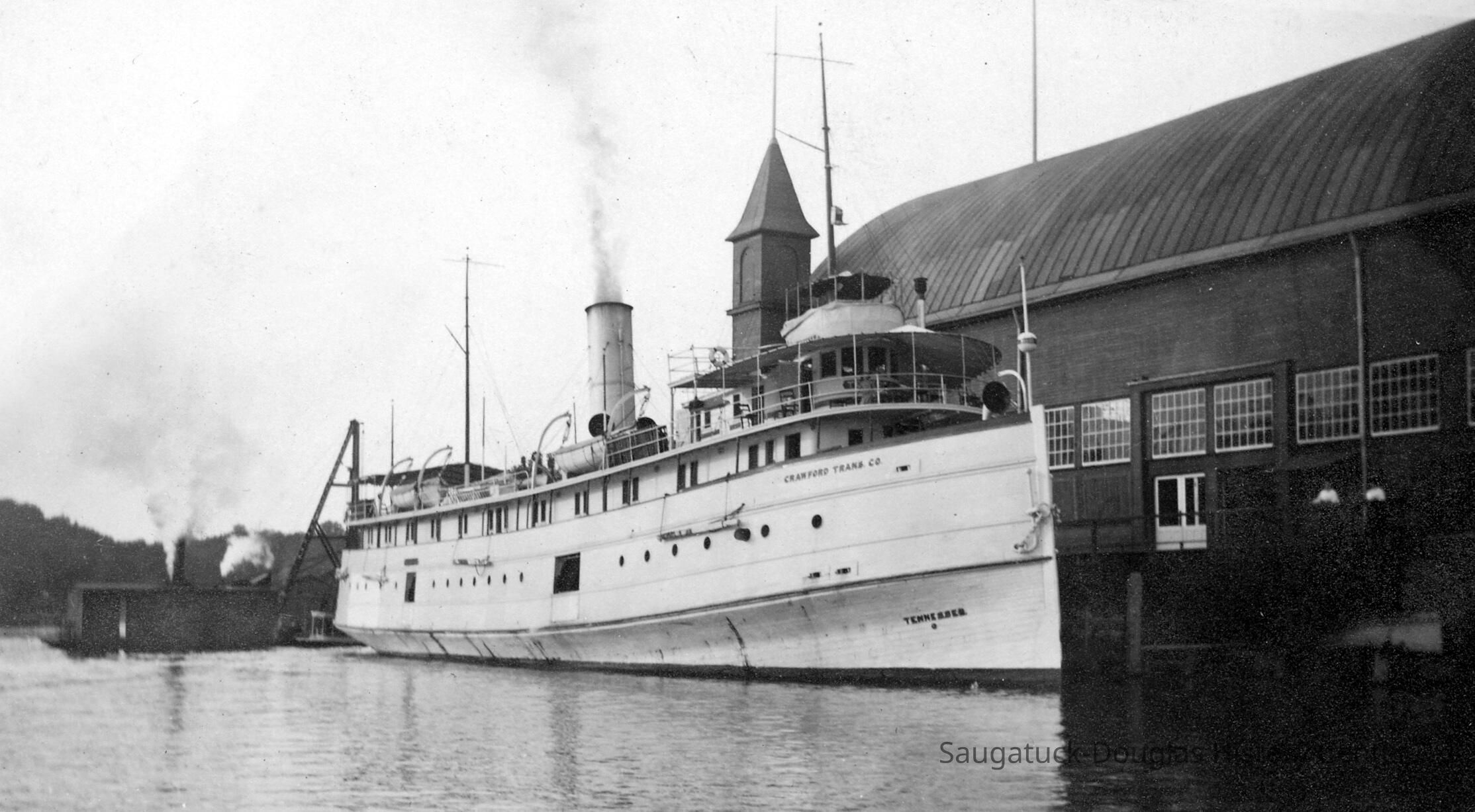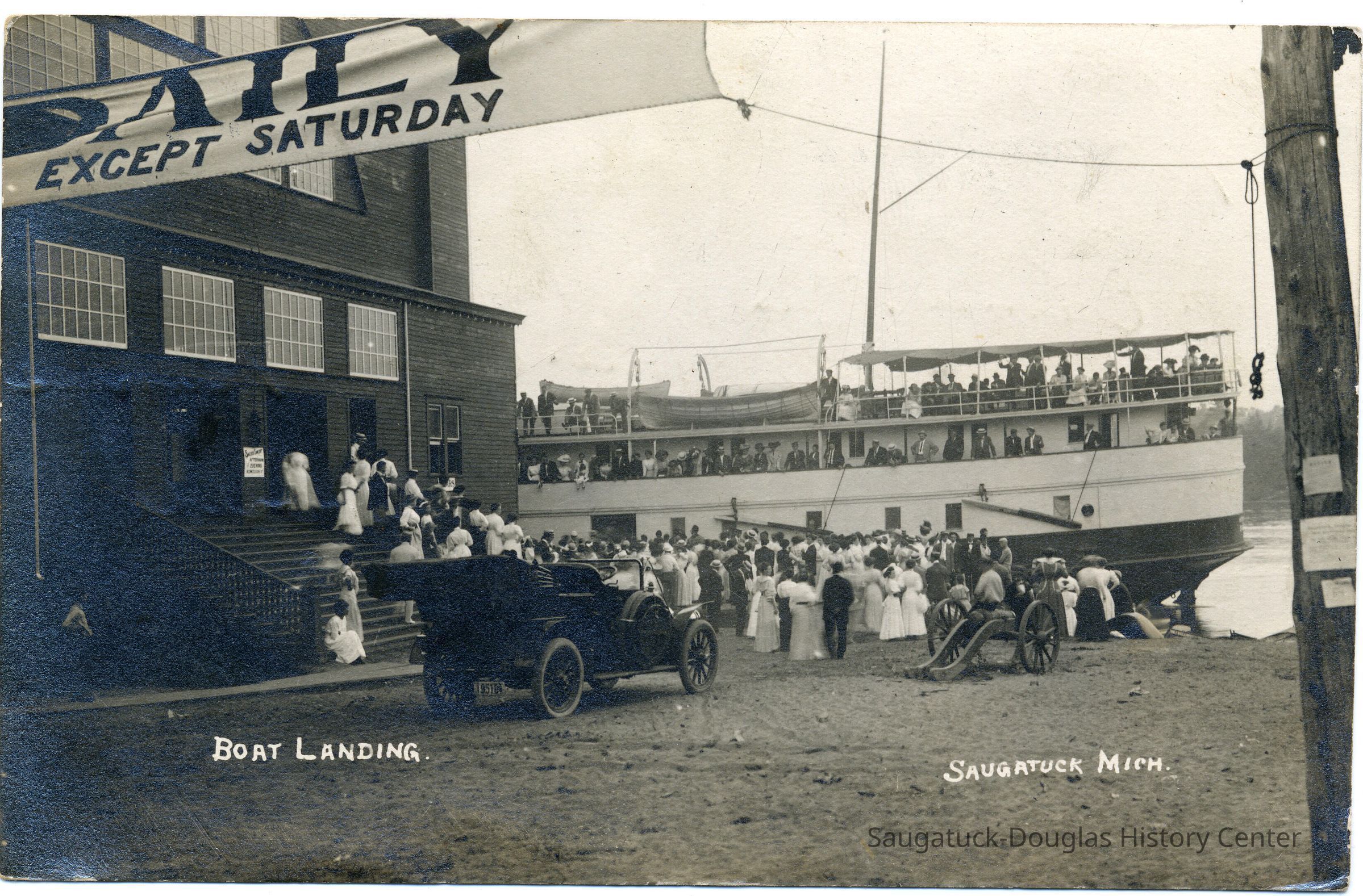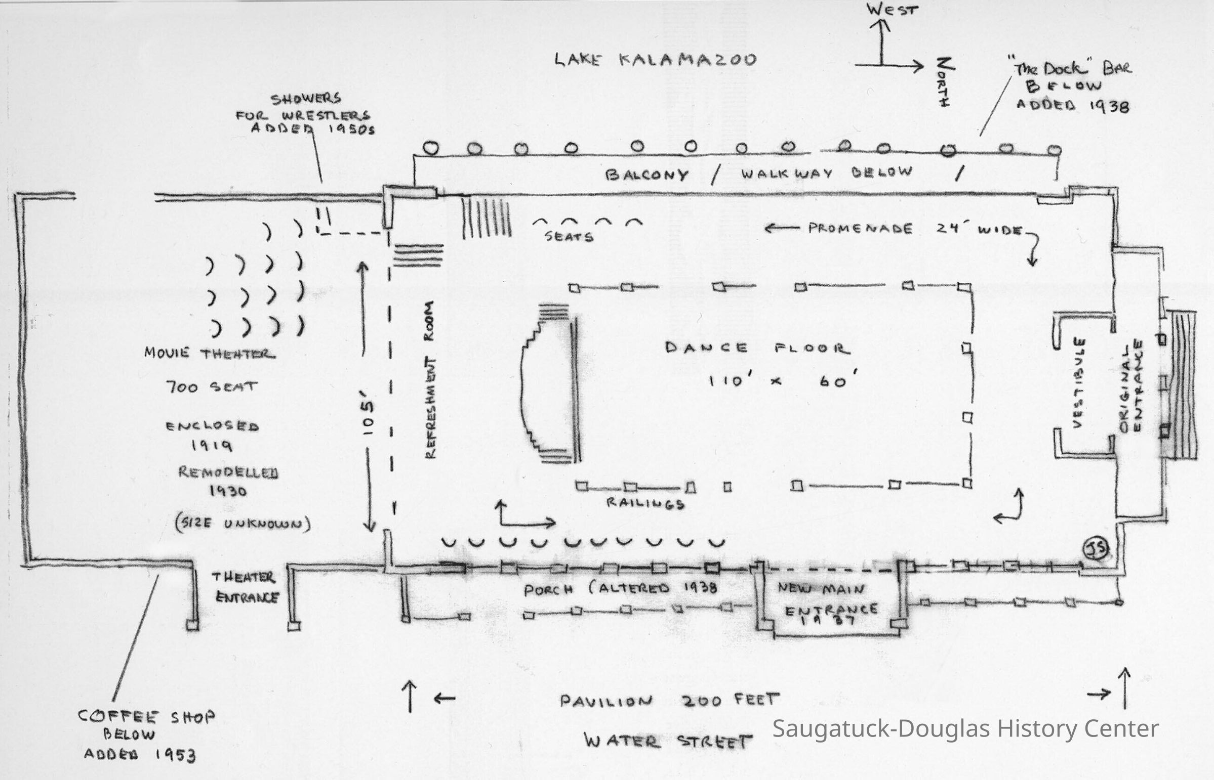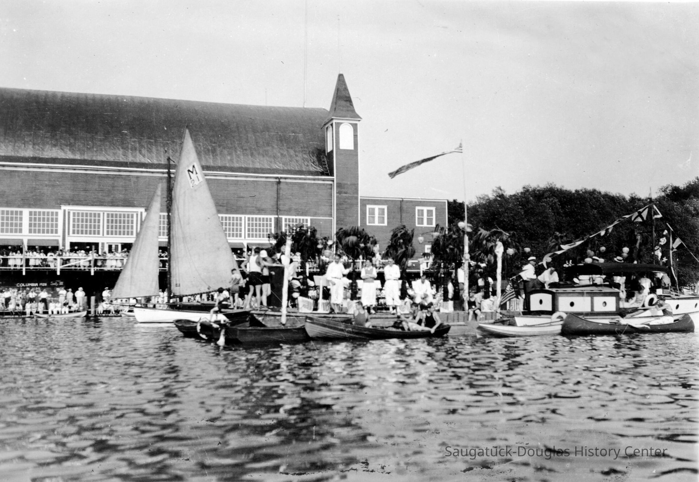 PAYING CUSTOMERS The palace was built in three months and opened as scheduled on Saturday July 3, 1909. The Commercial Record reported: “The big pavilion of the Saugatuck Amusement Co. was opened on this day and in the evening 5000 colored incandescent lights in its high arches made a dazzling splendor which cannot be described in words and has to be seen to be appreciated. The red, white, blue, green and amber lights were switched on and off as the occasion demanded and the dreamy waltzes and lively two steps were affected as much by the lights as the music which was furnished by a ten piece orchestra and was the best that could be procured. Frederick Limouze himself, resplendent in a white suit to match the formal dress of the 10-piece band from Chicago, was in charge of the dance floor.” By August 20 the Commercial Record headlined, “Crowds Are Great!” and added: “The crowds continue to increase at the big pavilion and special cars bring large numbers from Holland and the Black Lake resorts nearly every evening and especially on nights when special features are presented. Last week Wednesday there were 1800 paid admissions and this week Wednesday fully as many.” So the Big Pavilion, conceived by the big idea-man, Frederick Limouze, was born in mid 1909. It was to live and dominate the Saugatuck waterfront –- at first, the whole village –- for the next fifty years. Like a human lifetime, the Pavilion lived through youth, middle age, old age until on May 6, 1960 it died tragically and disappeared from view but not from the collective memory of the town. Over the next year –- in a few two or three week series -- we will retell the story of the Big Pavilion on these pages. Stay tuned…By Jack Sheridan Thanks goes to Kit Lane and her book “Saugatuck’s Big Pavilion: The Brightest Spot on the Great Lakes”. It is available from the Historical Society and at most local book stores.
