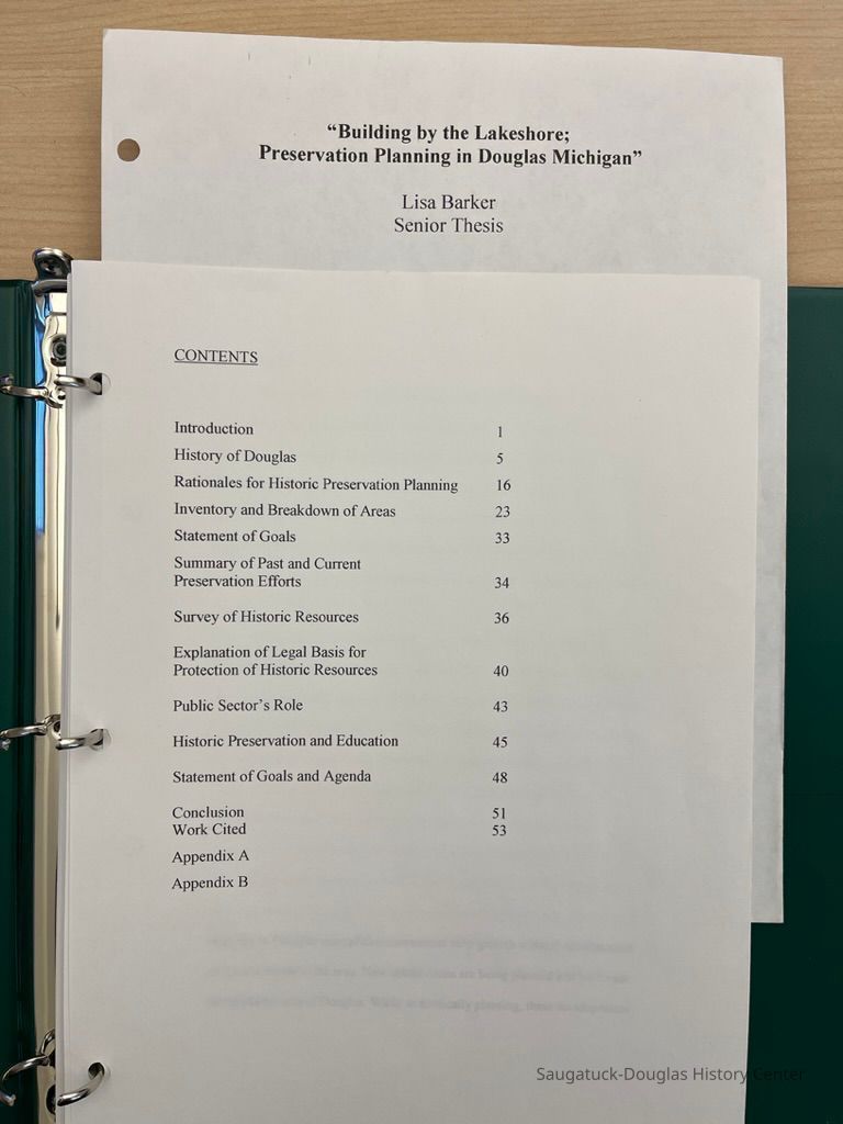 The thesis argues the reason for historic preservation in Douglas MI. "The purpose of this document is to provide a plan for preserving the unique historical and natural character of the small rural village of Douglas, Michigan. The village occupies a naturally beautiful location in western Michigan. Lake Michigan, the Kalamazoo River, Lake Kalamazoo and agricultural lands bound the village. The location of Douglas has contributed to the growth of mills, fruit orchards and associated industries, tourism and an art movement which included art schools."