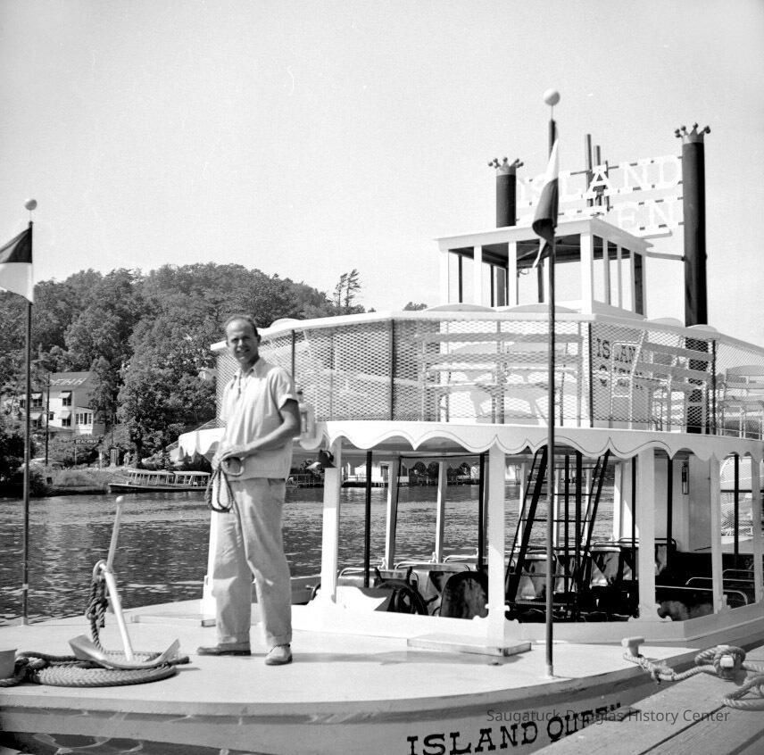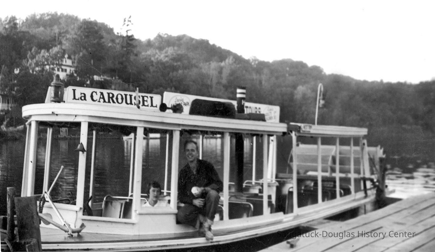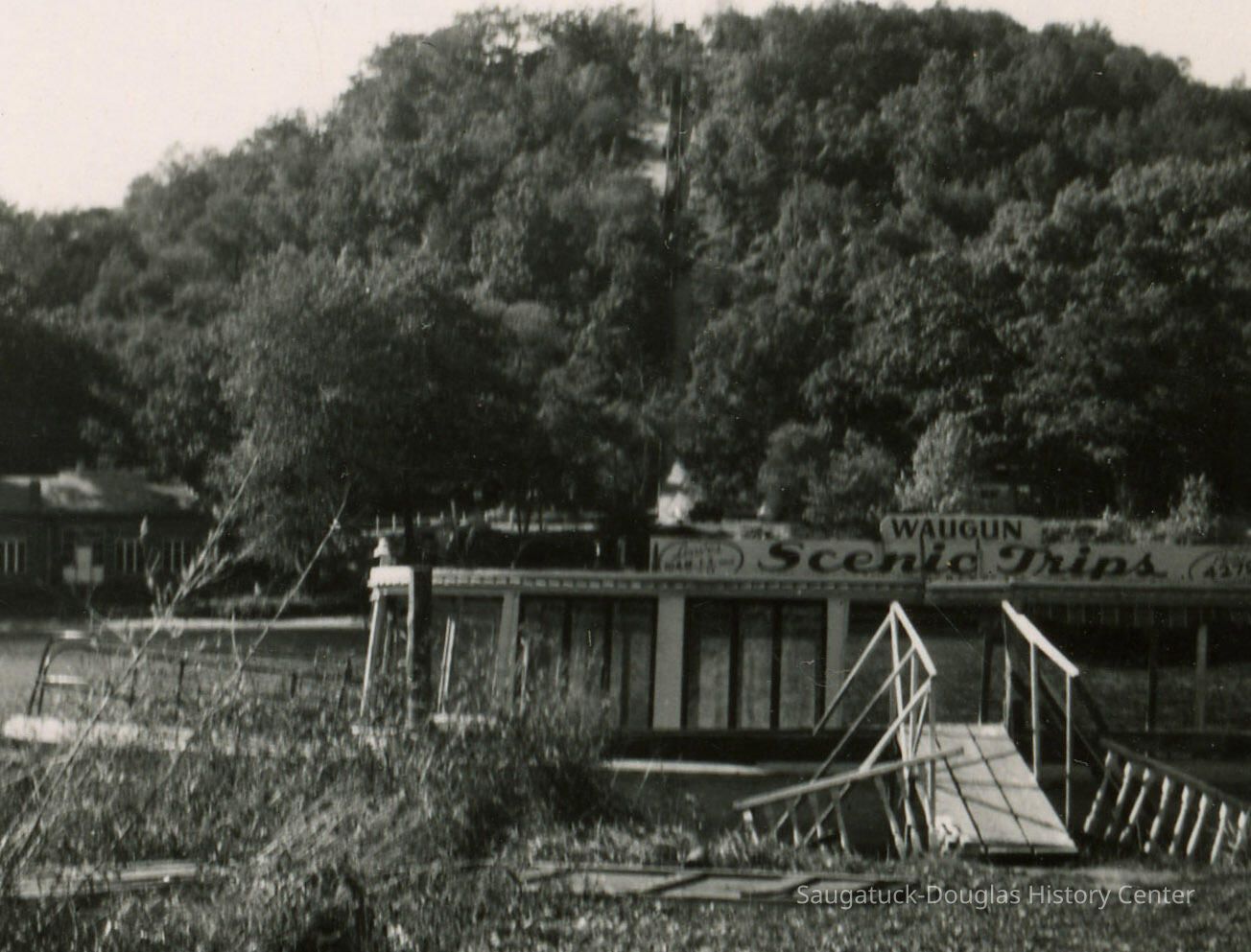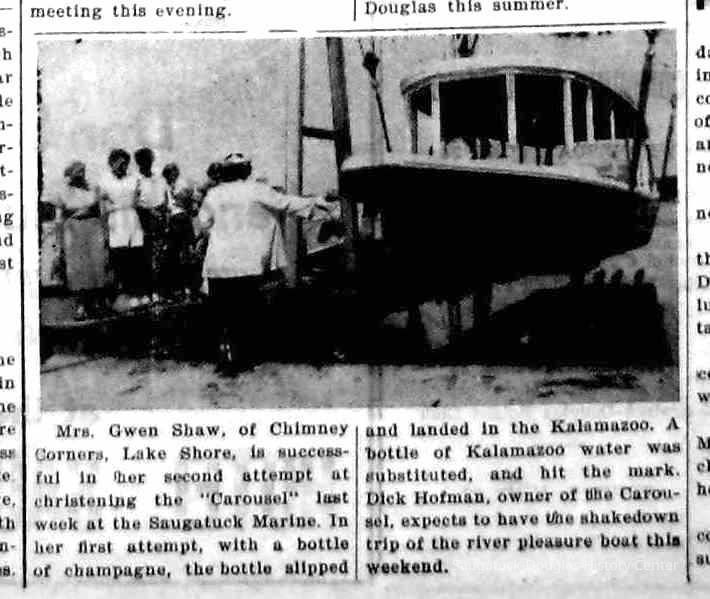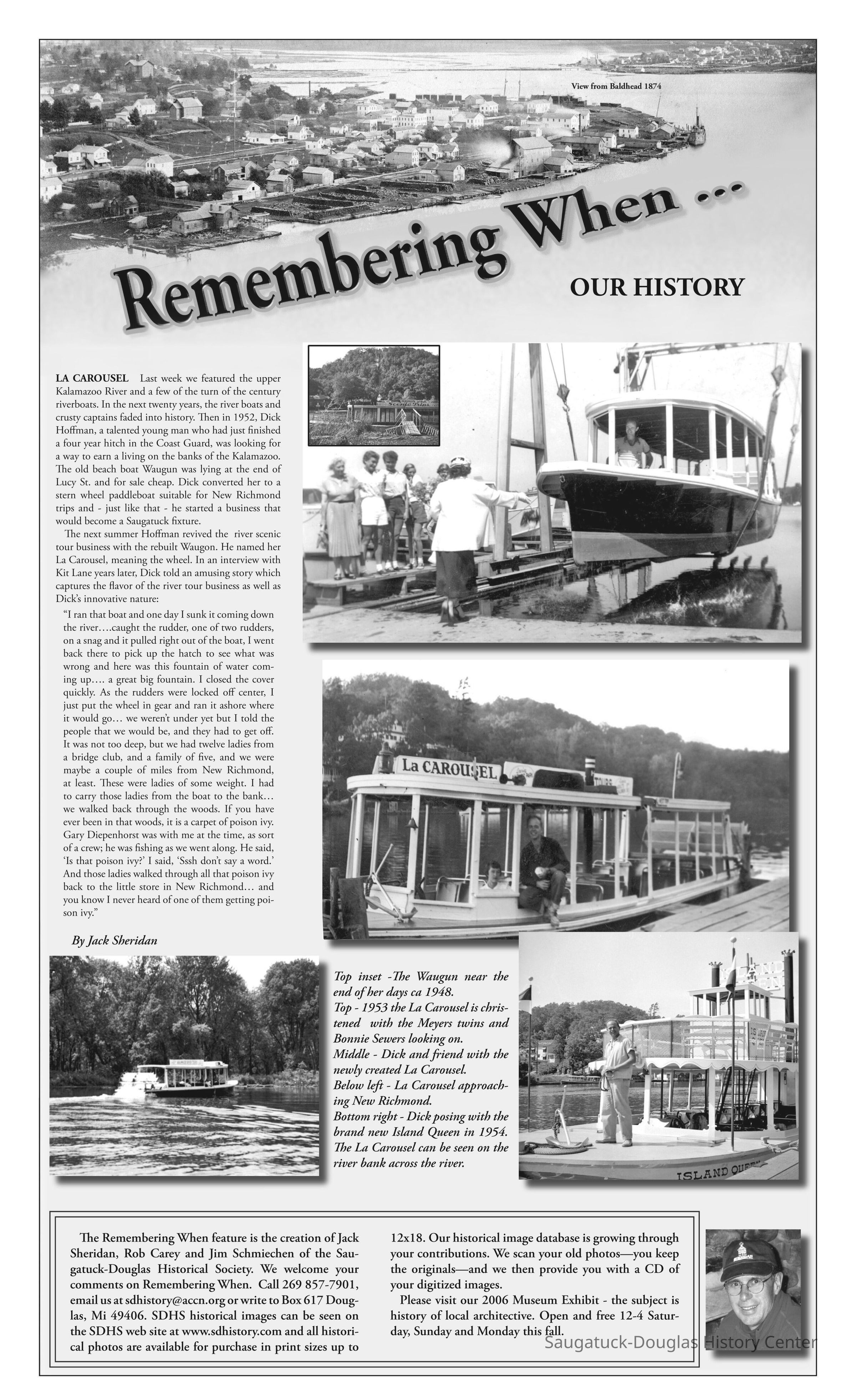 LA CAROUSEL Last week we featured the upper Kalamazoo River and a few of the turn of the century riverboats. In the next twenty years, the river boats and crusty captains faded into history. Then in 1952, Dick Hoffman, a talented young man who had just finished a four year hitch in the Coast Guard, was looking for a way to earn a living on the banks of the Kalamazoo. The old beach boat Waugun was lying at the end of Lucy St. and for sale cheap. Dick converted her to a stern wheel paddleboat suitable for New Richmond trips and - just like that - he started a business that would become a Saugatuck fixture. The next summer Hoffman revived the river scenic tour business with the rebuilt Waugon. He named her La Carousel, meaning the wheel. In an interview with Kit Lane years later, Dick told an amusing story which captures the flavor of the river tour business as well as Dick’s innovative nature: “I ran that boat and one day I sunk it coming down the river….caught the rudder, one of two rudders, on a snag and it pulled right out of the boat, I went back there to pick up the hatch to see what was wrong and here was this fountain of water coming up…. a great big fountain. I closed the cover quickly. As the rudders were locked off center, I just put the wheel in gear and ran it ashore where it would go… we weren’t under yet but I told the people that we would be, and they had to get off. It was not too deep, but we had twelve ladies from a bridge club, and a family of five, and we were maybe a couple of miles from New Richmond, at least. These were ladies of some weight. I had to carry those ladies from the boat to the bank… we walked back through the woods. If you have ever been in that woods, it is a carpet of poison ivy. Gary Diepenhorst was with me at the time, as sort of a crew; he was fishing as we went along. He said, ‘Is that poison ivy?’ I said, ‘Sssh don’t say a word.’ And those ladies walked through all that poison ivy back to the little store in New Richmond… and you know I never heard of one of them getting poison ivy.” By Jack Sheridan