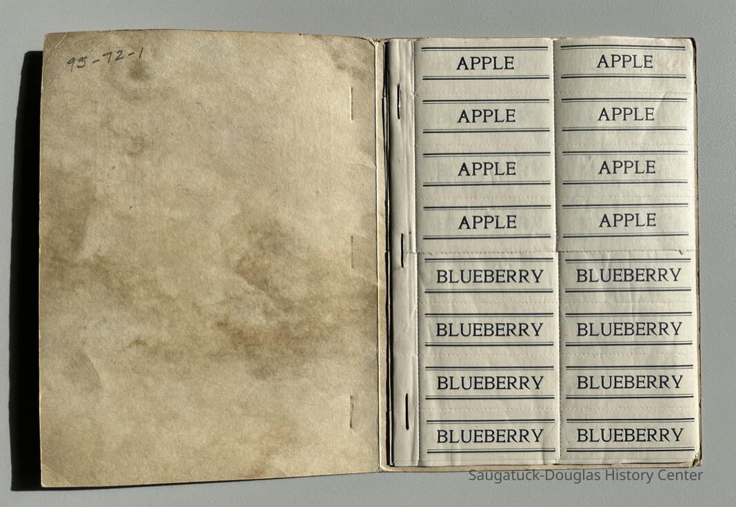 Booklet of glue-backed stickers for labeling jars of home canned products like Apple, Blueberry, Pear, Pickles, Peach, Quince, Strawberry and blank.