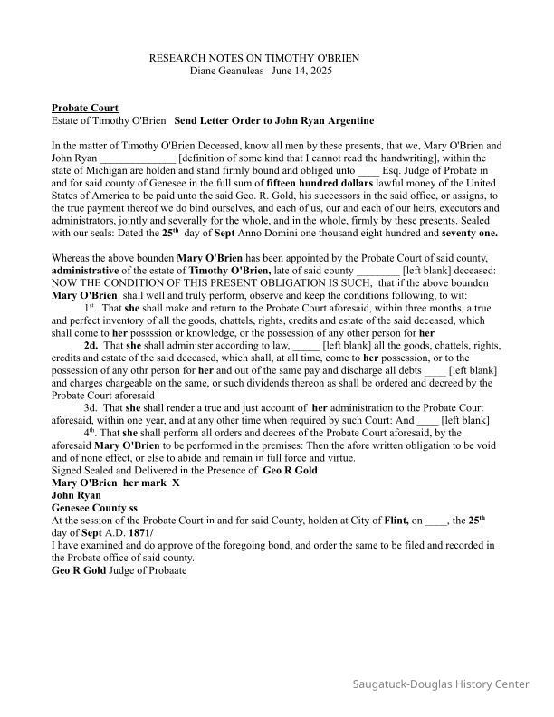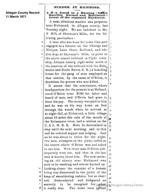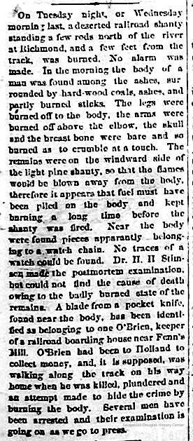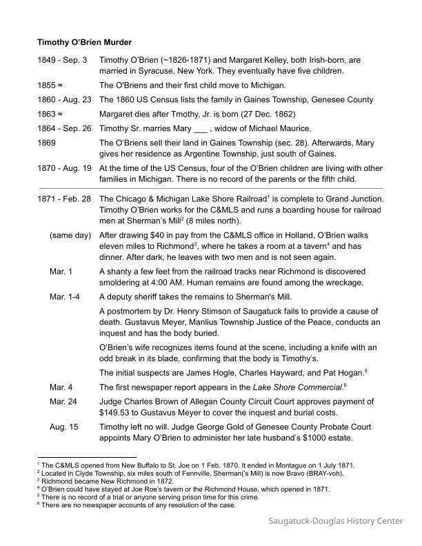 Research summaries and newspaper clippings about the murder of Timothy O'Brien in (New) Richmond in 1871.