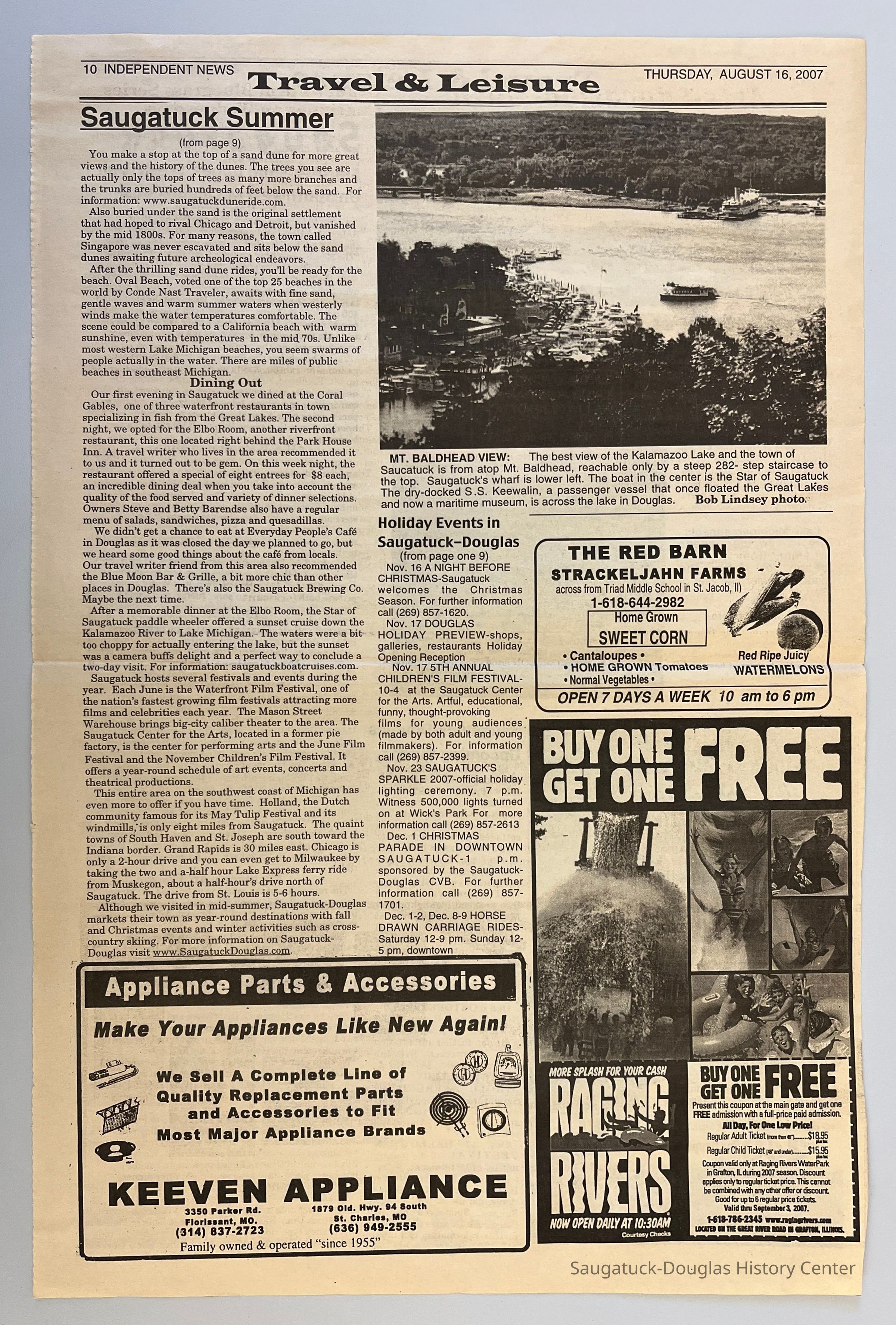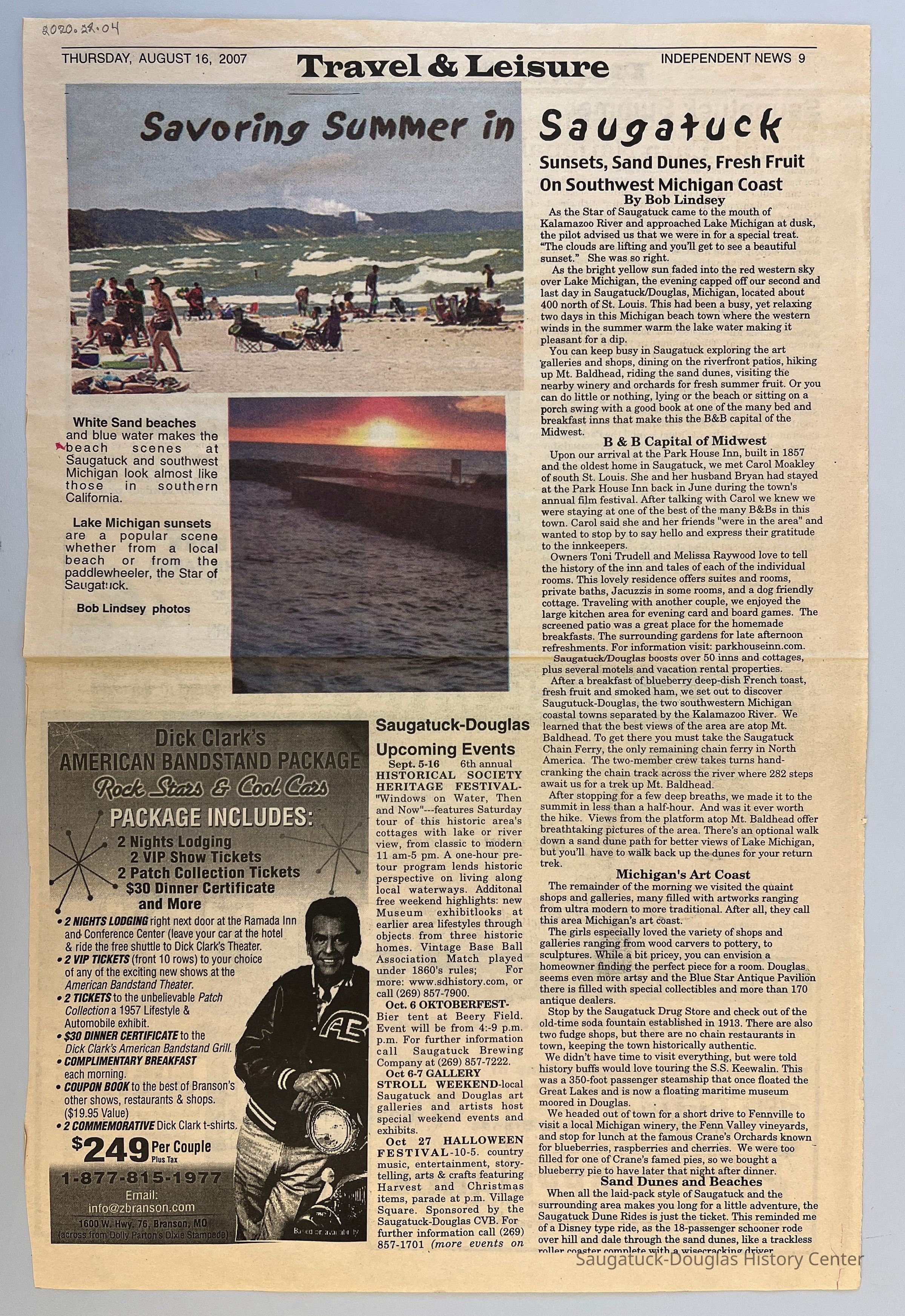 Two page article about Saugatuck from the Independent News, August 16, 2007. "Sunsets, Sand Dunes, Fresh Fruit on the Southwest Michigan Coast by Bob Lindsey.