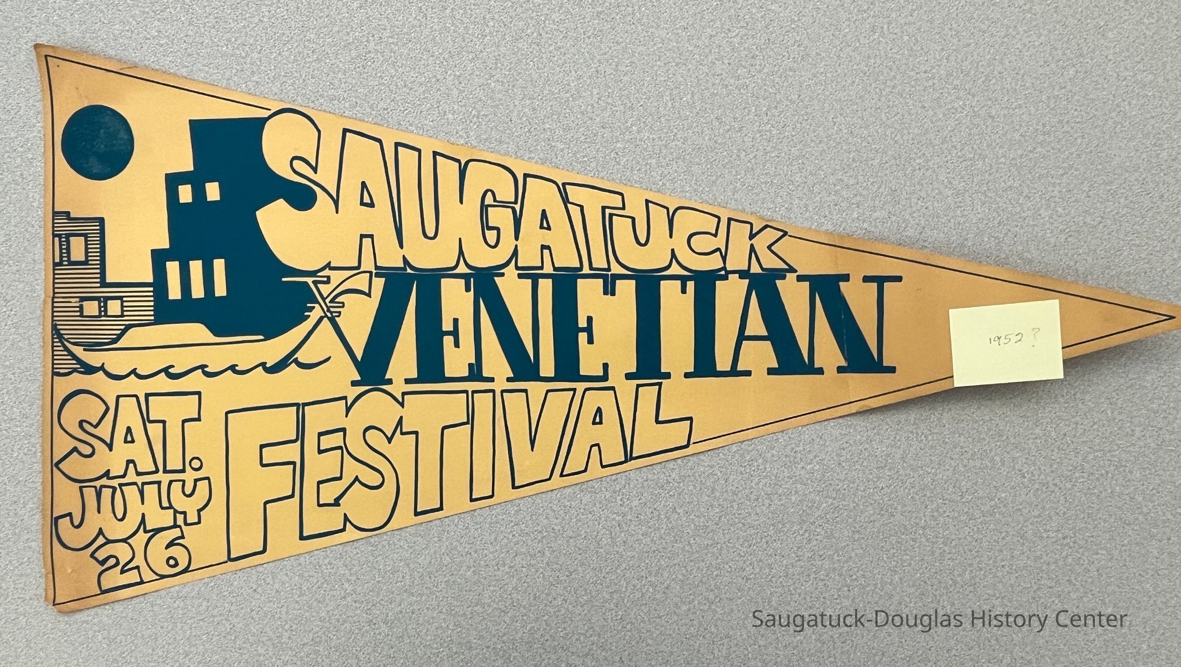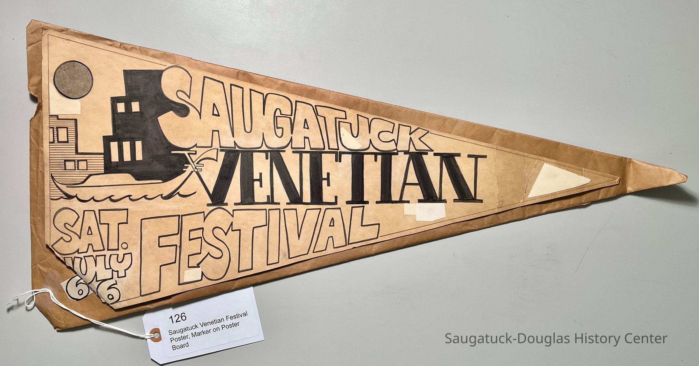 2023 auction description: Undated (possibly 1965) Poster Original (used for printing duplication) for the Saugatuck Venetian Festival (pennant-shaped). Unsigned. Lower bottom left corner missing. Part of a Saugatuck/Douglas Art Collection.