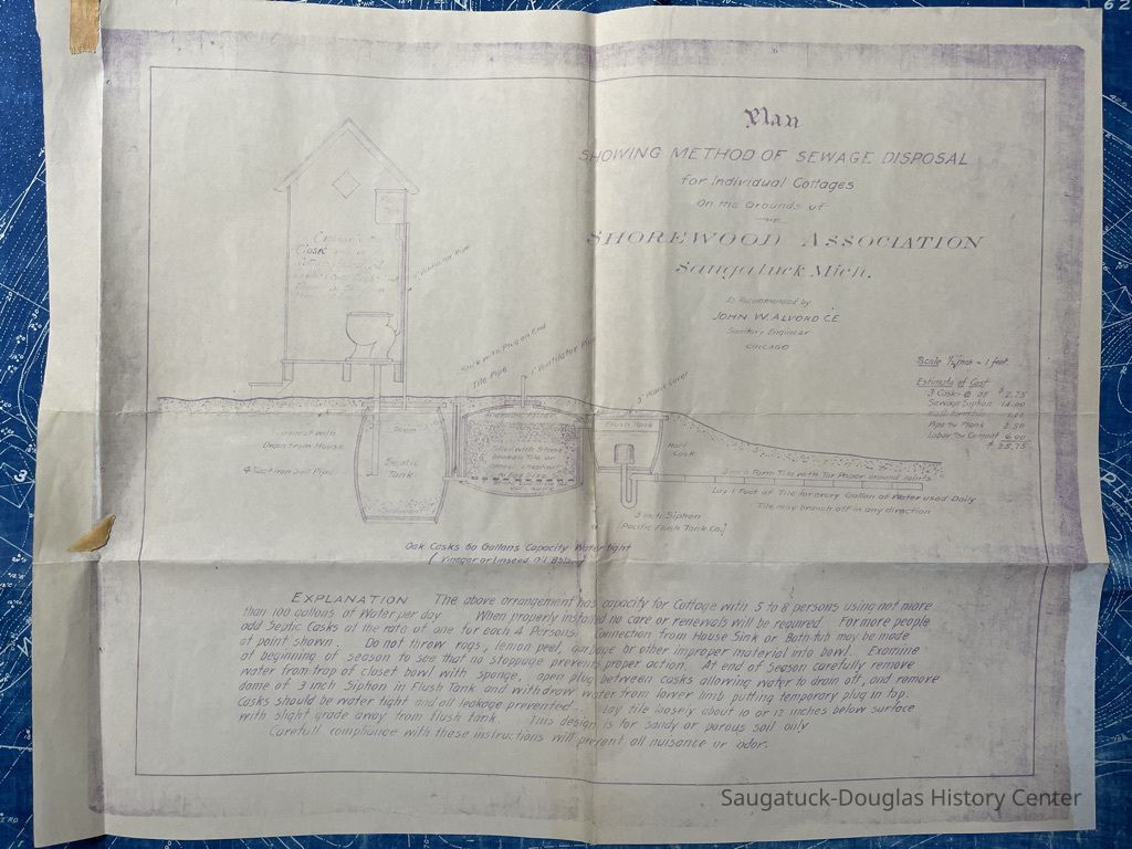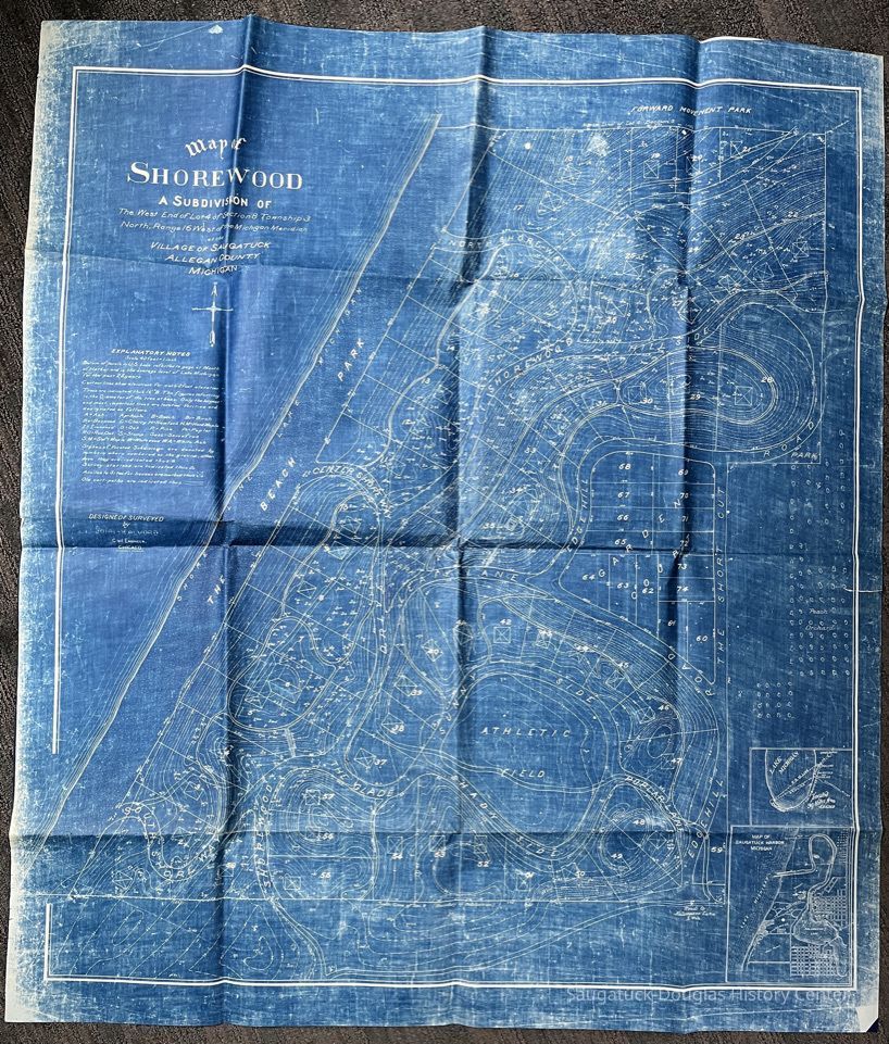 Blue print map of Shorewood subdivision with additional sewage disposal plan. The large, folded blueprint shows the Lake Michigan shoreline (the Beach Park), streets, lots with locations of cottages indicated, garden courts, an athletic field, orchards, the location of Forward Movement Park and inset maps of distances from Chicago and the Saugatuck Harbor.