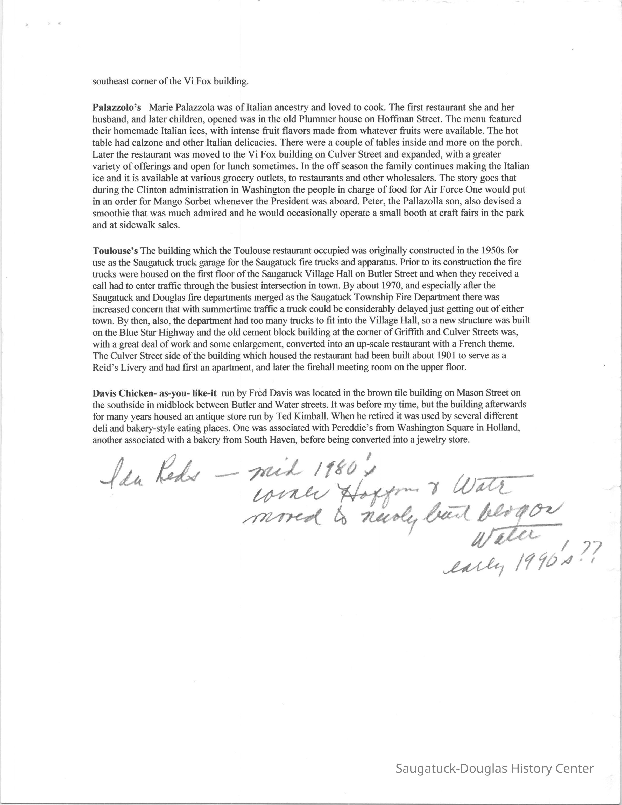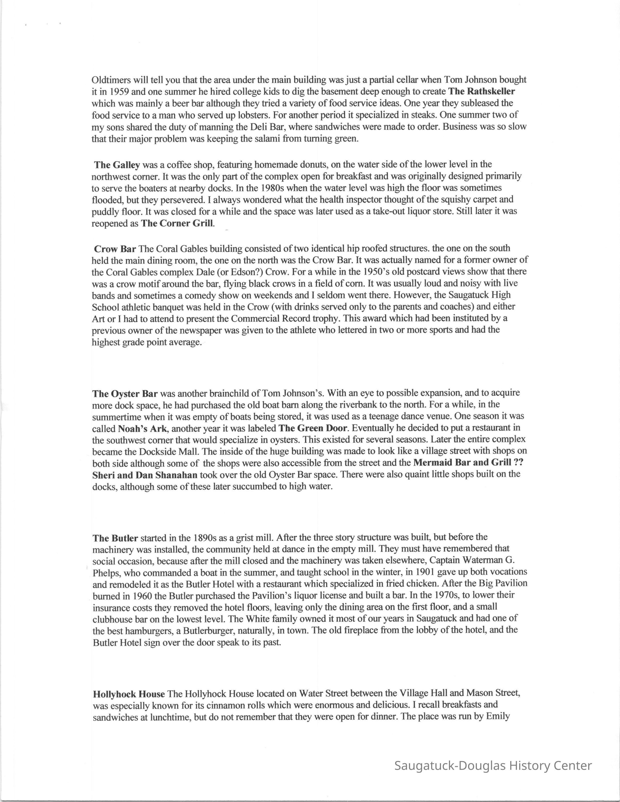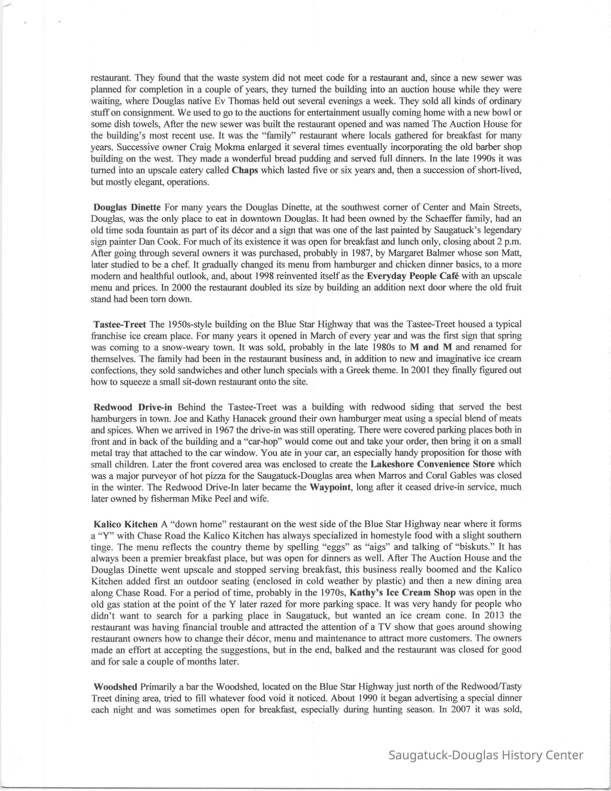 OCR scan of the main text: Restaurants Places to eat are important to the tourist, and, like most of the other businesses, there is a high turnover although a handful of restaurants manage to stay in business for years - usually until they bum down. Here is our listing of places we remember eating. Douglas Eateries Tara The popular restaurant that had been started by Charley Koning in the old Spencer house on the hill near the old schoolhouse in Douglas. It was one of the first businesses opened on the newly built Blue Star Memorial Highway in 1936. By the time we arrived it was owned by Fred Koning and still had the “Indian” theme that had been part of a redo by Dannie Hunn, noted interior decorator who had a home at Pier Cove. The Indians on the walls and menus were so stylized that they had a vaguely Egyptian look to them. The walls in the main dining room had several Carl Hoerman paintings of the Grand Canyon and other western scenes. I don’t remember much about the food except that it was expensive enough that we only ate there on special occasions. It had been sold when it burned about 1974 in a slow moving fire that started in the basement somewhere. A couple of years later it was replaced by a similar looking building and went through a succession of owners, at the end being renamed the Avalon. Bought by developers, the building was boarded up for several years before being razed in the summer of 2001 to make way for a condominium development. The Auction House One of the oldest buildings in Douglas at the northwest comer of Center and Main Streets has served the town for more than 100 years. It has been a gallery, insurance office, upholstery shop, tile store, meat market and grocery store. In the 1970s it was purchased by the Van Meters with the idea of beginning a restaurant. They found that the waste system did not meet code for a restaurant and, since a new sewer was planned for completion in a couple of years, they turned the building into an auction house while they were waiting, where Douglas native Ev Thomas held out several evenings a week. They sold all kinds of ordinary stuff on consignment. We used to go to the auctions for entertainment usually coming home with a new bowl or some dish towels, After the new sewer was built the restaurant opened and was named The Auction House for the building’s most recent use. It was the “family” restaurant where locals gathered for breakfast for many years. Successive owner Craig Mokma enlarged it several times eventually incorporating the old barber shop building on the west. They made a wonderful bread pudding and served full dinners. In the late 1990s it was turned into an upscale eatery called Chaps which lasted five or six years and, then a succession of short-lived, but mostly elegant, operations. Douglas Dinette For many years the Douglas Dinette, at the southwest corner of Center and Main Streets, Douglas, was the only place to eat in downtown Douglas. It had been owned by the Schaeffer family, had an old time soda fountain as part of its decor and a sign that was one of the last painted by Saugatuck’s legendary sign painter Dan Cook. For much of its existence it was open for breakfast and lunch only, closing about 2 p.m. After going through several owners it was purchased, probably in 1987, by Margaret Balmer whose son Matt, later studied to be a chef. It gradually changed its menu from hamburger and chicken dinner basics, to a more modem and healthful outlook, and, about 1998 reinvented itself as the Everyday People Cafe with an upscale menu and prices. In 2000 the restaurant doubled its size by building an addition next door where the old fruit stand had been torn down. Tastee-Treet The 1950s-style building on the Blue Star Highway that was the Tastee-Treet housed a typical franchise ice cream place. For many years it opened in March of every year and was the first sign that spring was coming to a snow-weary town. It was sold, probably in the late 1980s to M and M and renamed for themselves. The family had been in the restaurant business and, in addition to new and imaginative ice cream confections, they sold sandwiches and other lunch specials with a Greek theme. In 2001 they finally figured out how to squeeze a small sit-down restaurant onto the site. Redwood Drive-in Behind the Tastee-Treet was a building with redwood siding that served the best hamburgers in town. Joe and Kathy Hanacek ground their own hamburger meat using a special blend of meats and spices. When we arrived in 1967 the drive-in was still operating. There were covered parking places both in front and in back of the building and a “car-hop” would come out and take your order, then bring it on a small metal tray that attached to the car window. You ate in your car, an especially handy proposition for those with small children. Later the front covered area was enclosed to create the Lakeshore Convenience Store which was a major purveyor of hot pizza for the Saugatuck-Douglas area when Marros and Coral Gables was closed in the winter. The Redwood Drive-In later became the Waypoint, long after it ceased drive-in service, much later owned by fisherman Mike Peel and wife. Kalico Kitchen A “down home” restaurant on the west side of the Blue Star Highway near where it forms a “Y” with Chase Road the Kalico Kitchen has always specialized in homestyle food with a slight southern tinge. The menu reflects the country theme by spelling “eggs” as “aigs” and talking of “biskuts.” It has always been a premier breakfast place, but was open for dinners as well. After The Auction House and the Douglas Dinette went upscale and stopped serving breakfast, this business really boomed and the Kalico Kitchen added first an outdoor seating (enclosed in cold weather by plastic) and then a new dining area along Chase Road. For a period of time, probably in the 1970s, Kathy’s Ice Cream Shop was open in the old gas station at the point of th