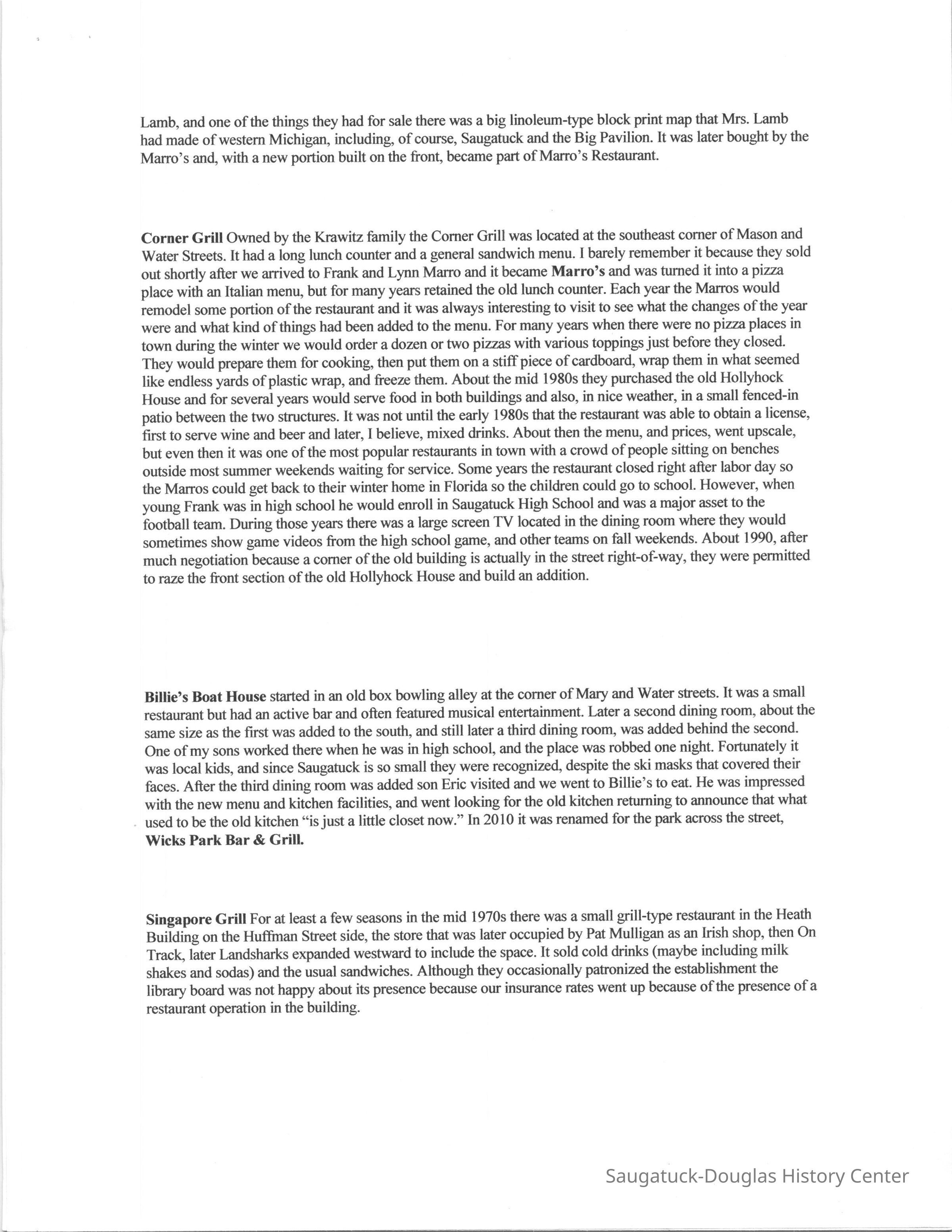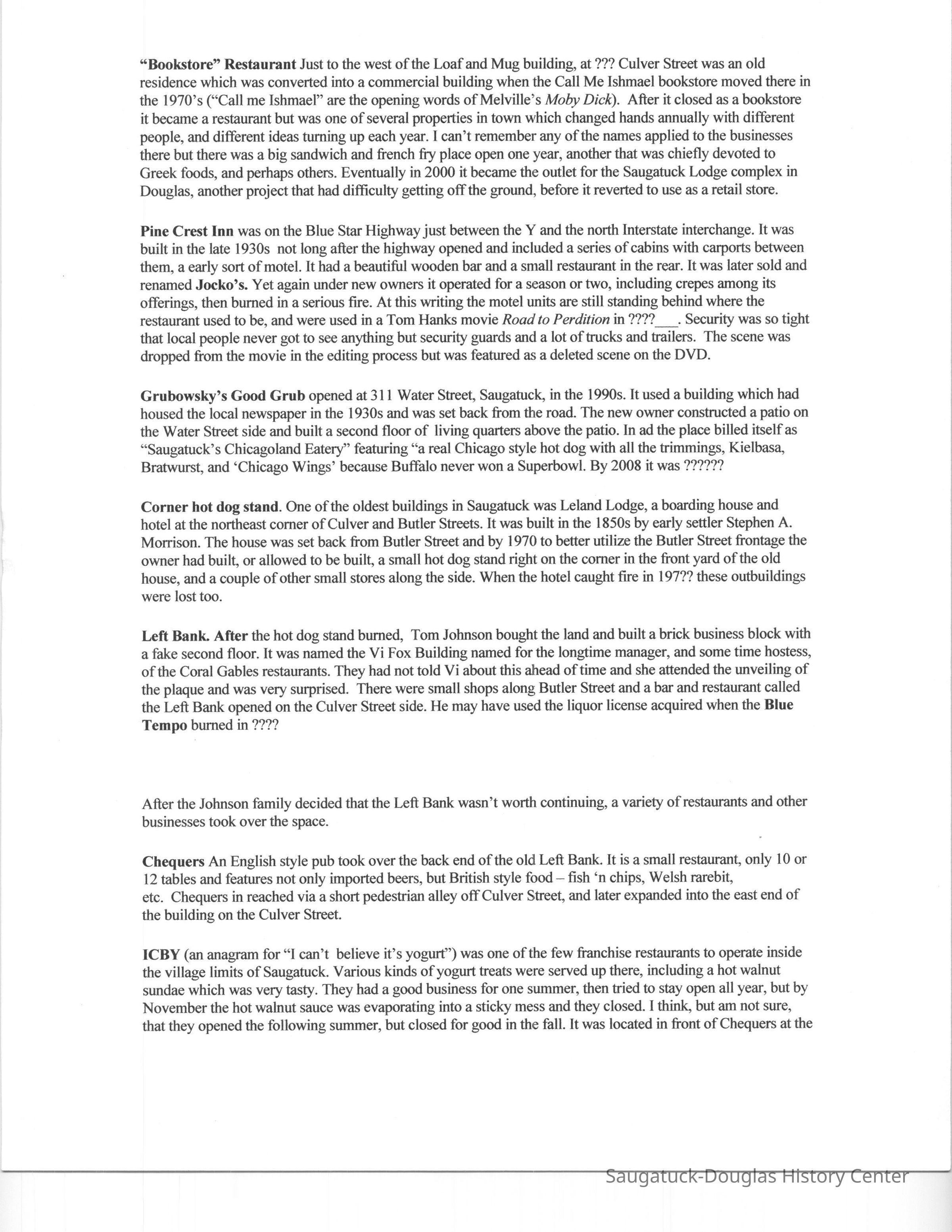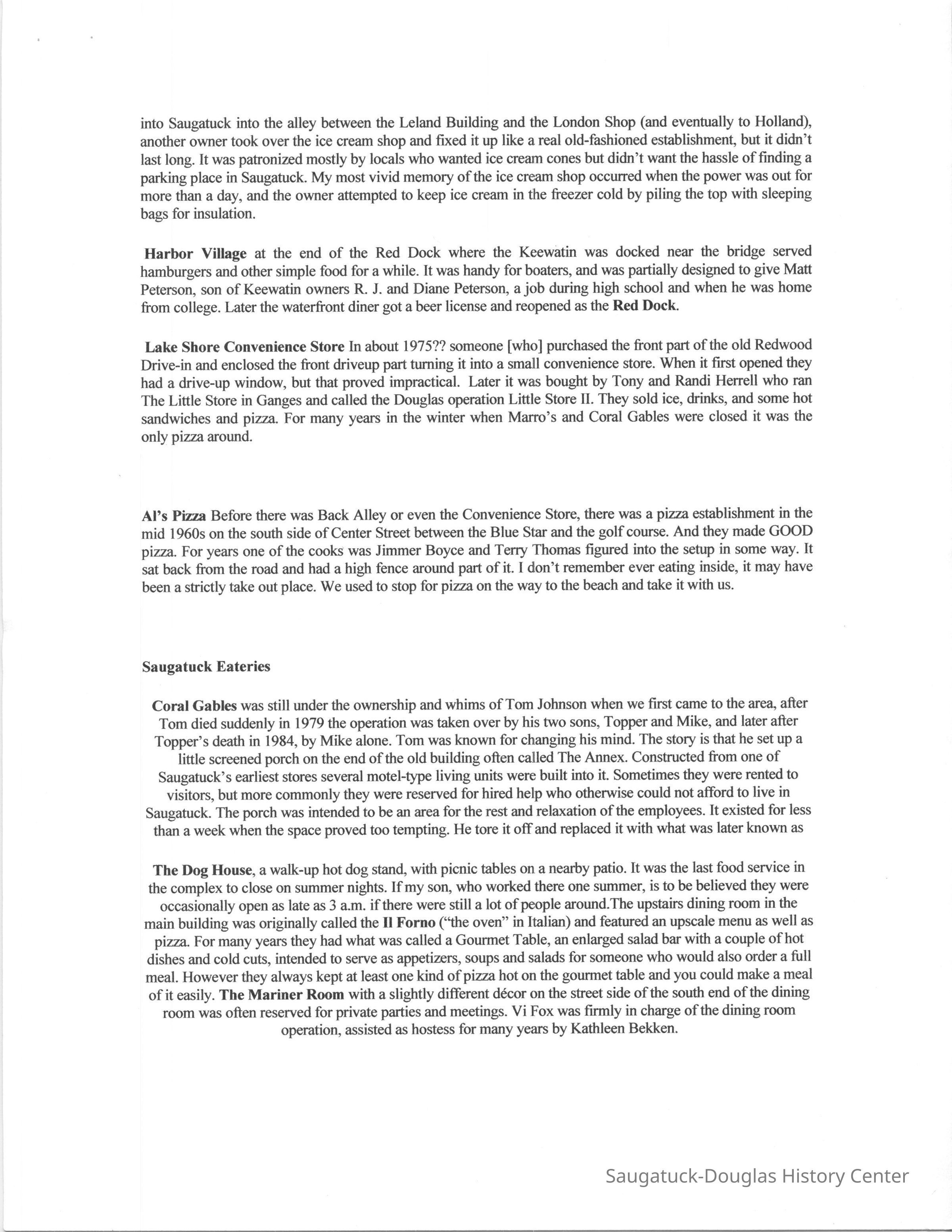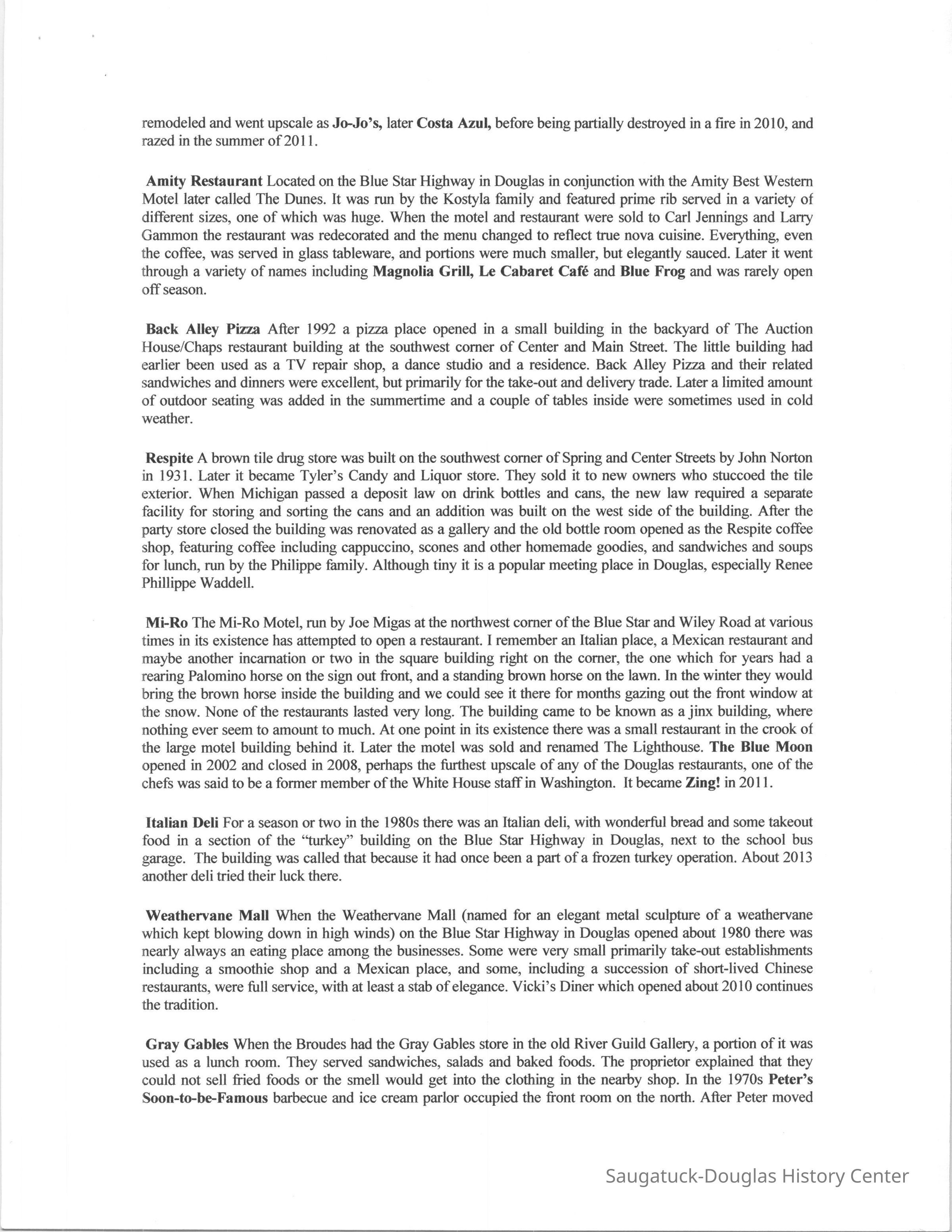 OCR scan of the main text: Restaurants Places to eat are important to the tourist, and, like most of the other businesses, there is a high turnover although a handful of restaurants manage to stay in business for years - usually until they bum down. Here is our listing of places we remember eating. Douglas Eateries Tara The popular restaurant that had been started by Charley Koning in the old Spencer house on the hill near the old schoolhouse in Douglas. It was one of the first businesses opened on the newly built Blue Star Memorial Highway in 1936. By the time we arrived it was owned by Fred Koning and still had the “Indian” theme that had been part of a redo by Dannie Hunn, noted interior decorator who had a home at Pier Cove. The Indians on the walls and menus were so stylized that they had a vaguely Egyptian look to them. The walls in the main dining room had several Carl Hoerman paintings of the Grand Canyon and other western scenes. I don’t remember much about the food except that it was expensive enough that we only ate there on special occasions. It had been sold when it burned about 1974 in a slow moving fire that started in the basement somewhere. A couple of years later it was replaced by a similar looking building and went through a succession of owners, at the end being renamed the Avalon. Bought by developers, the building was boarded up for several years before being razed in the summer of 2001 to make way for a condominium development. The Auction House One of the oldest buildings in Douglas at the northwest comer of Center and Main Streets has served the town for more than 100 years. It has been a gallery, insurance office, upholstery shop, tile store, meat market and grocery store. In the 1970s it was purchased by the Van Meters with the idea of beginning a restaurant. They found that the waste system did not meet code for a restaurant and, since a new sewer was planned for completion in a couple of years, they turned the building into an auction house while they were waiting, where Douglas native Ev Thomas held out several evenings a week. They sold all kinds of ordinary stuff on consignment. We used to go to the auctions for entertainment usually coming home with a new bowl or some dish towels, After the new sewer was built the restaurant opened and was named The Auction House for the building’s most recent use. It was the “family” restaurant where locals gathered for breakfast for many years. Successive owner Craig Mokma enlarged it several times eventually incorporating the old barber shop building on the west. They made a wonderful bread pudding and served full dinners. In the late 1990s it was turned into an upscale eatery called Chaps which lasted five or six years and, then a succession of short-lived, but mostly elegant, operations. Douglas Dinette For many years the Douglas Dinette, at the southwest corner of Center and Main Streets, Douglas, was the only place to eat in downtown Douglas. It had been owned by the Schaeffer family, had an old time soda fountain as part of its decor and a sign that was one of the last painted by Saugatuck’s legendary sign painter Dan Cook. For much of its existence it was open for breakfast and lunch only, closing about 2 p.m. After going through several owners it was purchased, probably in 1987, by Margaret Balmer whose son Matt, later studied to be a chef. It gradually changed its menu from hamburger and chicken dinner basics, to a more modem and healthful outlook, and, about 1998 reinvented itself as the Everyday People Cafe with an upscale menu and prices. In 2000 the restaurant doubled its size by building an addition next door where the old fruit stand had been torn down. Tastee-Treet The 1950s-style building on the Blue Star Highway that was the Tastee-Treet housed a typical franchise ice cream place. For many years it opened in March of every year and was the first sign that spring was coming to a snow-weary town. It was sold, probably in the late 1980s to M and M and renamed for themselves. The family had been in the restaurant business and, in addition to new and imaginative ice cream confections, they sold sandwiches and other lunch specials with a Greek theme. In 2001 they finally figured out how to squeeze a small sit-down restaurant onto the site. Redwood Drive-in Behind the Tastee-Treet was a building with redwood siding that served the best hamburgers in town. Joe and Kathy Hanacek ground their own hamburger meat using a special blend of meats and spices. When we arrived in 1967 the drive-in was still operating. There were covered parking places both in front and in back of the building and a “car-hop” would come out and take your order, then bring it on a small metal tray that attached to the car window. You ate in your car, an especially handy proposition for those with small children. Later the front covered area was enclosed to create the Lakeshore Convenience Store which was a major purveyor of hot pizza for the Saugatuck-Douglas area when Marros and Coral Gables was closed in the winter. The Redwood Drive-In later became the Waypoint, long after it ceased drive-in service, much later owned by fisherman Mike Peel and wife. Kalico Kitchen A “down home” restaurant on the west side of the Blue Star Highway near where it forms a “Y” with Chase Road the Kalico Kitchen has always specialized in homestyle food with a slight southern tinge. The menu reflects the country theme by spelling “eggs” as “aigs” and talking of “biskuts.” It has always been a premier breakfast place, but was open for dinners as well. After The Auction House and the Douglas Dinette went upscale and stopped serving breakfast, this business really boomed and the Kalico Kitchen added first an outdoor seating (enclosed in cold weather by plastic) and then a new dining area along Chase Road. For a period of time, probably in the 1970s, Kathy’s Ice Cream Shop was open in the old gas station at the point of th