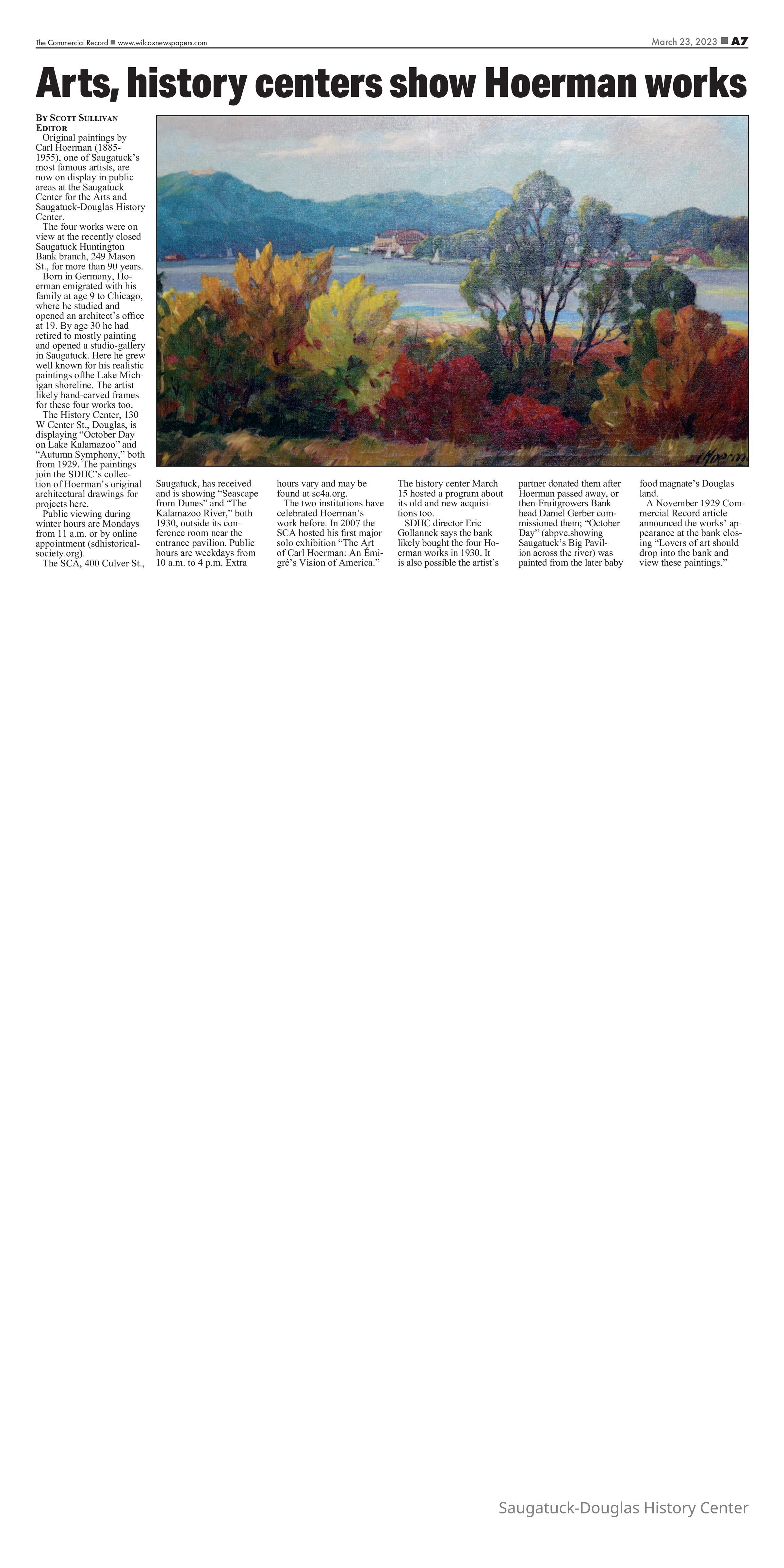 The painting appears on page 24 of the 1997 SDHC publication "Painting the Town" as "Big Pavilion from the Douglas Shore," 1949, with the following description on page 33: "In Michigan and Chicago he [Hoerman] is best known for his landscapes and dune scenes, with dramatic foliage outlined against a sky of swirling clouds. In a large painting of Kalamazoo Lake the viewer looks over the south bank of the lake, past fall-tinted foliage to the village of Saugatuck on the north bank where the Big Pavilion looks pink in the brightness of a morning sun. The sandy top of Mount Baldhead gleams in the distance."