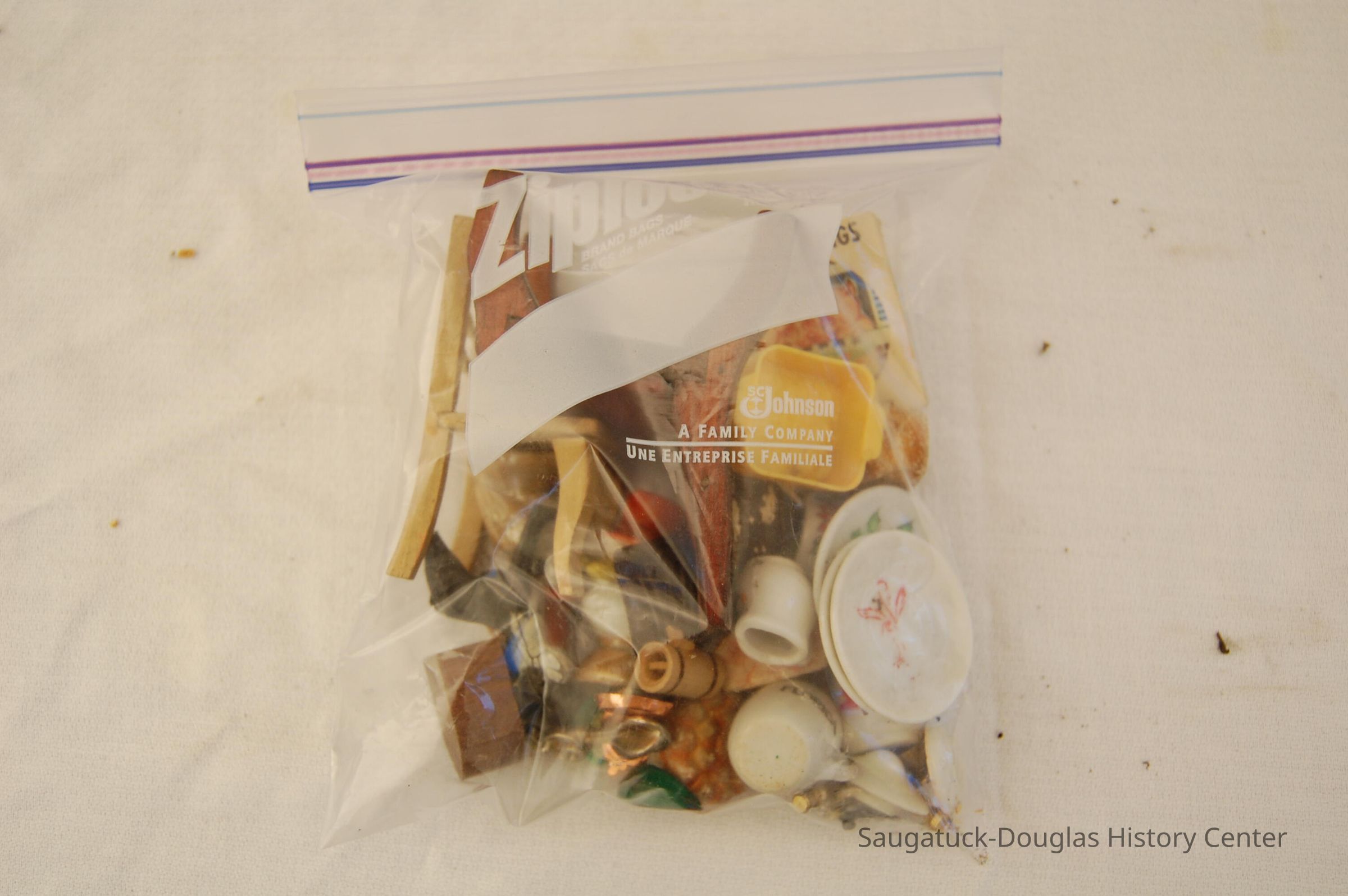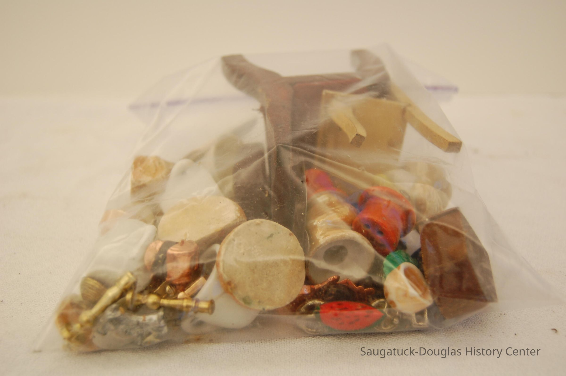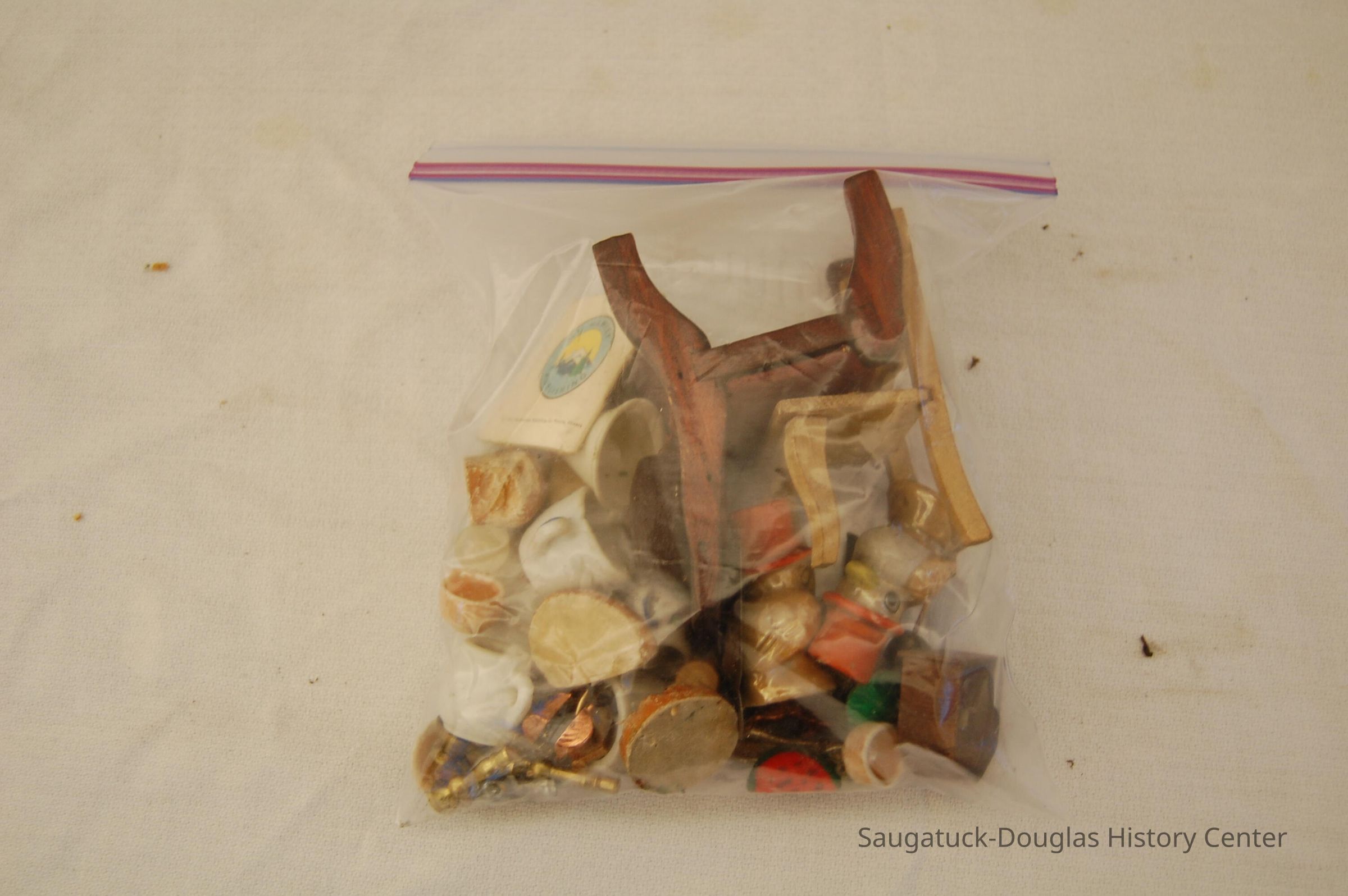 Ziploc plastic bag with miscellaneous small items, doll house furniture or miniatures
