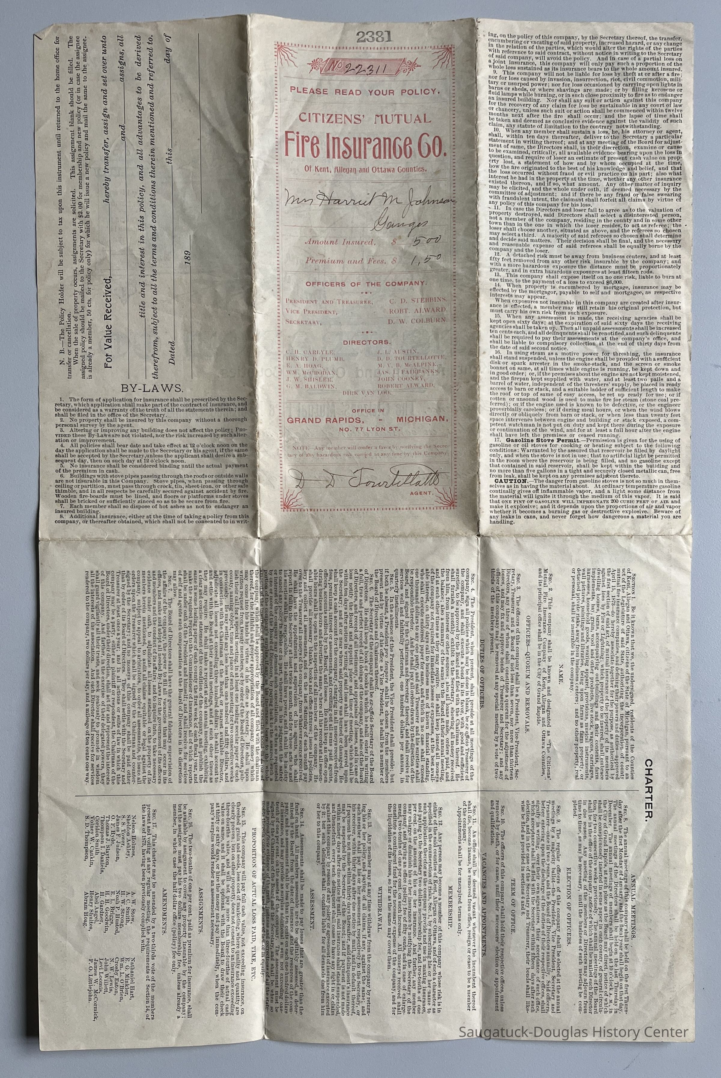 The policy was written by the Citizens' Mutual Fire Insurance Co. of Kent, Allegan and Ottawa Counties on 28 May 1898.