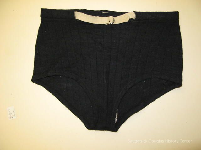 Black wool men's swim suit with white woven cotton belt with D ring buckles. Label inside back waistband, Gordon Mackay all wool. Jock support made of cotton.