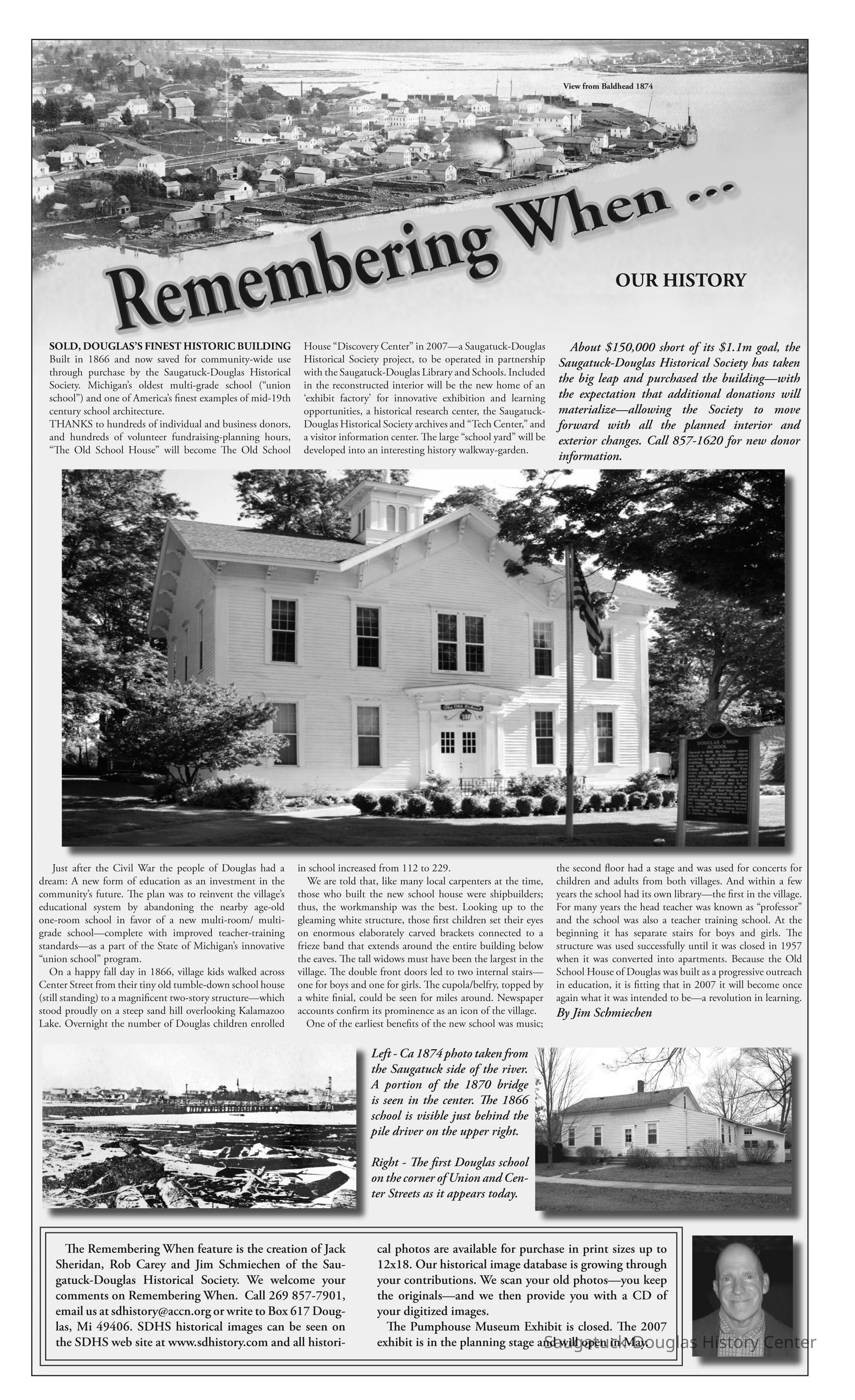 SOLD, DOUGLAS’S FINEST HISTORIC BUILDING Built in 1866 and now saved for community-wide use through purchase by the Saugatuck-Douglas Historical Society. Michigan’s oldest multi-grade school (“union school”) and one of America’s finest examples of mid-19th century school architecture. ... Just after the Civil War the people of Douglas had a dream: A new form of education as an investment in the community’s future. The plan was to reinvent the village’s educational system by abandoning the nearby age-old one-room school in favor of a new multi-room/ multi-grade school—complete with improved teacher-training standards—as a part of the State of Michigan’s innovative “union school” program. On a happy fall day in 1866, village kids walked across Center Street from their tiny old tumble-down school house (still standing) to a magnificent two-story structure—which stood proudly on a steep sand hill overlooking Kalamazoo Lake. Overnight the number of Douglas children enrolled in school increased from 112 to 229. We are told that, like many local carpenters at the time, those who built the new school house were shipbuilders; thus, the workmanship was the best. Looking up to the gleaming white structure, those first children set their eyes on enormous elaborately carved brackets connected to a frieze band that extends around the entire building below the eaves. The tall widows must have been the largest in the village. The double front doors led to two internal stairs—one for boys and one for girls. The cupola/belfry, topped by a white finial, could be seen for miles around. Newspaper accounts confirm its prominence as an icon of the village. One of the earliest benefits of the new school was music; the second floor had a stage and was used for concerts for children and adults from both villages. And within a few years the school had its own library—the first in the village. For many years the head teacher was known as “professor” and the school was also a teacher training school. At the beginning it has separate stairs for boys and girls. The structure was used successfully until it was closed in 1957 when it was converted into apartments. Because the Old School House of Douglas was built as a progressive outreach in education, it is fitting that in 2007 it will become once again what it was intended to be—a revolution in learning. By Jim Schmiechen