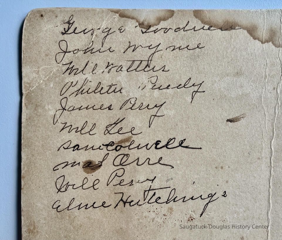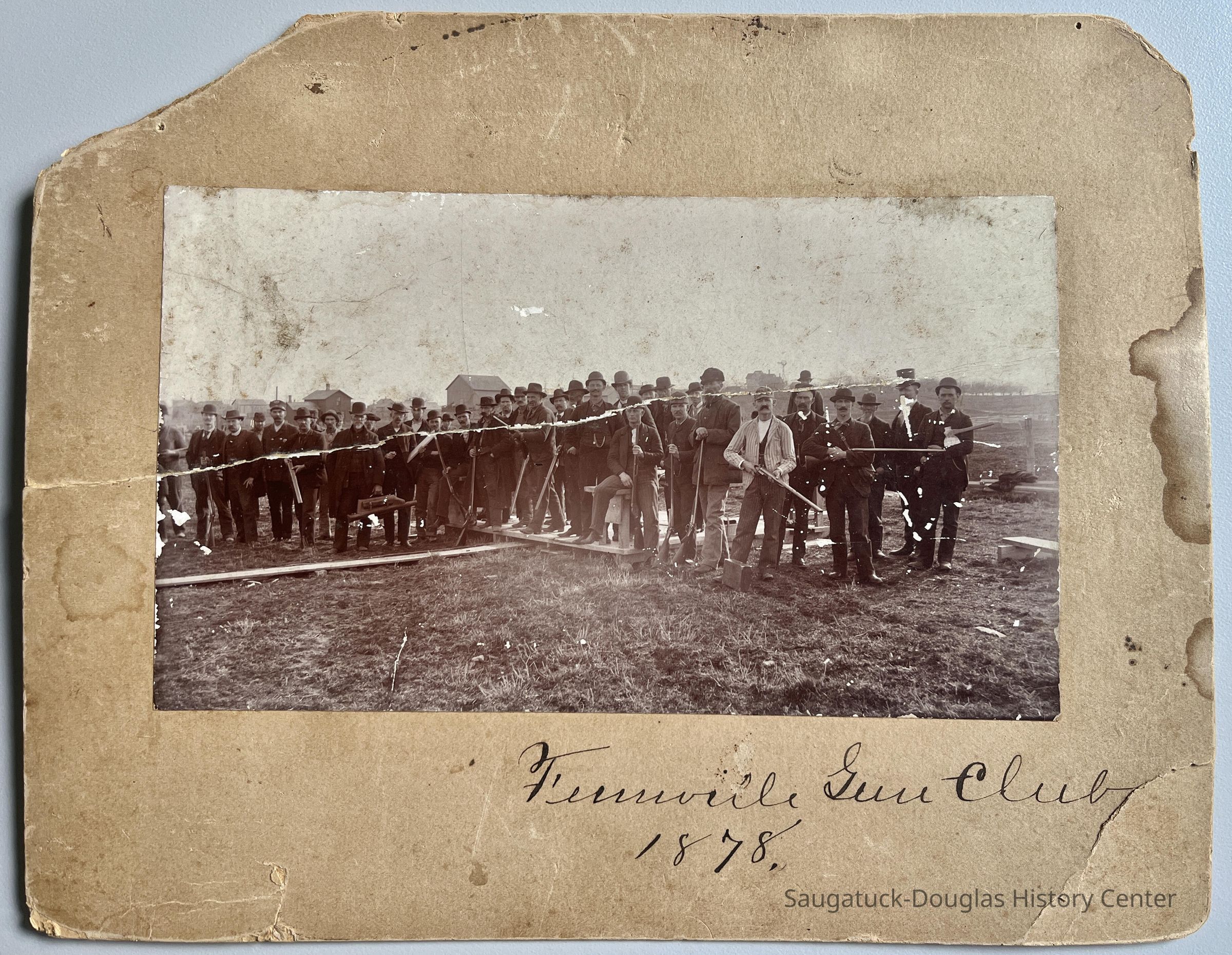 Mention of the gun club photo from the December 2016 SDHS newsletter By Mary Voss Last month we reported on our receipt of a large collection of historical documents and photos from the late Charles Lorenz. What fun to find such great pictures as we begin to work through the Lorenz collection! The image above is of the Philetus Purdy Landing on Riverside Dr. and 63rd. It's not often that these old pictures have the location identified. No date is listed but I'm assuming it must have been in the heyday of logging in the 1870-1890s. An accompanying photo of the men of the Fennville Gun Club was dated 1878. Most of what we have gone through so far is research material for Charles' book on the early history of Saugatuck. We were able to purchase a used copy on-line, privately published in 1983. It will be interesting to compare the finished product with the research when we receive the copy.