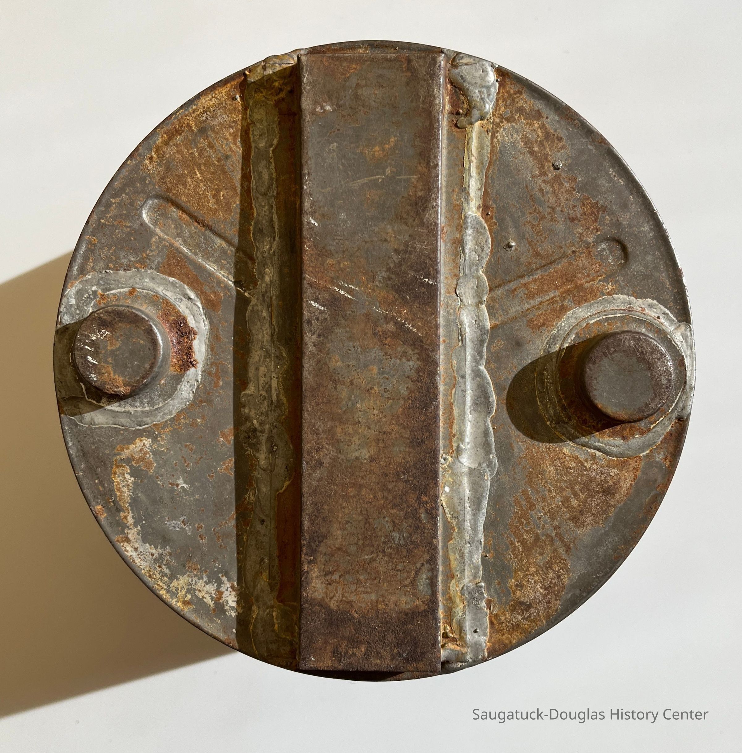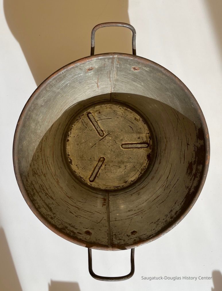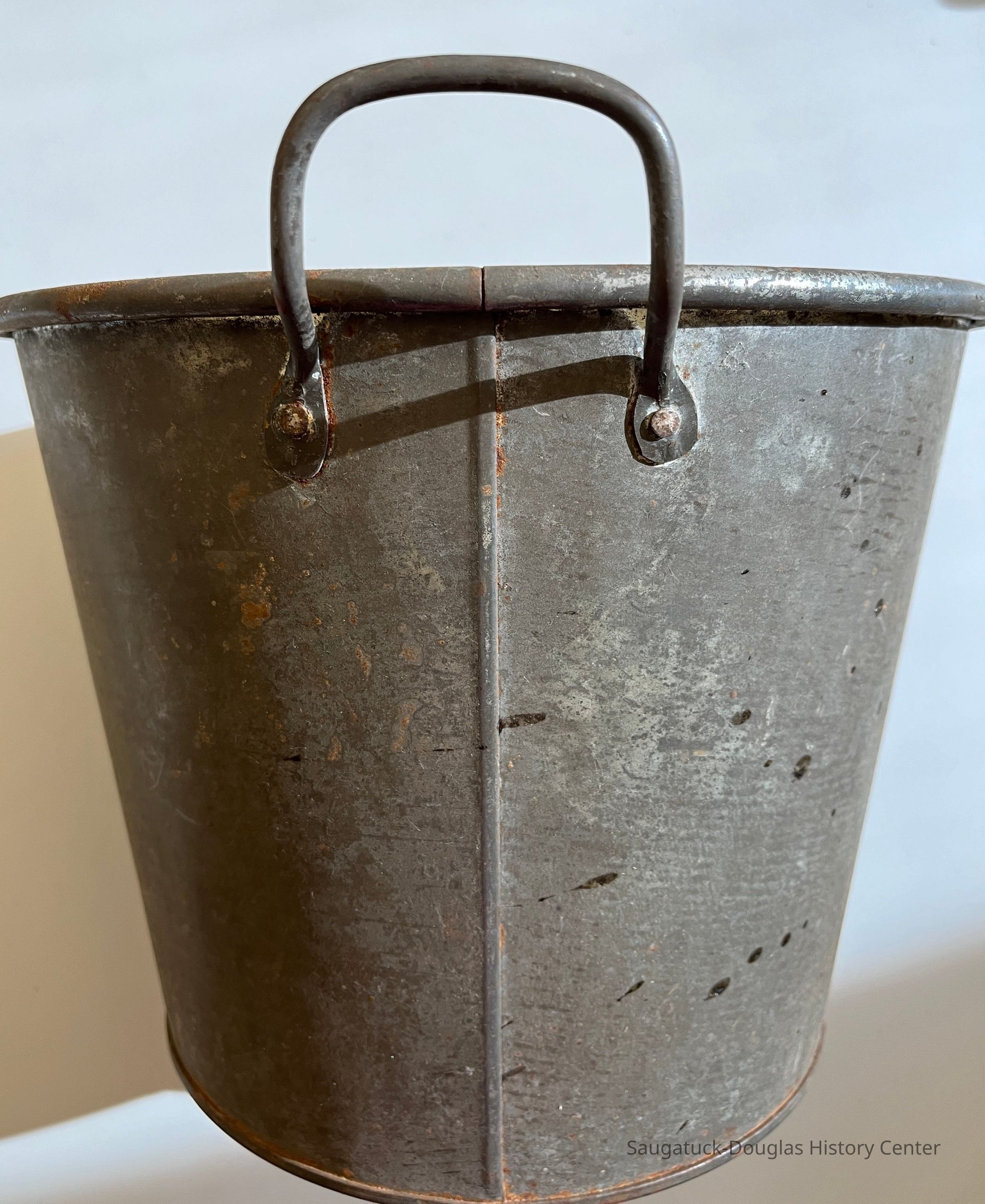 Mixing bowl or pail from a No. 4 Universal Bread Maker. The metal, bucket-shaped appliance once included a lid, a table clamp and crank to turn a dough hook. The side of the bucket displays branding that reads "No. 4, Universal Bread Maker, Awarded Gold Medal, St. Louis Exposition, 1904, Made by Landers, Frary & Lark, New Britain, Connecticut, U.S.A."