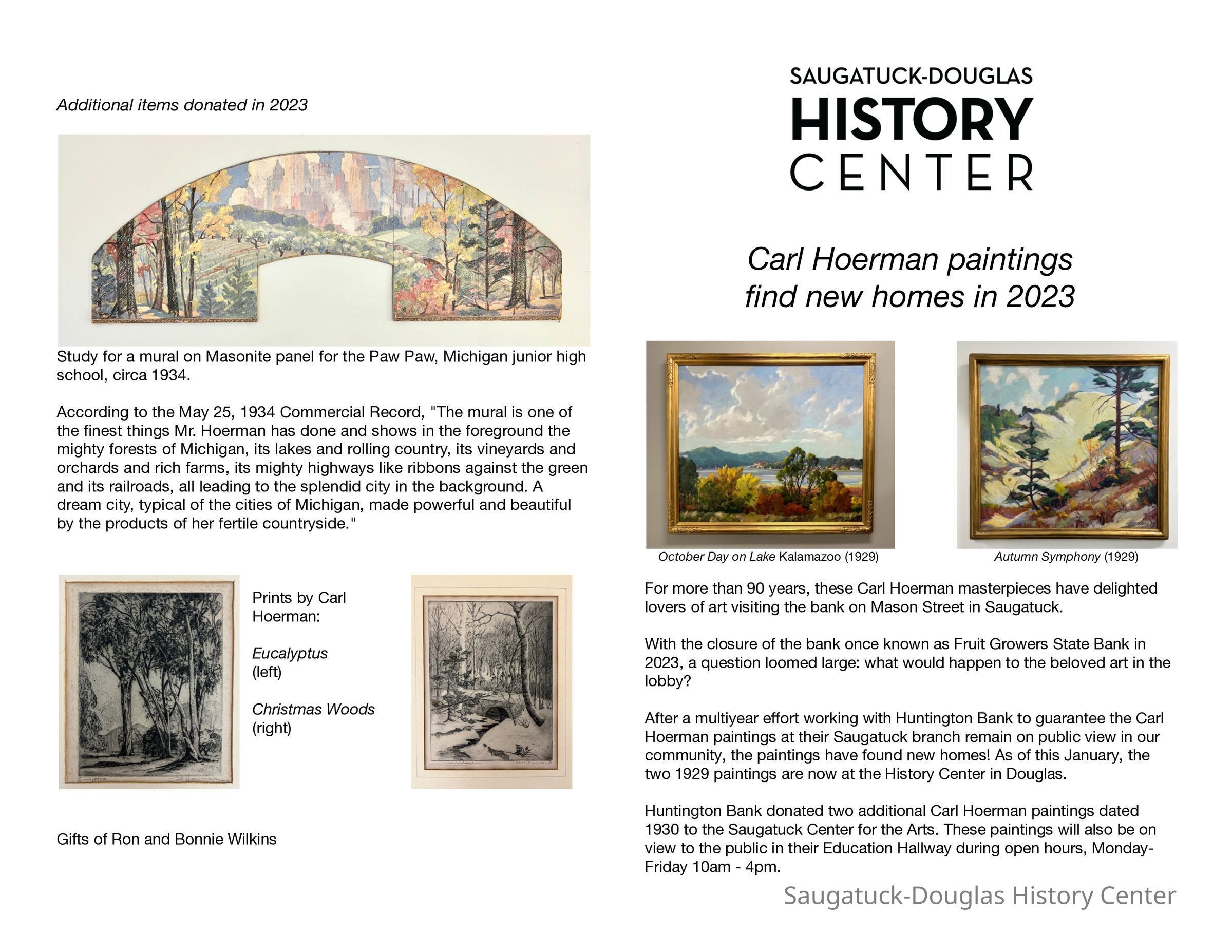 The painting appears on page 24 of the 1997 SDHC publication "Painting the Town" as "Big Pavilion from the Douglas Shore," 1949, with the following description on page 33: "In Michigan and Chicago he [Hoerman] is best known for his landscapes and dune scenes, with dramatic foliage outlined against a sky of swirling clouds. In a large painting of Kalamazoo Lake the viewer looks over the south bank of the lake, past fall-tinted foliage to the village of Saugatuck on the north bank where the Big Pavilion looks pink in the brightness of a morning sun. The sandy top of Mount Baldhead gleams in the distance."