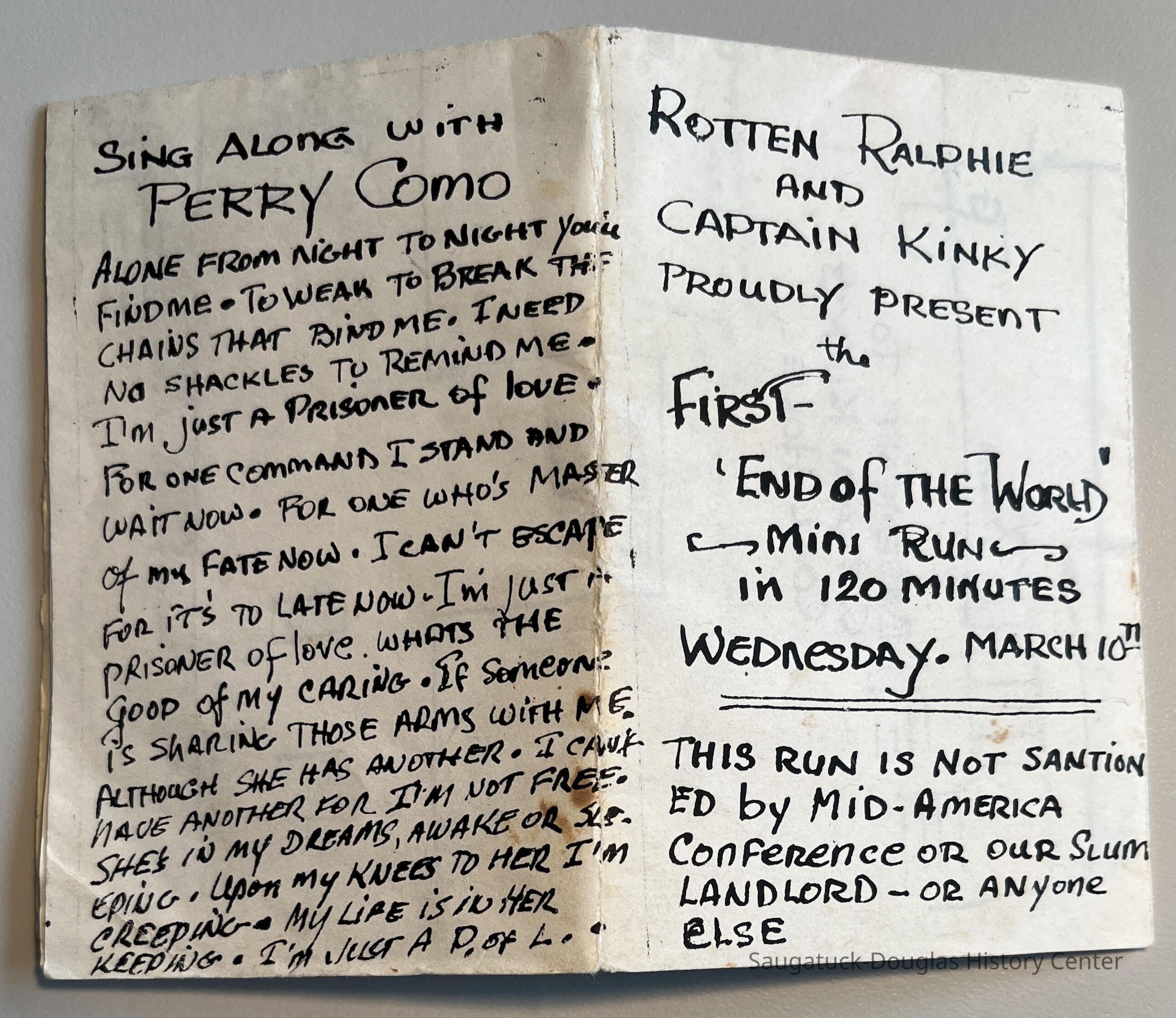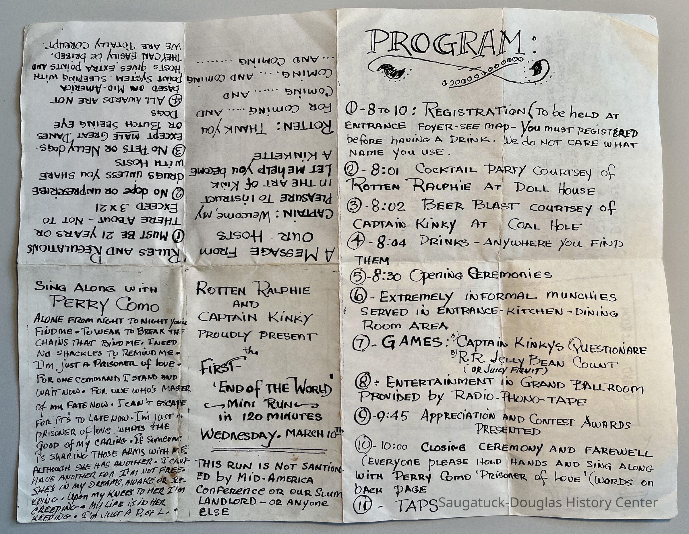 Homemade, photocopied invitation and program for a "run" party. Dotted with jokes and references to kink, coming, drinking and drugs but also a Jelly Bean Count. Event scheduled to conclude with group sing-a-long to Perry Como's "Prisoner of Love" (1946)