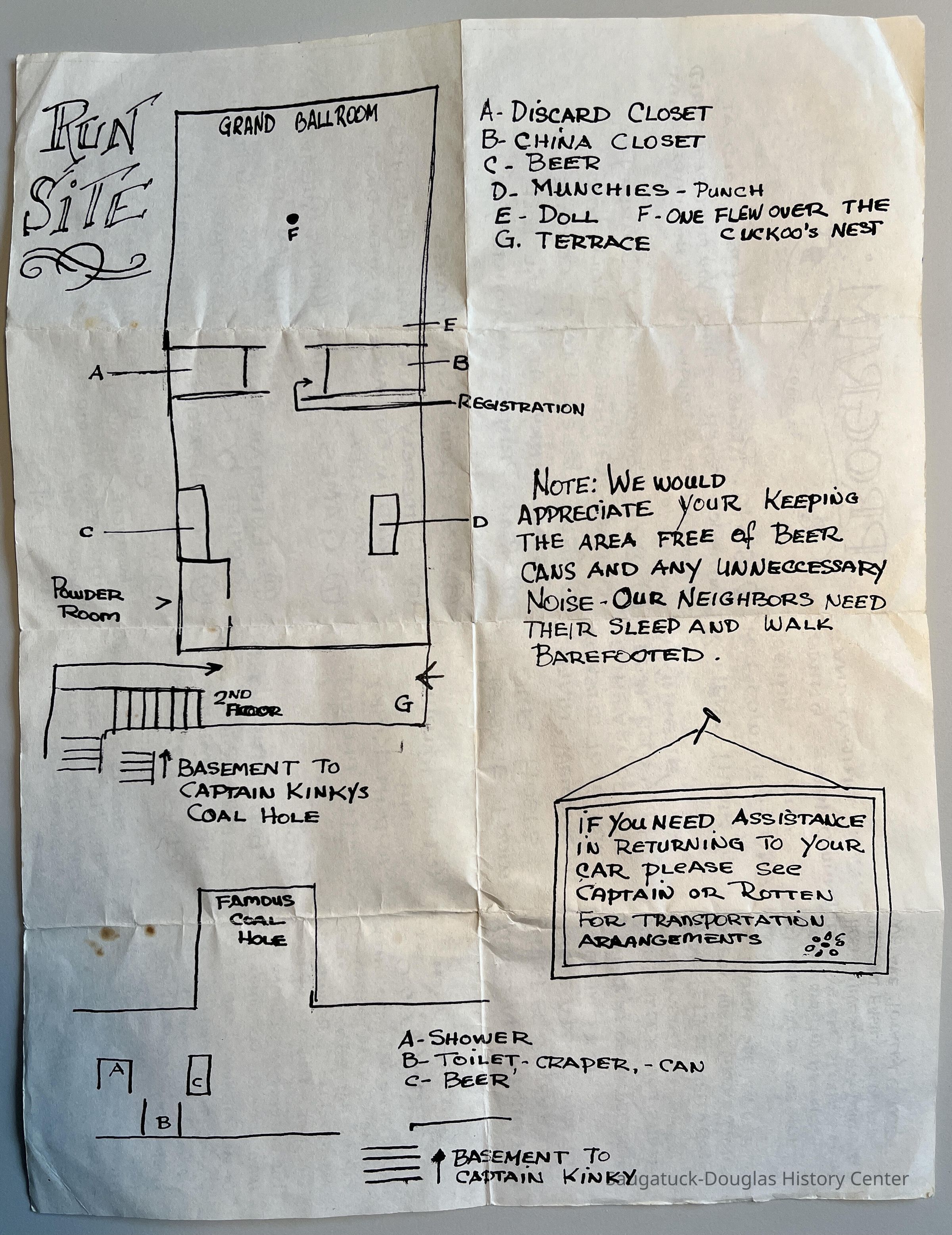 Example of elaborate, themed parties hosted by gay men in their homes since it was not safe to meet or appear gay in public spaces. Before the founding of the Douglas Dunes in 1981, many Gay, Park-Street-cottage owners created similar, fanciful invitations.
