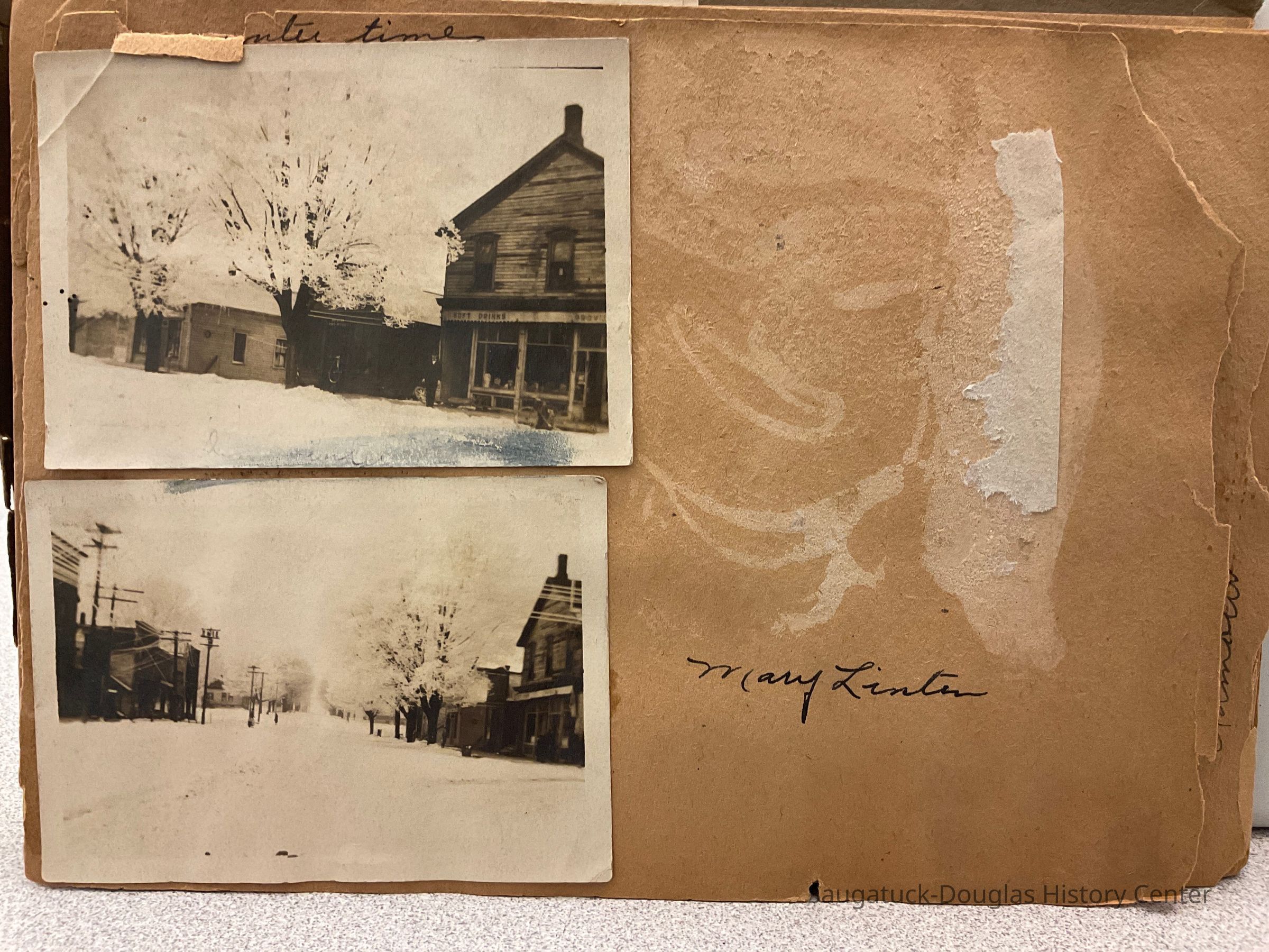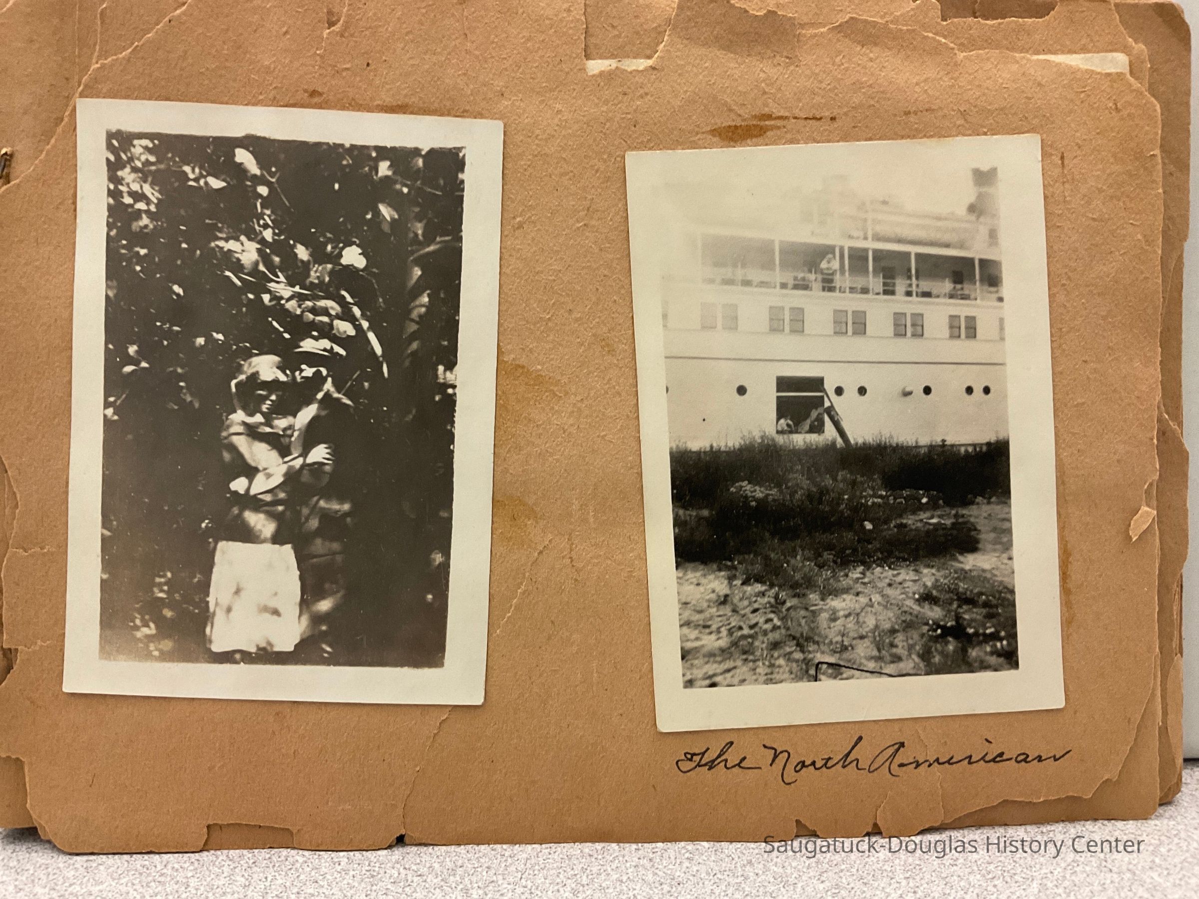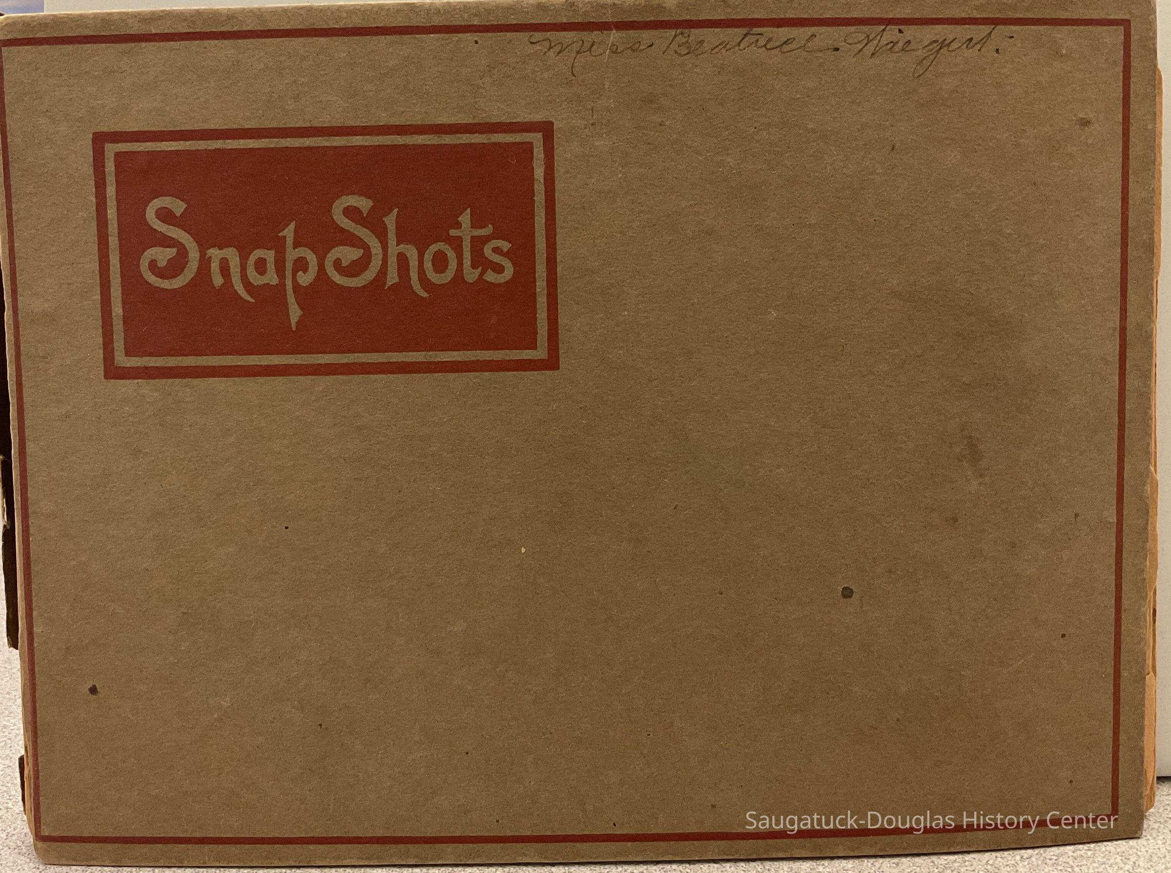 An old scrapbook that reads "Snapshots" on the front cover. It features all black and white photographs glued onto the pages. Each photo contains a simple label underneath it. The front has the name "Miss Beatrice Wiegert" written with a pencil in cursive near the top.
