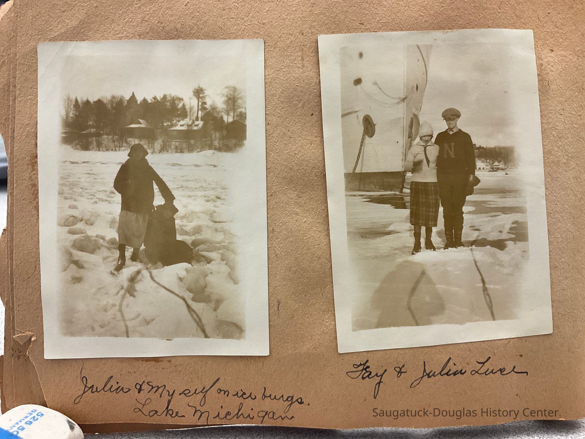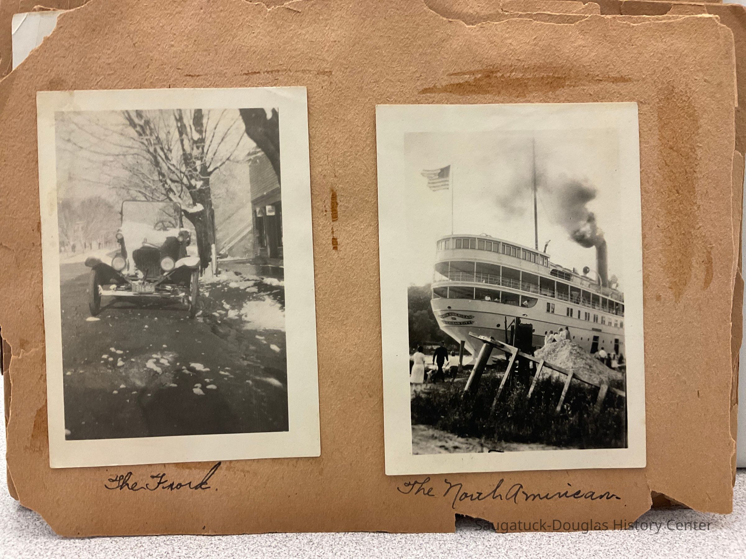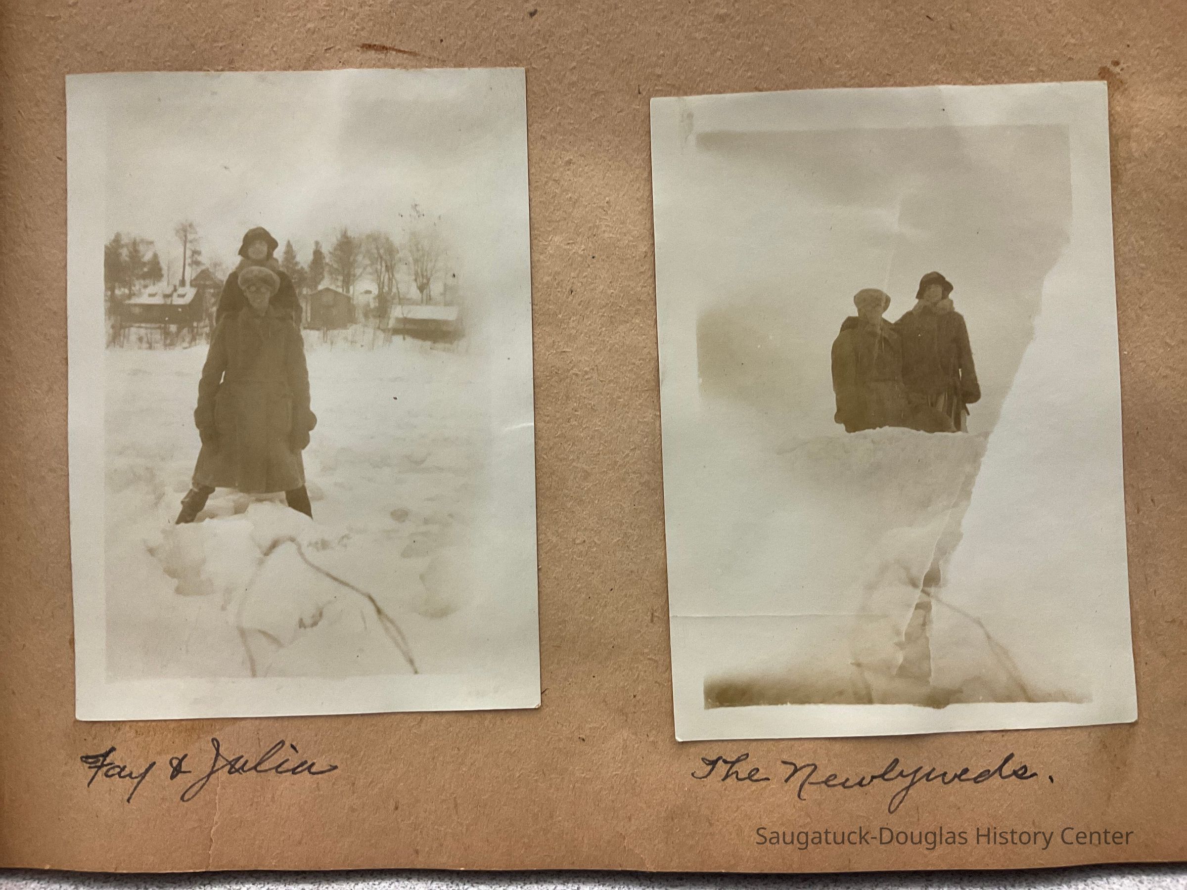 An old scrapbook that reads "Snapshots" on the front cover. It features all black and white photographs glued onto the pages. Each photo contains a simple label underneath it. The front has the name "Miss Beatrice Wiegert" written with a pencil in cursive near the top.