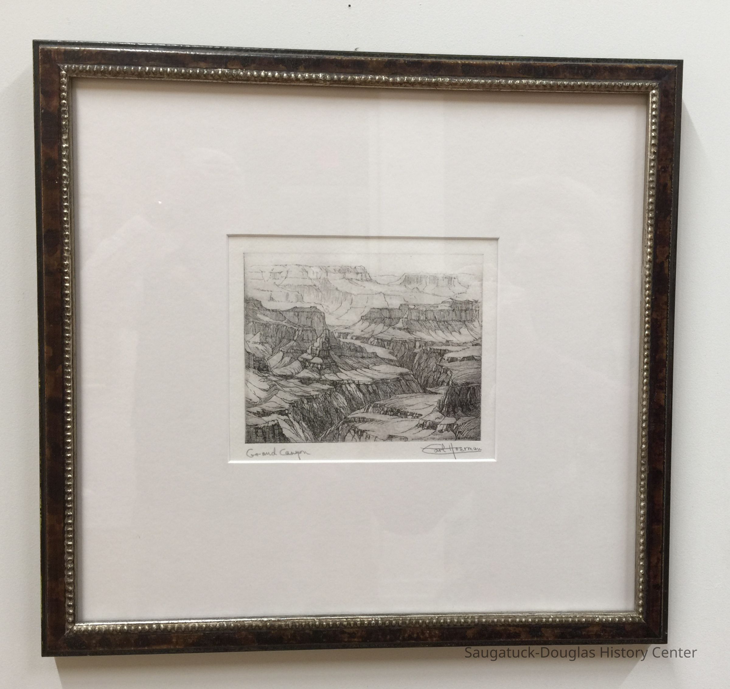 Carl Hoerman 1885 - 1955 Grand Canyon c. 1930 | print Notes: Born in Babenhausen, Bavaria, Germany, Carl Hoerman was a landscape painter who used savings from working in a Hamburg shipyard and sales of charcoal drawings to finance his move to the United States in 1904. In Chicago, he studied architecture and in 1909, opened his own office where he worked until 1920. After that, he devoted most of his time to painting, and built a studio and art gallery at Saugatuck, Michigan. In 1927, he and his wife began trips to the West and Southwest where he painted desert, Grand Canyon, and mountain scenes. Later, he became known as a “dunes painter” because of his landscapes of western Michigan. As this example shows, Carl was also very competent as a printmaker. Carl Hoerman is famous for his depictions of the Grand Canyon. *adapted from the Archives at askArt. Collection: Saugatuck Douglas History Center Gift of: Chris Spencer Accession: 2014.23.03