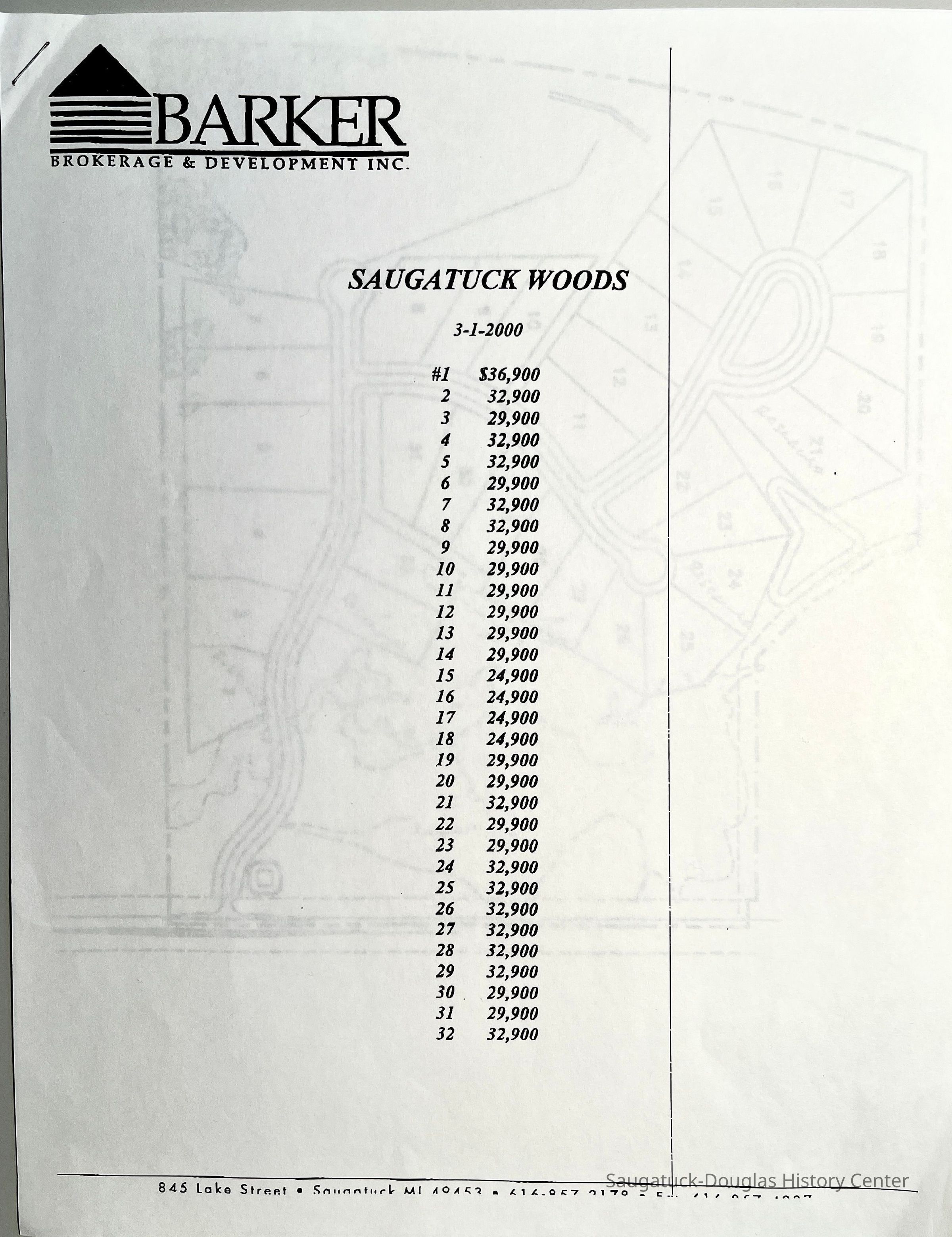 Two-page information sheet with prices and plot available in the Saugatuck Woods subdivision, dated 3-1-2000. The document was produced by Barker Brokerage and Development, Inc. at 845 Lake Street, Saugatuck.