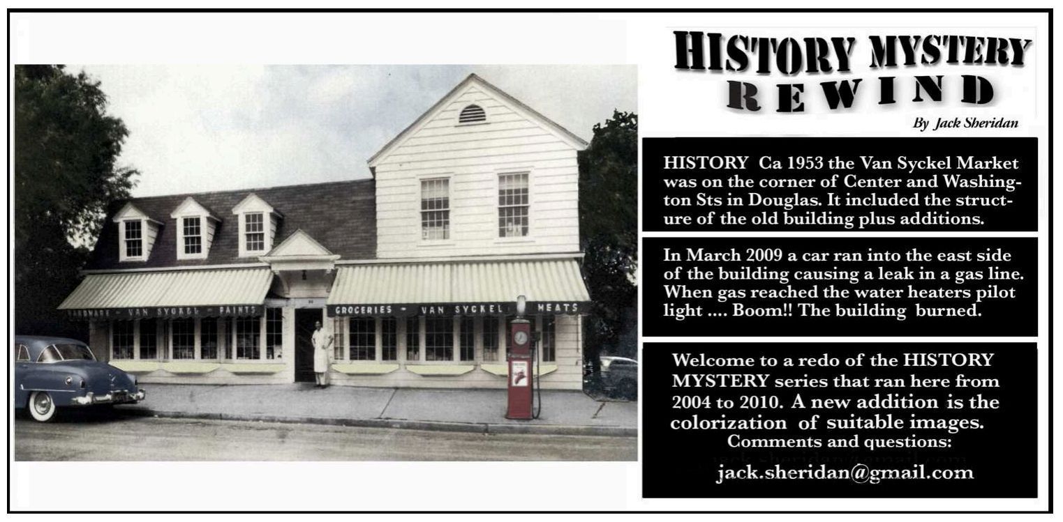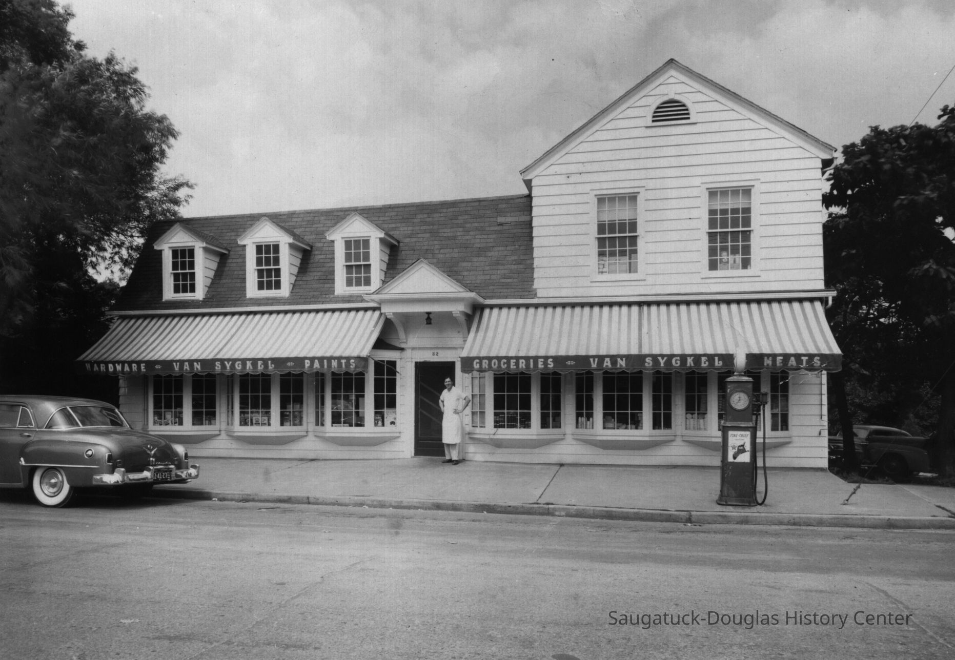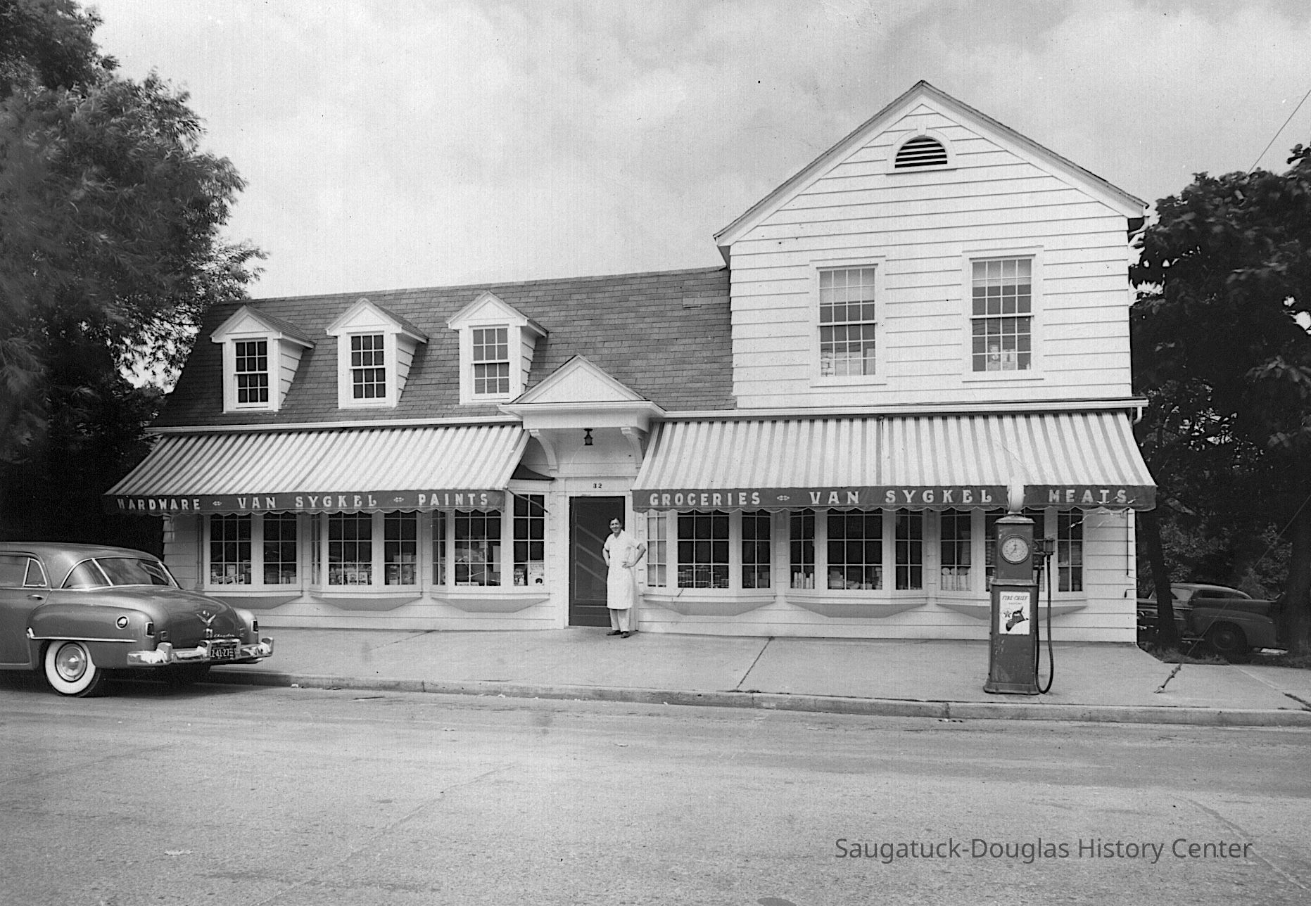Photo caption from "Raising the Roof" 2nd edition, page 127: VAN SYCKEL'S STORE 1941 Center Street | Douglas This classy Colonial Revival with six bay windows and a tall pedimented hood over the door was the village grocery store. Note the gas pump. The VanSyckel family operated this store for many years, at first as a combination grocery and hardware business, then exclusively as a grocery. It later became the IGA store operated by Ed and Marge Burns. Now retail space and apartments, slightly altered condition. Destroyed by fire, 2006.