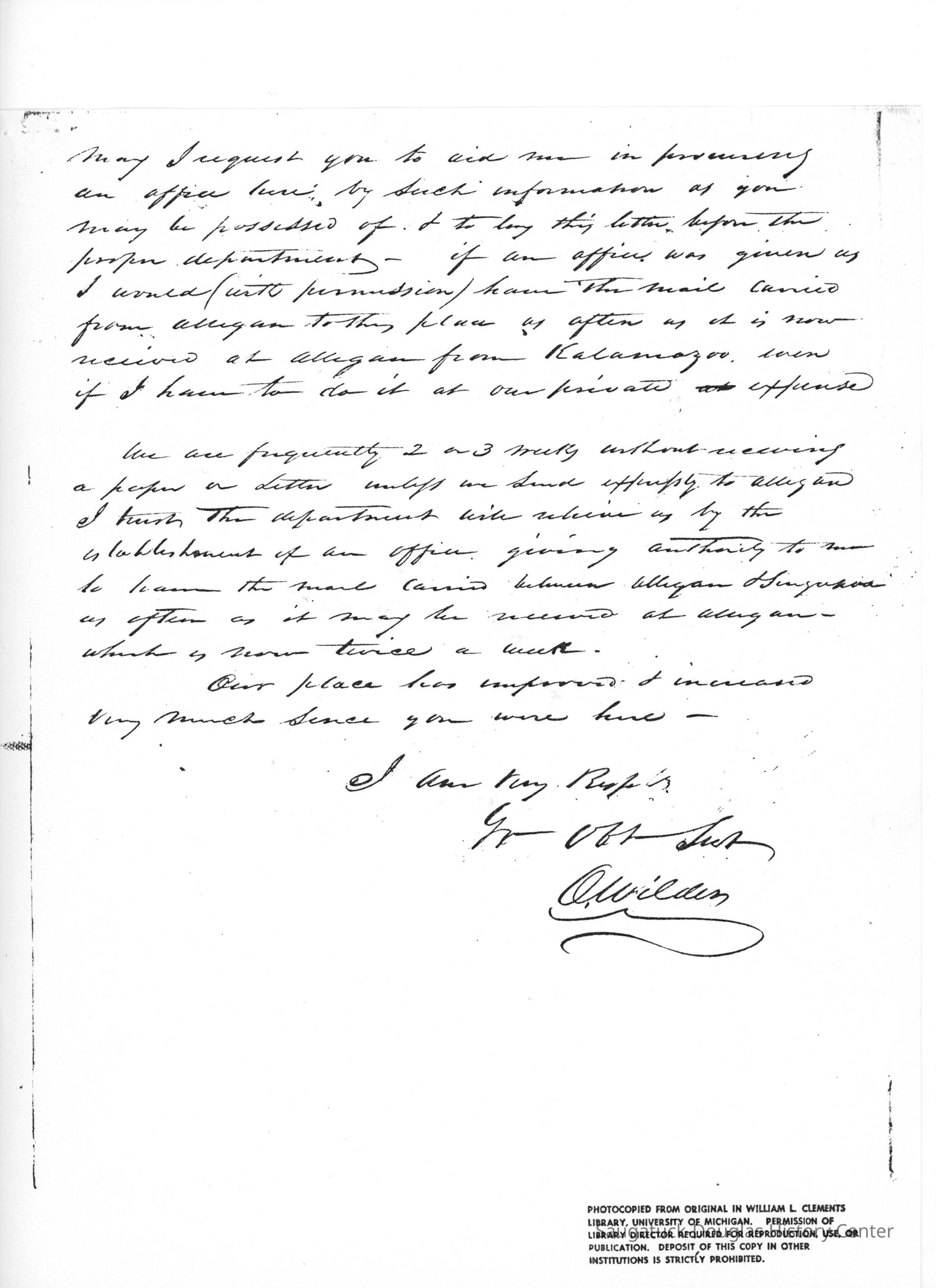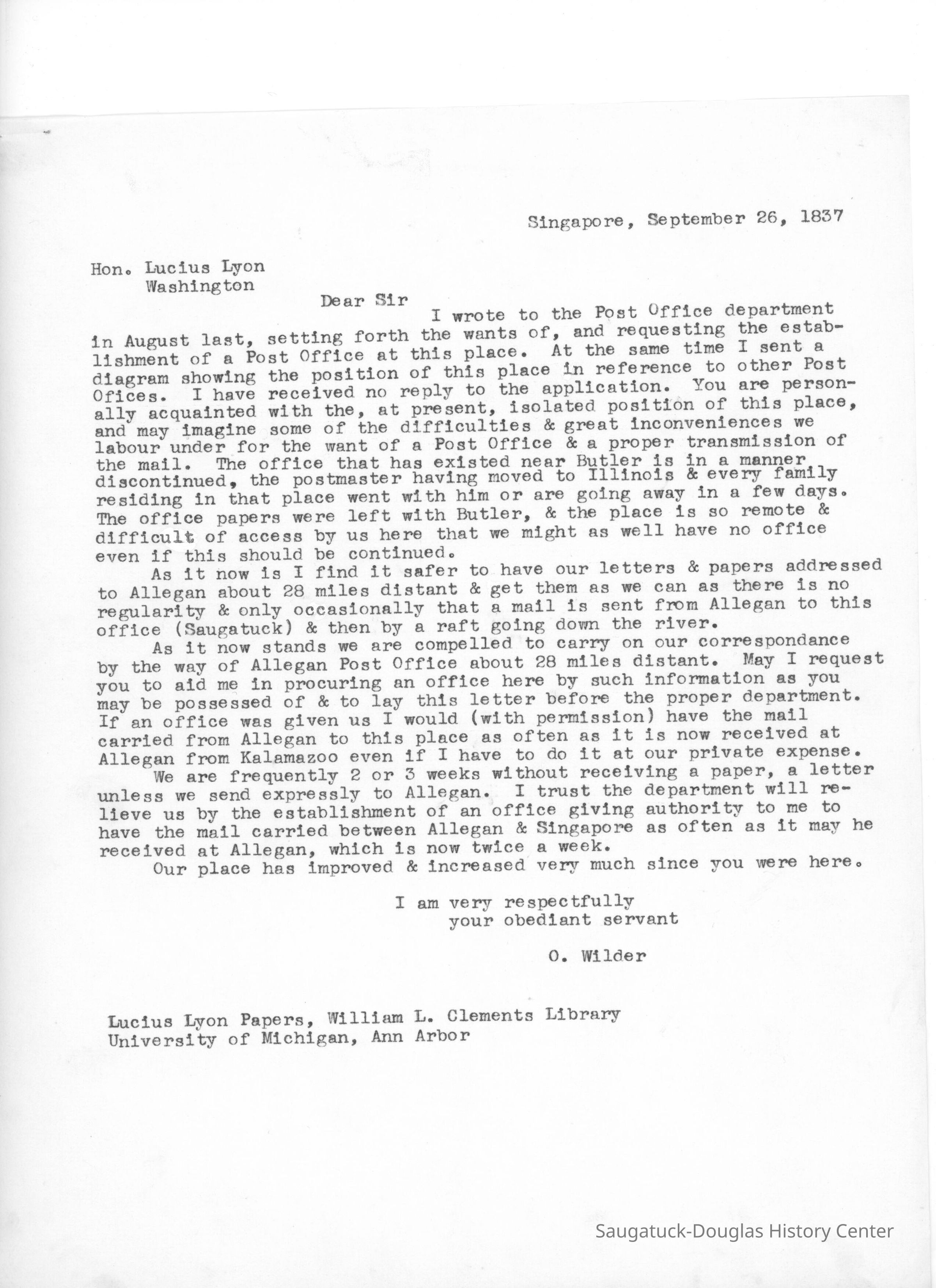 Letter from Oshea Wilder to Lucius Lyon (1837)