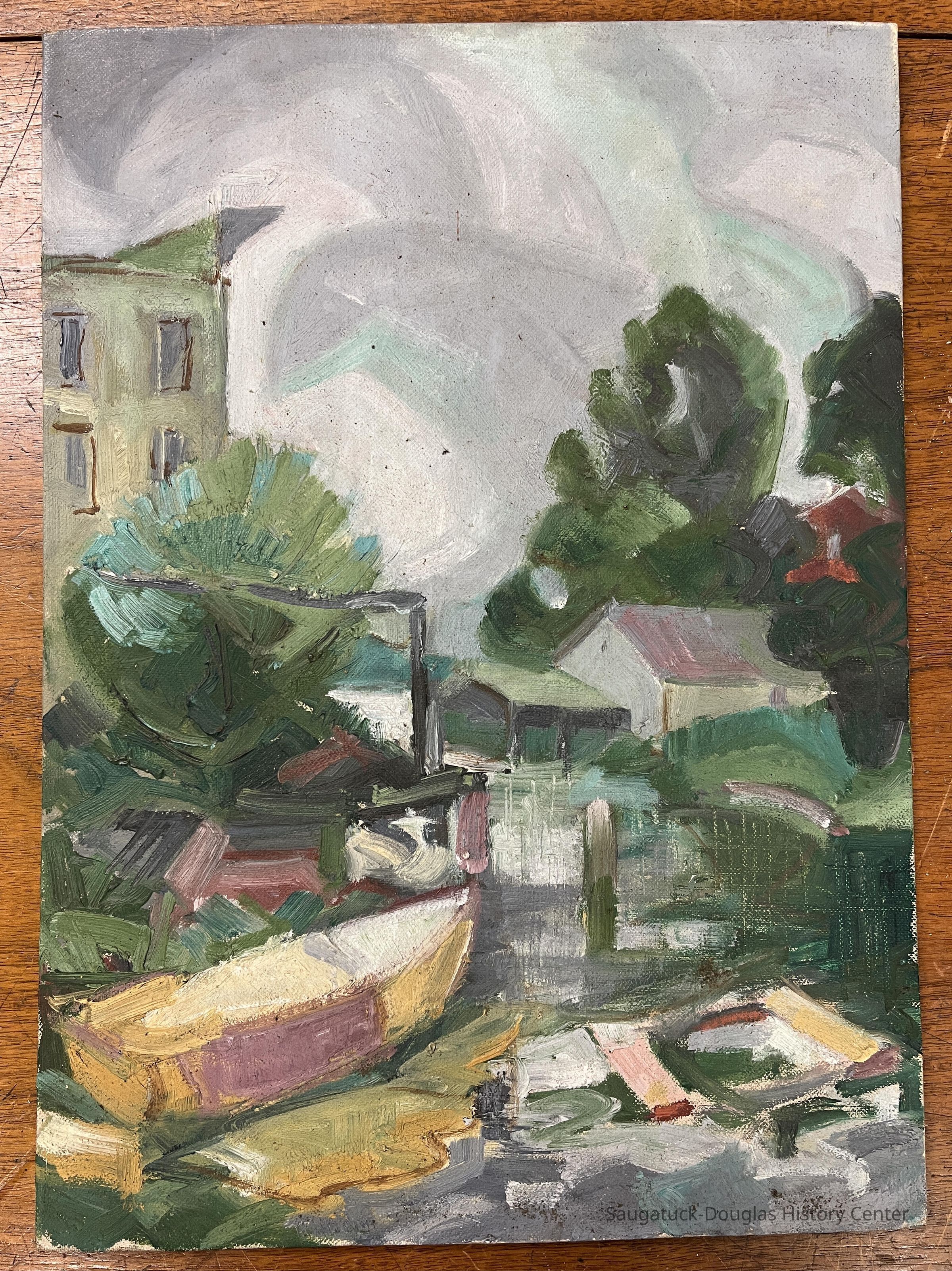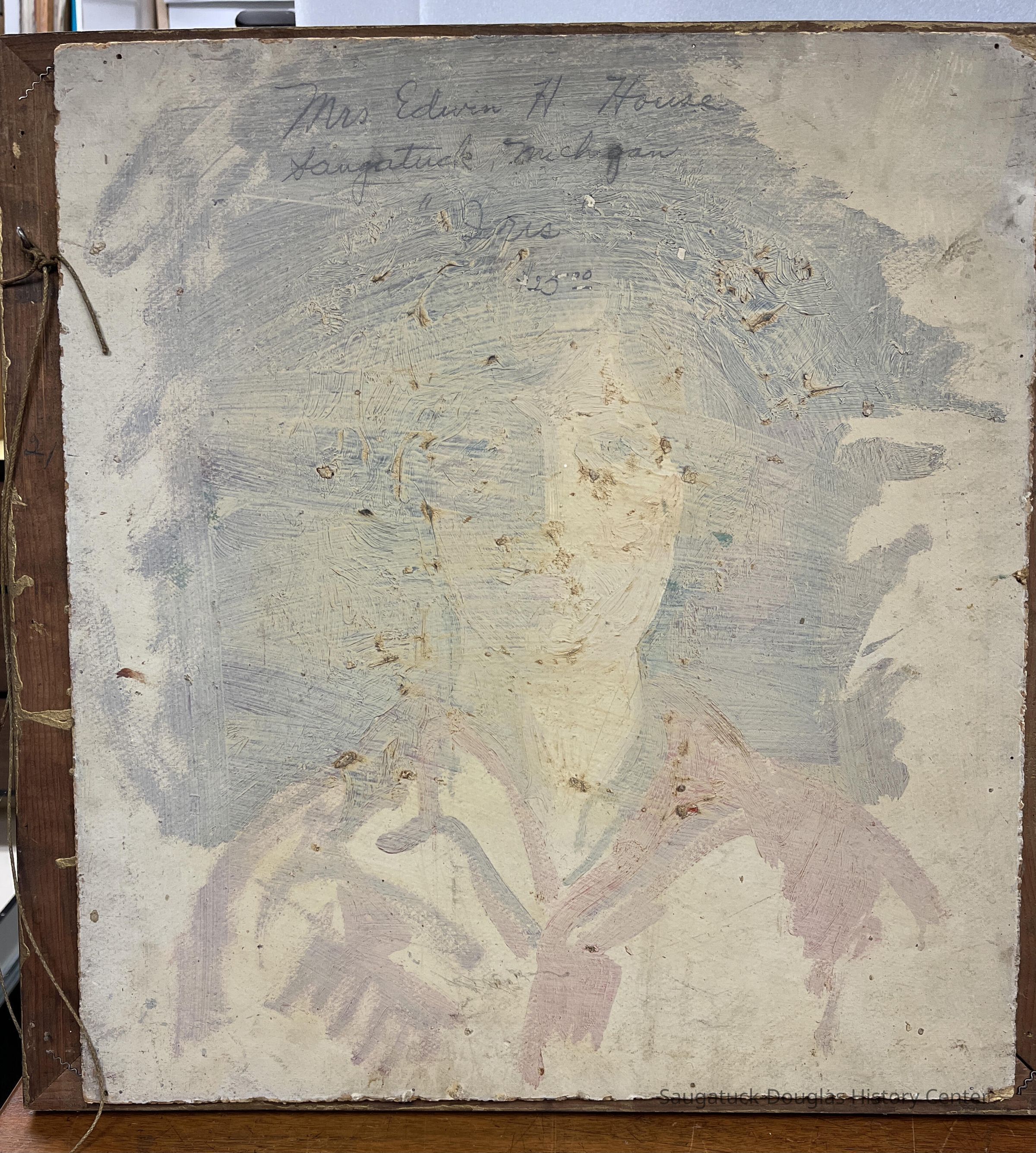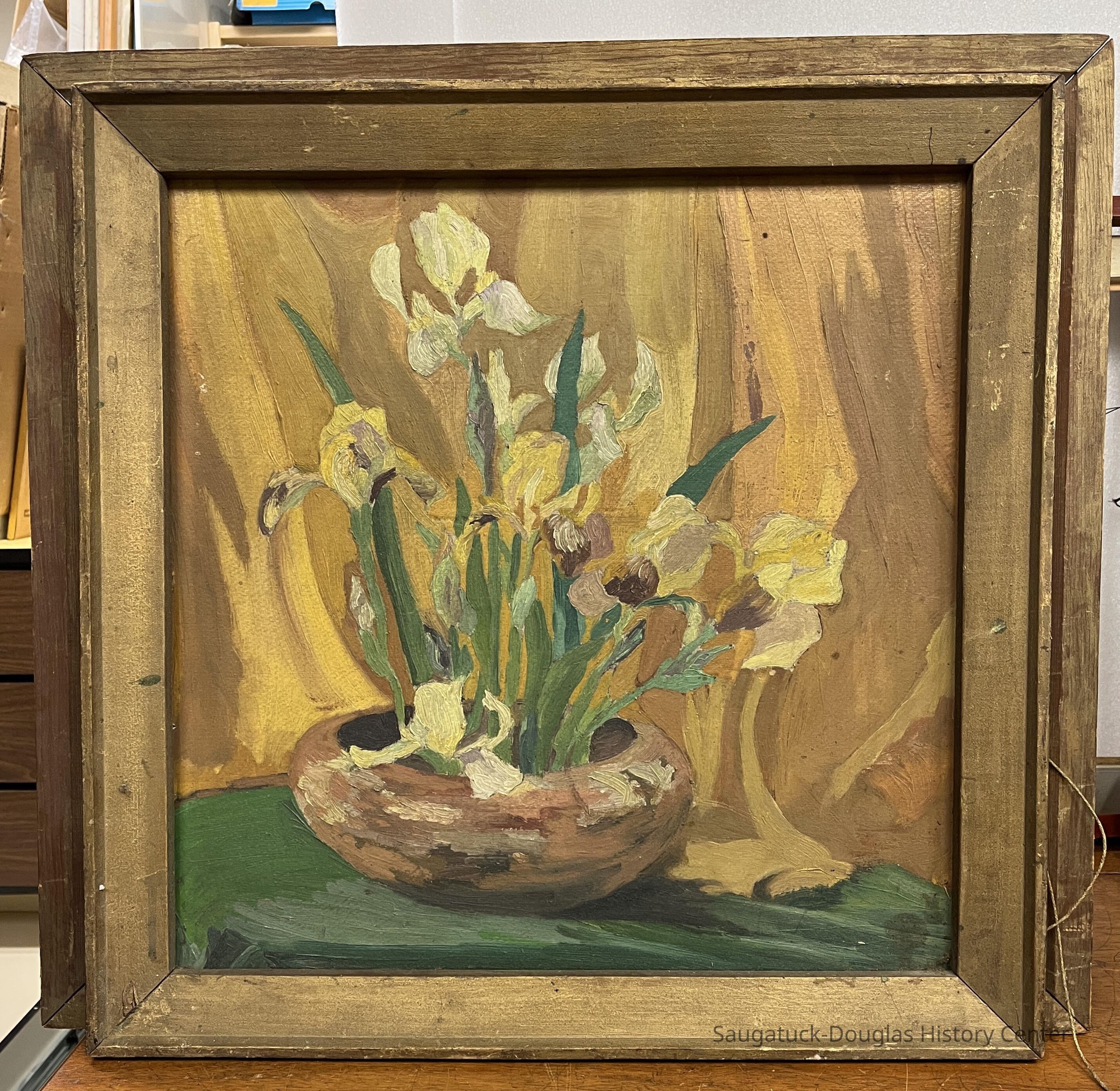 The framed painting of yellow iris flowers has "Mrs. Edwin H. House" written on back, indicating it may be the work of Celia's mother, whose name is Celia (Gamble) House. The panel is attached to the back of the frame, rather than held within the frame. The reverse side of the panel was painted over with white, partially obscuring a portrait.