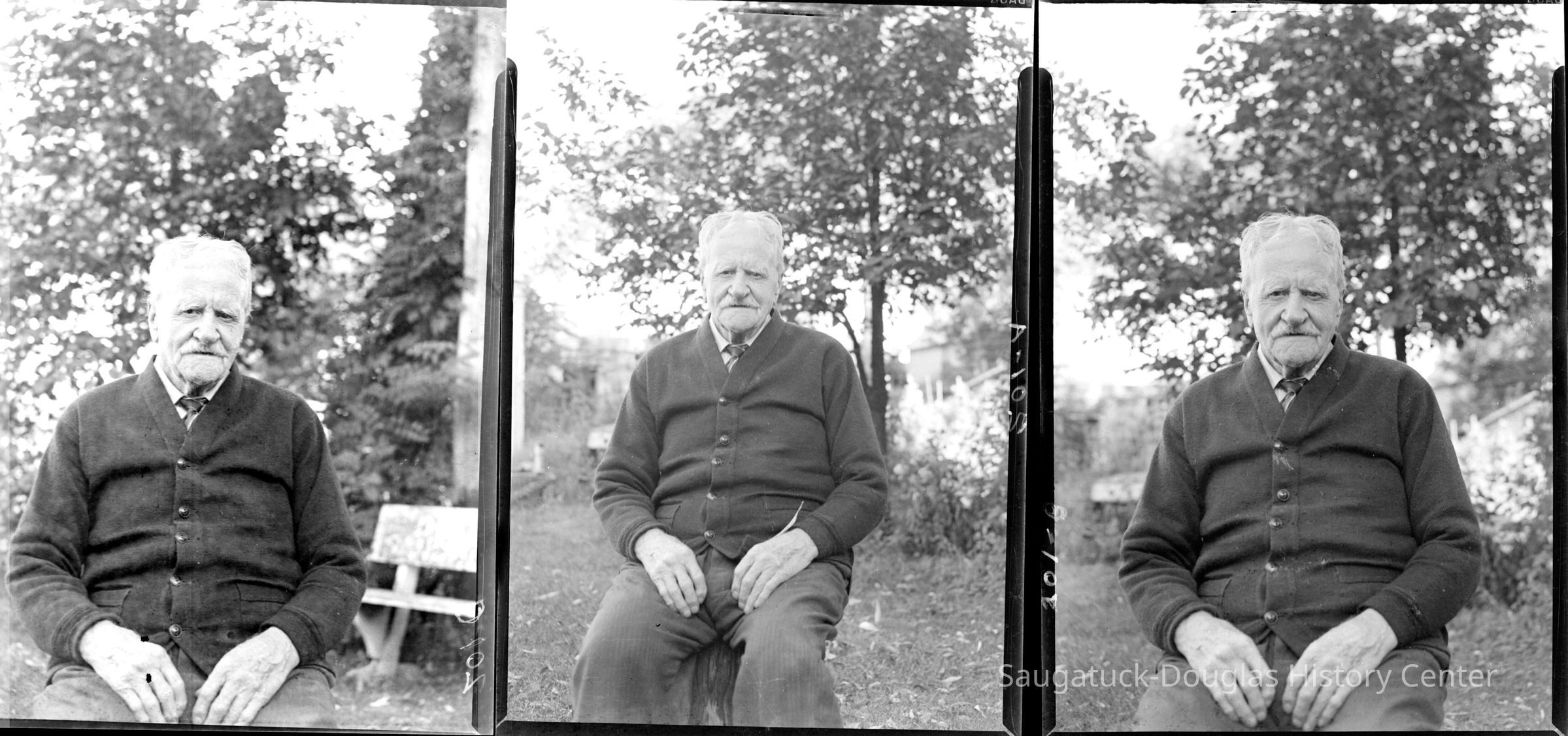 Stephen L. Newnham, a venerable man in his 90th year, sits in a harden wearing a dark cardigan sweater.