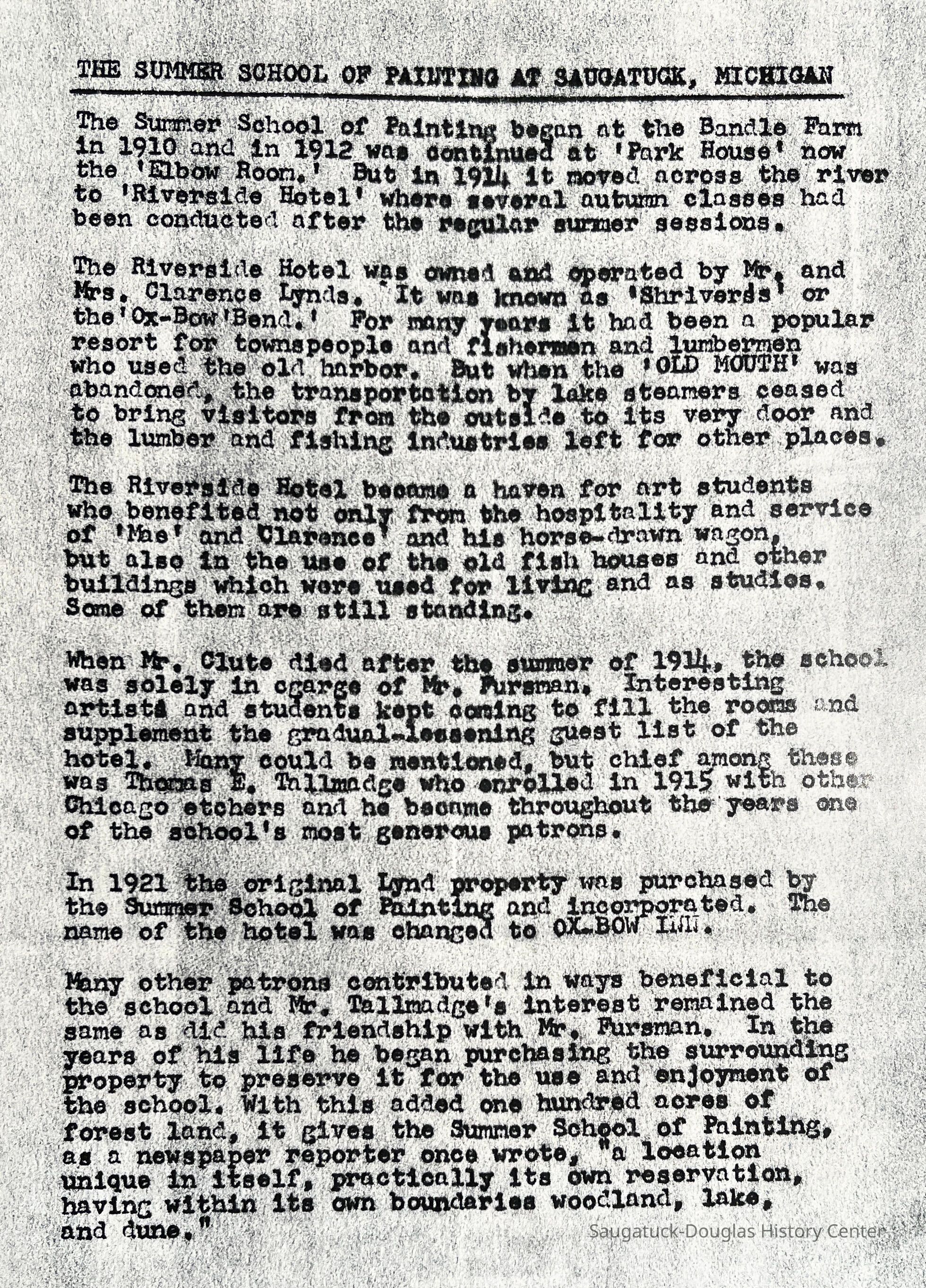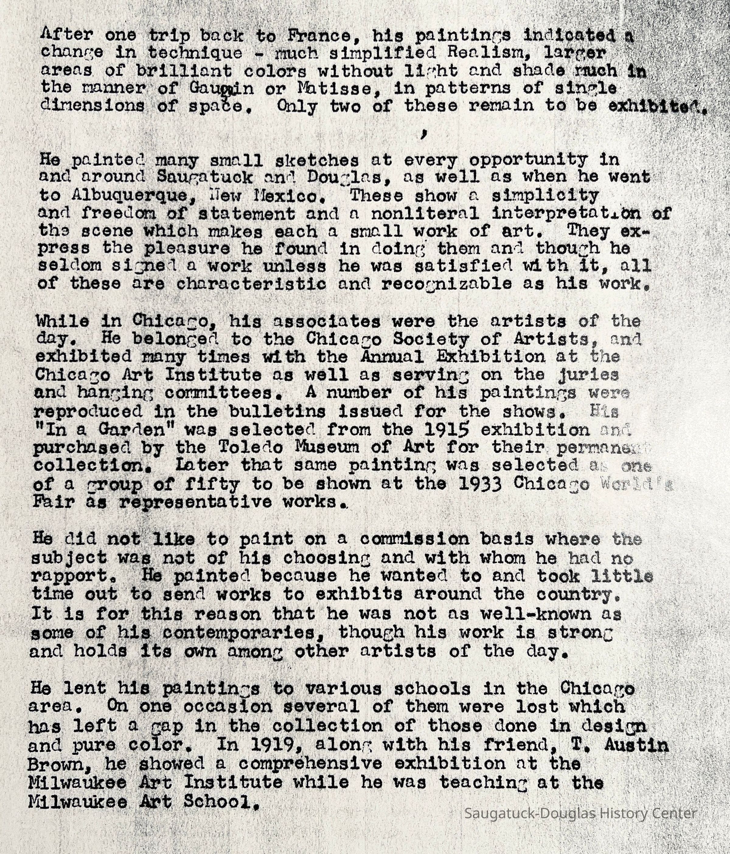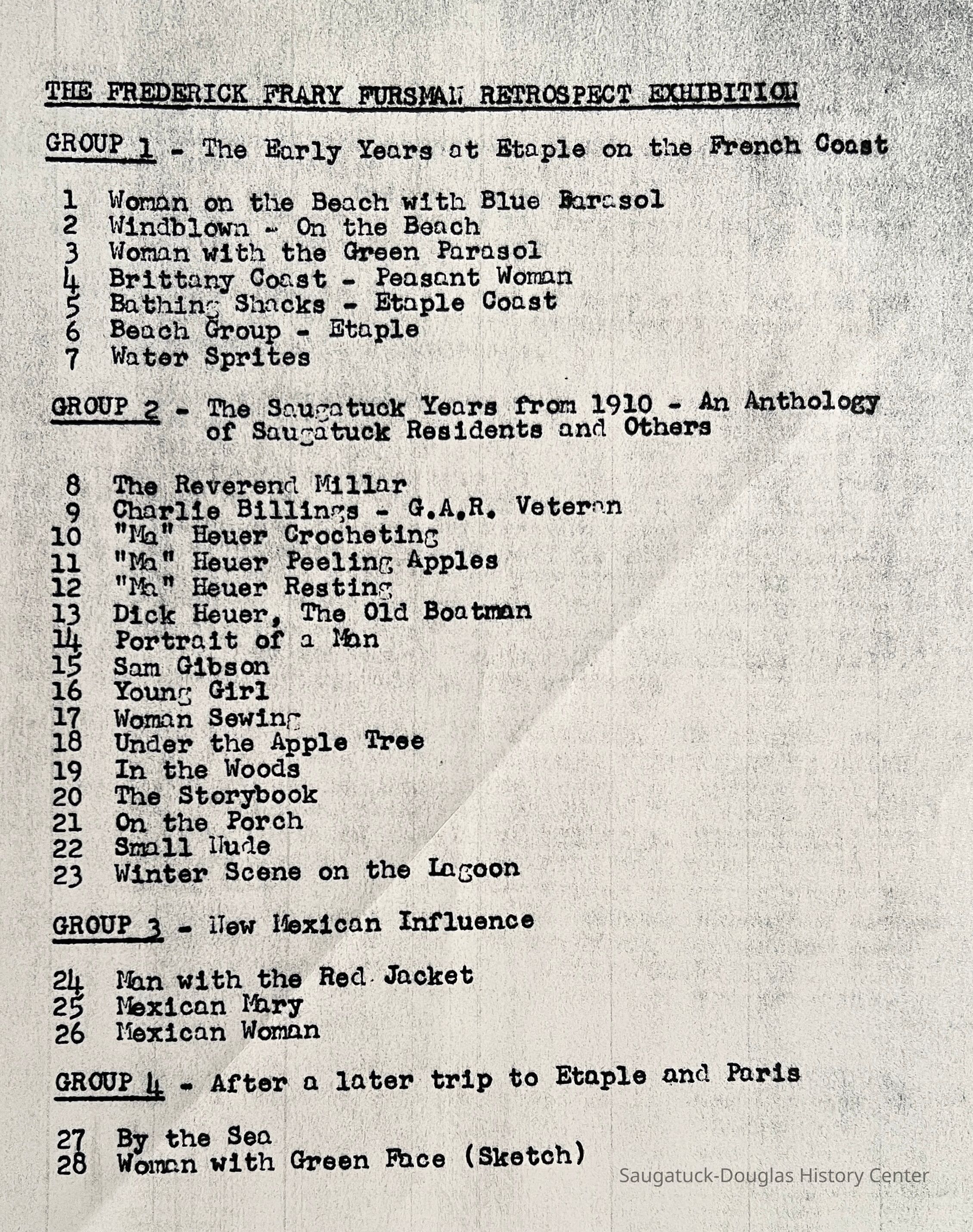Saugatuck Woman's Club 1904-presentAllen, Celia Martin (House) 1921-2007/8Deam, Arthur "Art" Francis 1895-1974Deam, Thyra (Sonderberg) 1900-1977Pen, Rudolph T. 1918-1989Fursman, Frederick Frary 1874-1943Rupprecht, Isobel Steele (MacKinnon)Rupprecht, Elizabeth "Betsy" c1932-2018Mason, Alice (Colb) 1895-1977Hart, Pearl M.Ulbricht, Elsa 1885-1980Frederick F. Fursman Art FoundationFrick, Arthur CharlesStearns, Fred 1885-1967Taylor, Cora Bliss 1889-1986Goldsmith, Jean D.Turner, Ruth 1892-1975Polka, John 1930-2006Bode, Marian 1918-2005Duggan, JamesHeuer, John Deitrich "Dick" 1844-1925Billings, Charles Clark 1843-1924Millar, George B. 1850-1931Gibson, Samuel C. 1866-1925Heuer, Anna Catherine (LeMong) 1850-1928