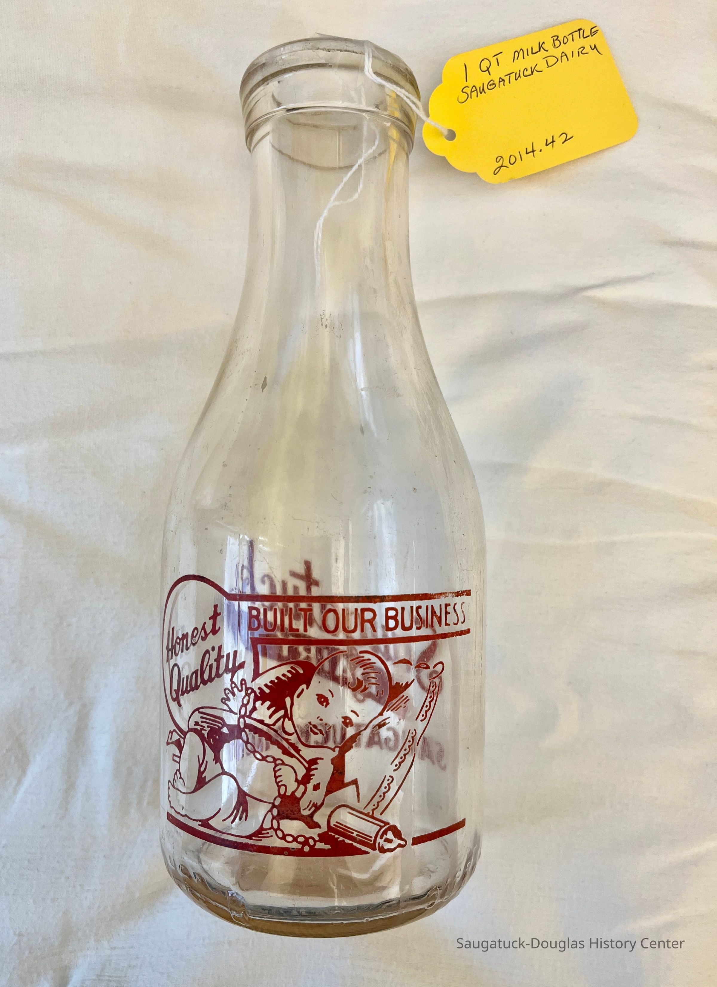 A one quart milk bottle with the words "Saugatuck Dairy, Saugatuck, Mich" on one side and "Honest Quality Built Our Business" on the reverse side.