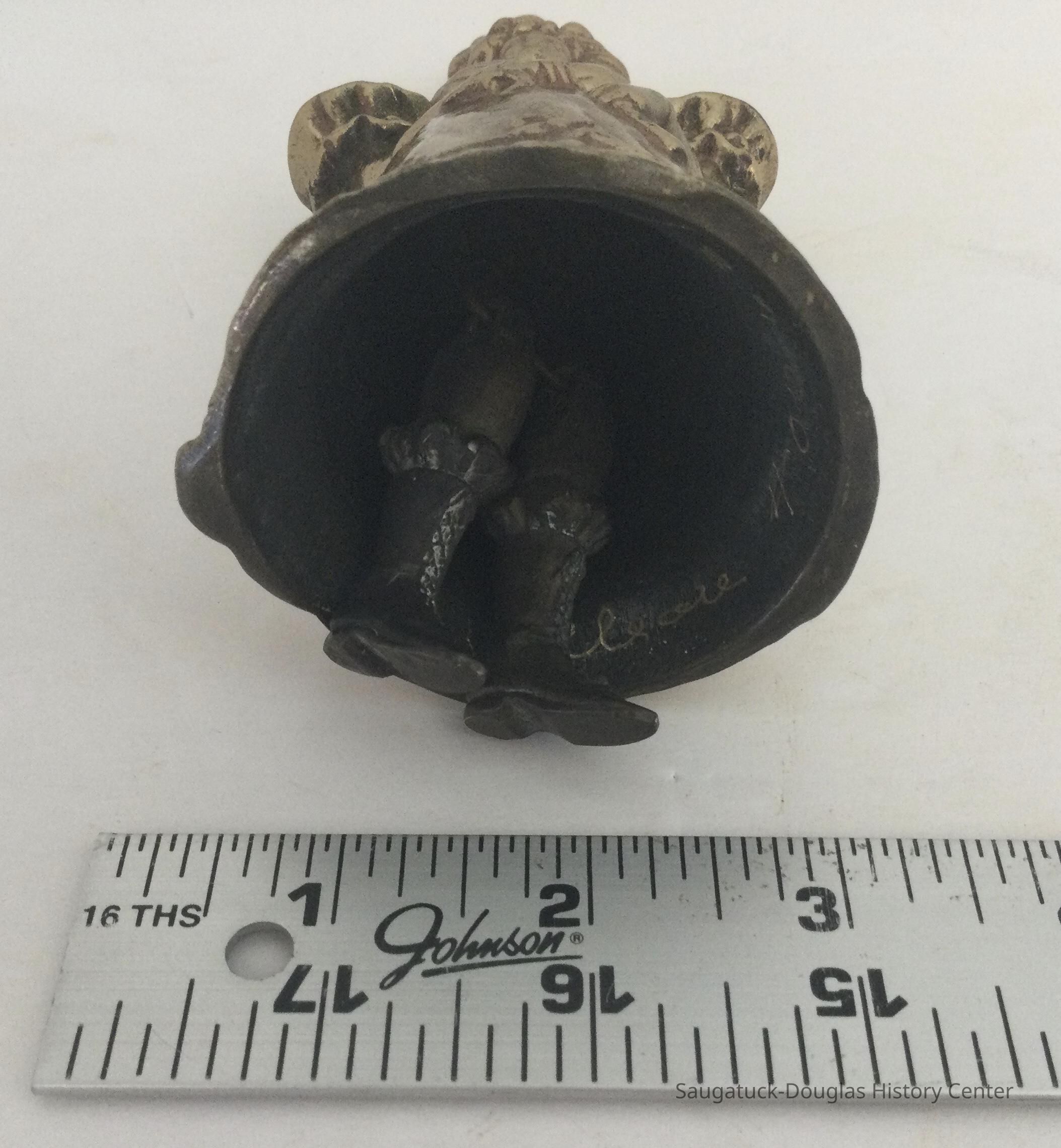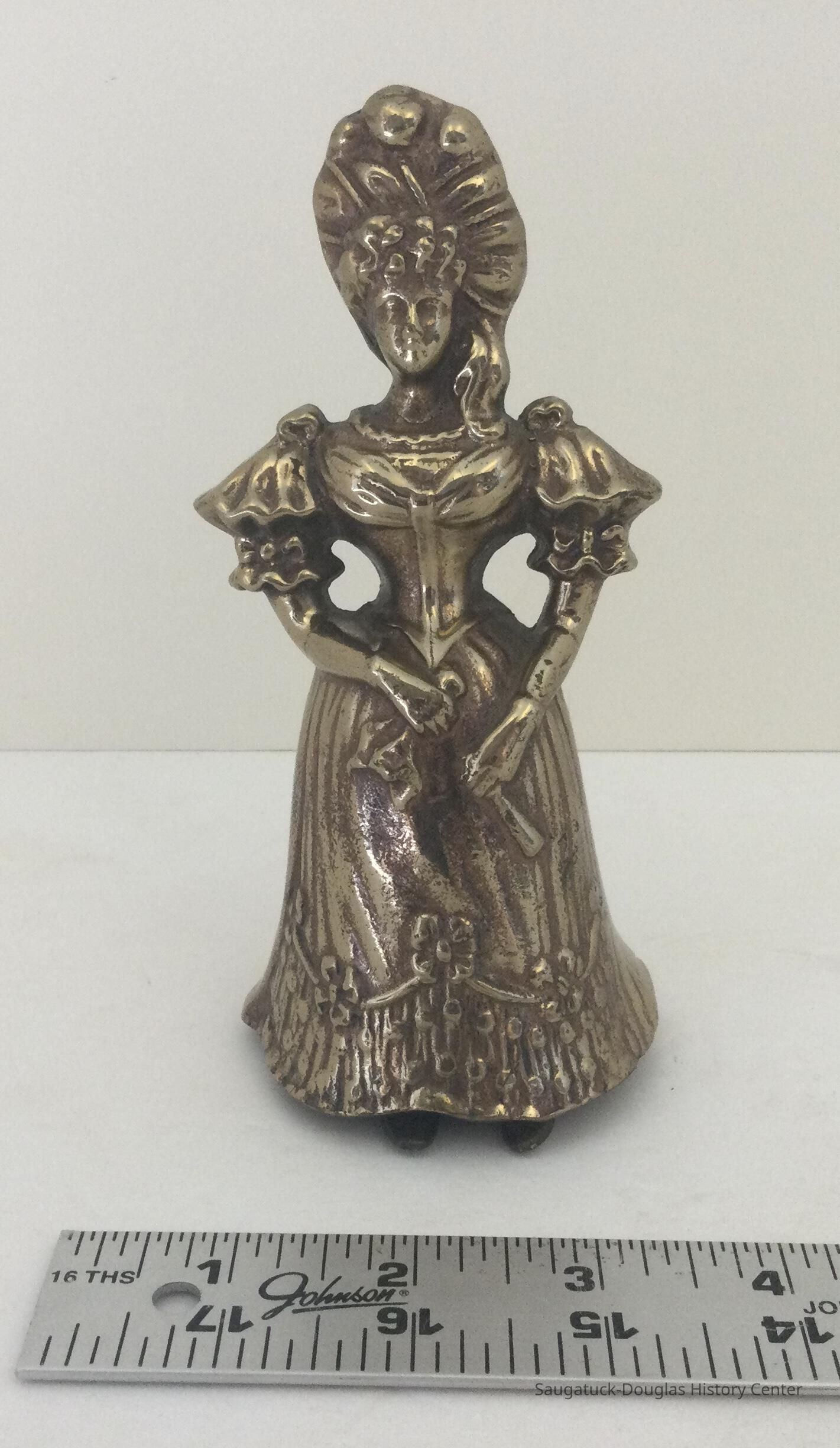 A brass bell in the shape of a woman - attached note said it was Becky Sharp from the movie "Vanity Fair." The bell was cast at the Valleau Studio located in Saugatuck MI. It is signed and dated #68/1000 - 1976