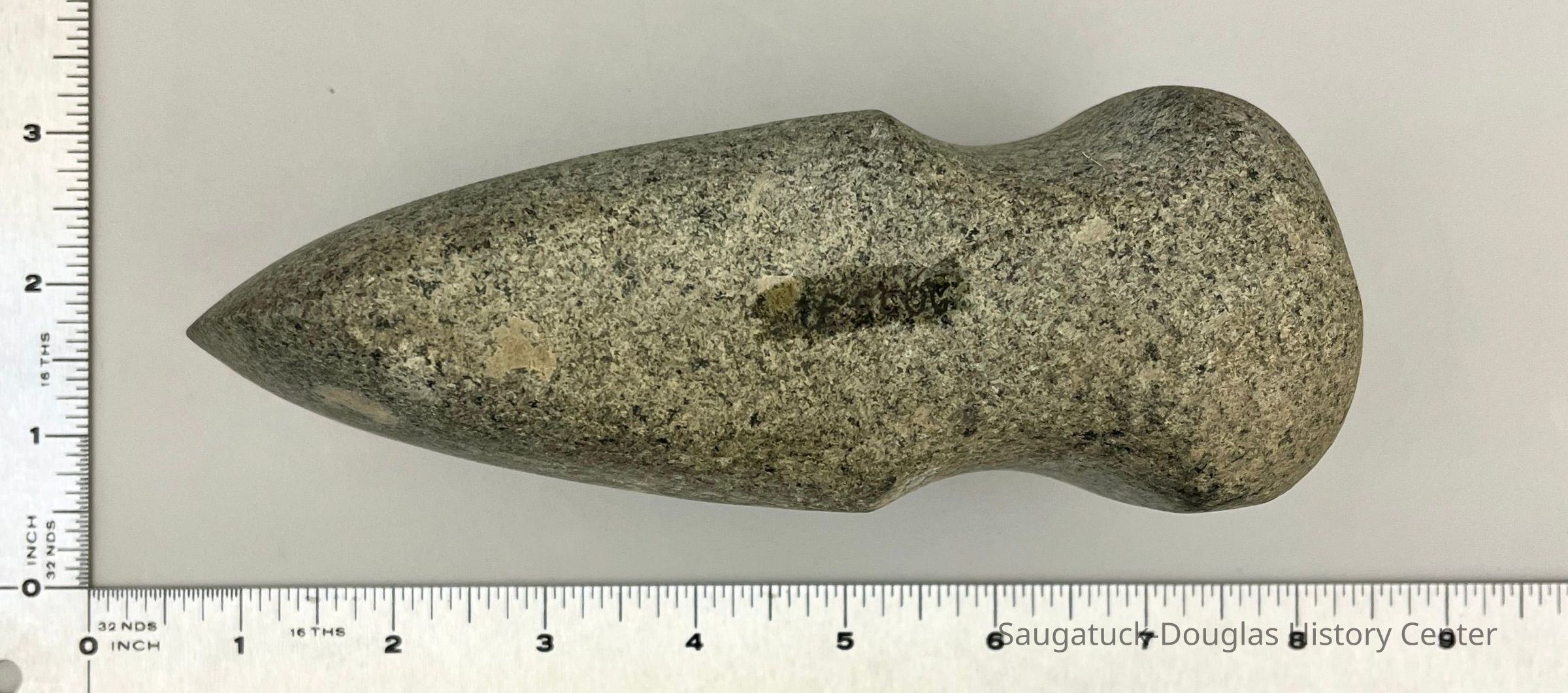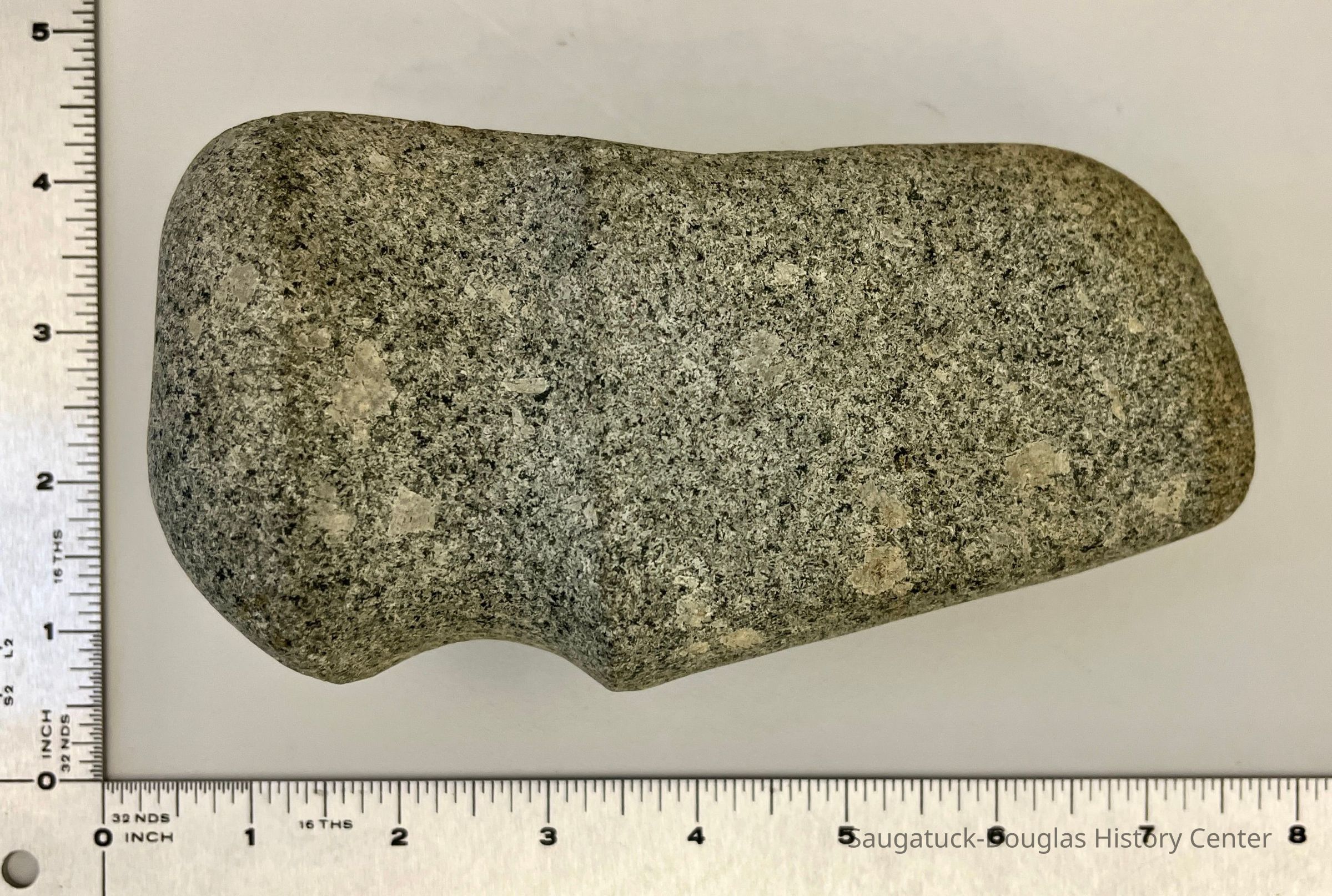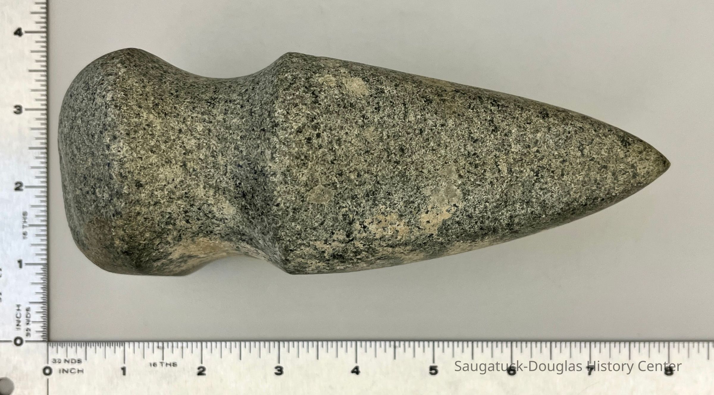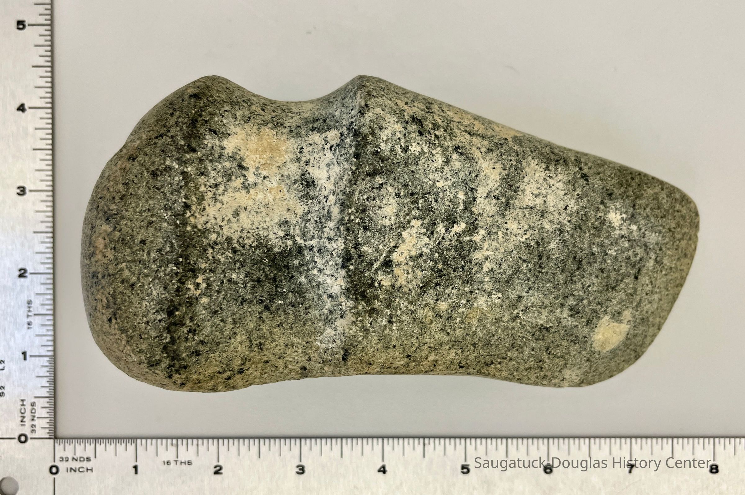 This artifact was found my Mike Economos along the banks of the Kalamazoo River near his home at 716 Park Street as he was searching for stones to use in his garden. Mr. Economos recalls he found the object around 2020. It is thought to be of Anishinabek origin. If so, it is evidence of local Anishanabek activity.