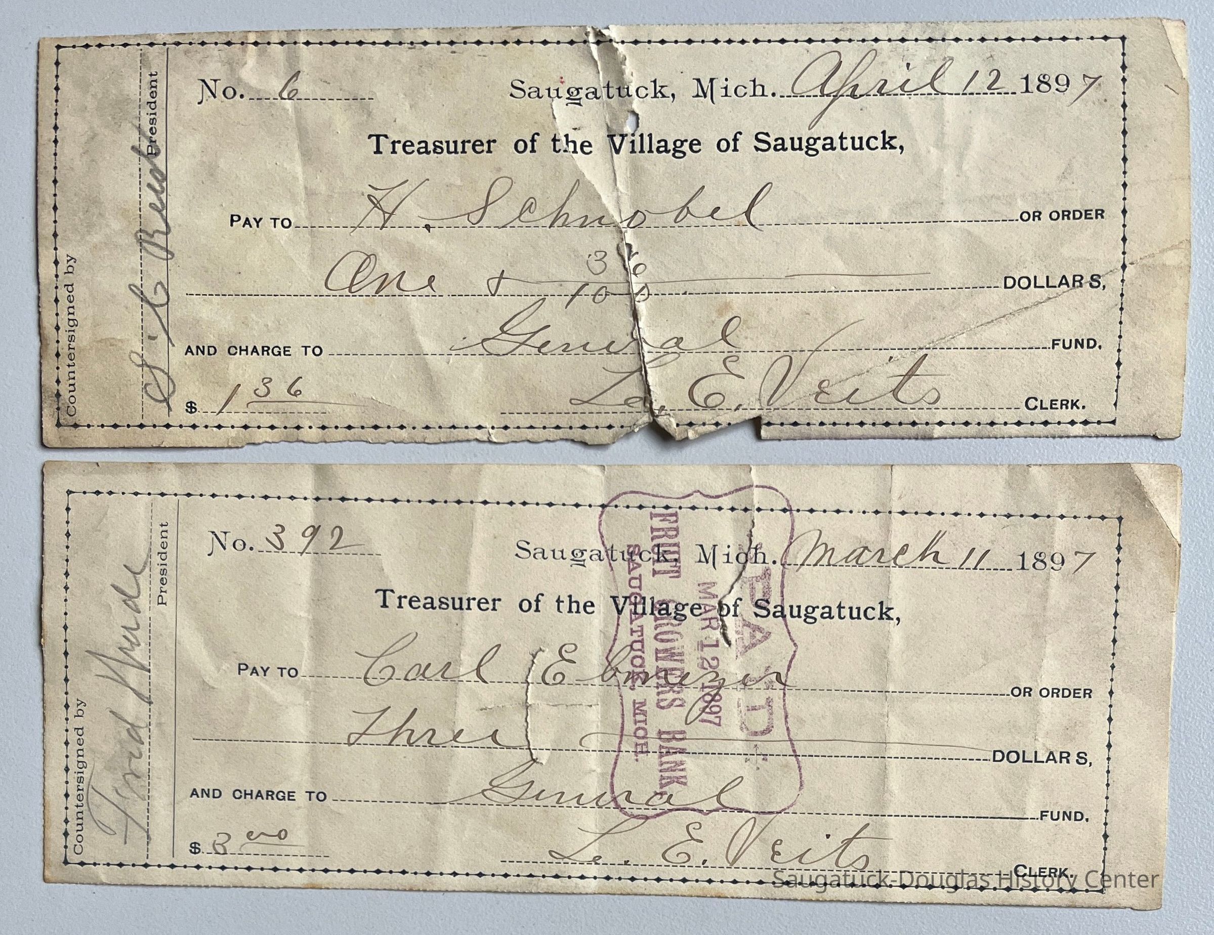 C. Two loose checks from 1897 and signed by clerk L.E. Veits.