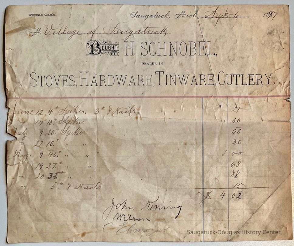 L. Invoice from H. Schnobel Hardware to Village of Saugatuck for nails and spikes.