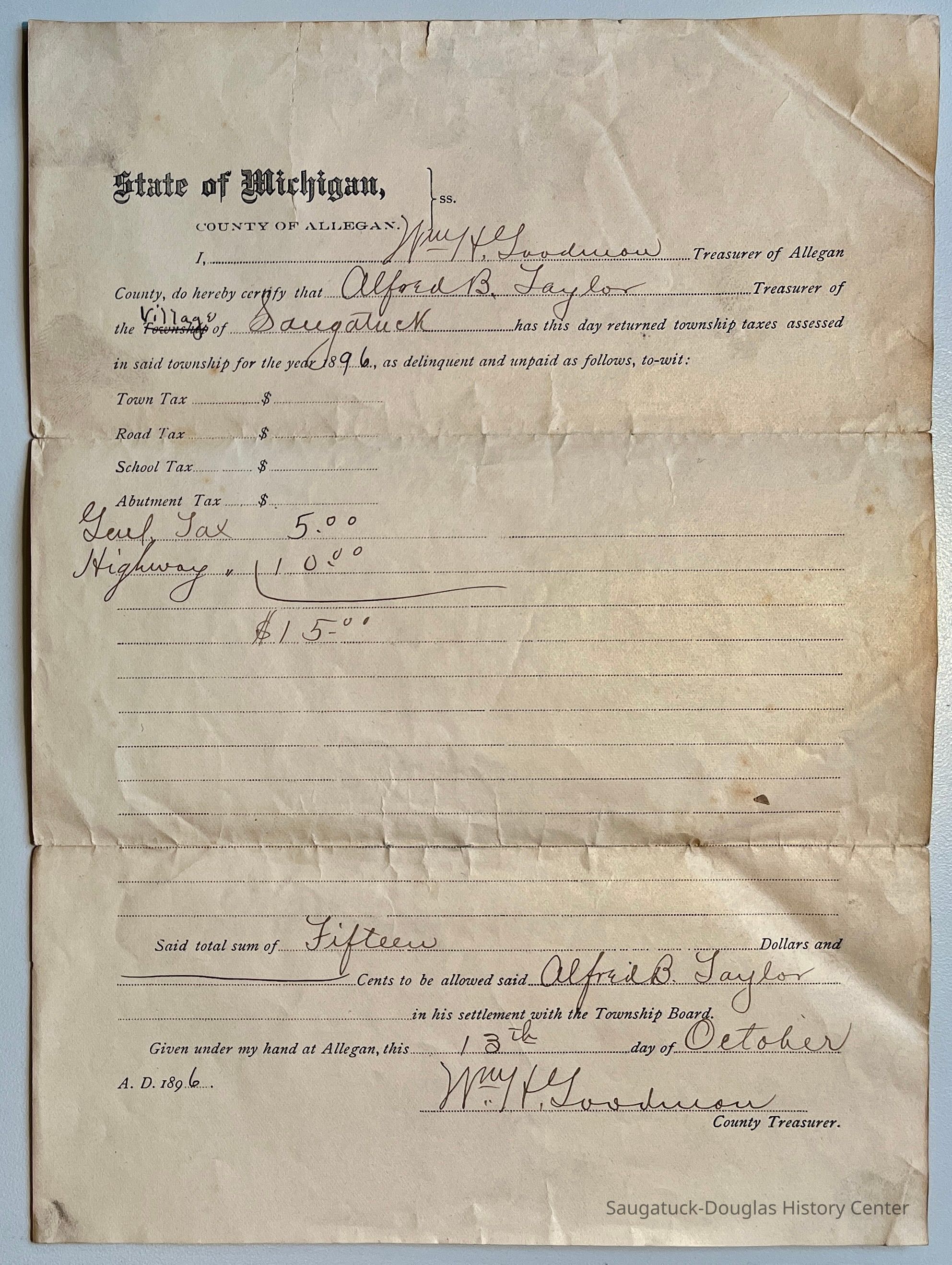 M. Receipt for payment of State of Michigan, County of Allegan taxes signed by Saugatuck's treasurer A.B. Taylor.