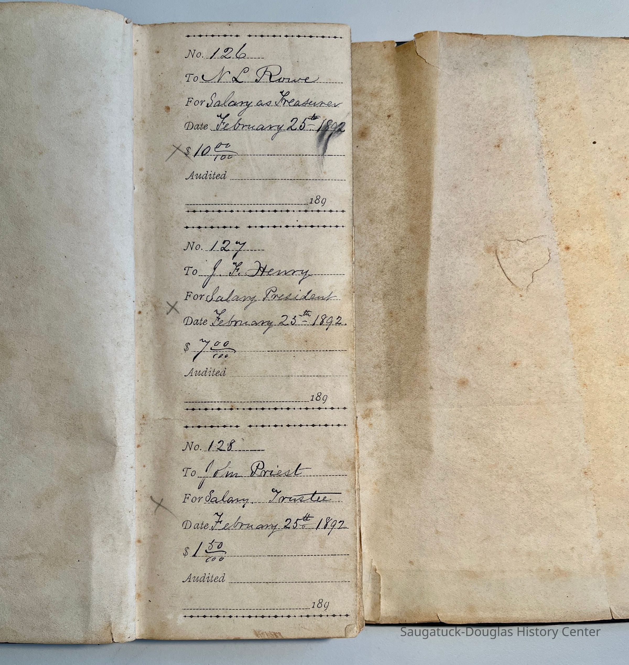 D. 8.5x11" black-fabric-covered Saugatuck Village (presumed) check book with only receipts remaining that records payments from 1892-1895. Typical payments include to C.C. Billing for hauling, salaries for R.B. Newnham and A.B. Taylor, to John Hirner for building sidewalks, to the Walz brothers for tallow, to Doc Heath for team work, to multiple payees for street work, hauling and removing garbage.