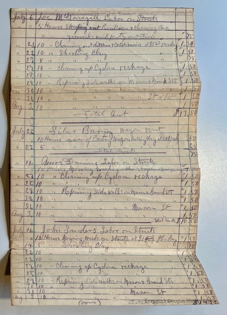 N. Overseer of Highways Report of road work list. 27.5x8.5" This long document also includes other expenses like plank sidewalks, cleaning up cyclone wreckage [1896], keeping the fire going in the school building and sawing stove wood for Village Hall.