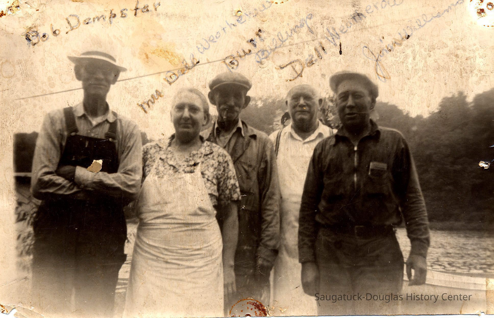 Two photos of people on a dock. The Weatherows are wearing white aprons as if they are cooks or restaurant staff.