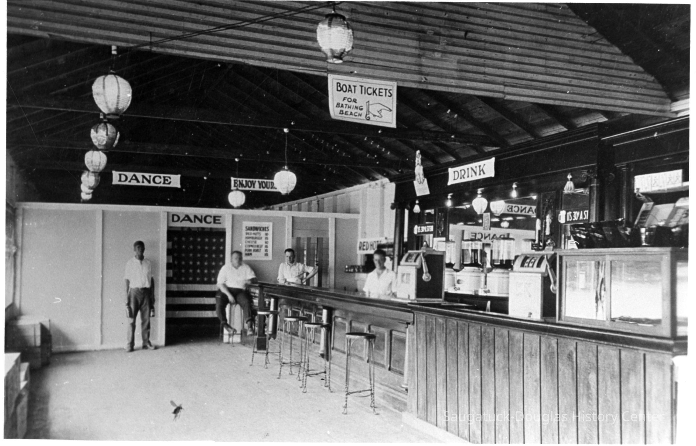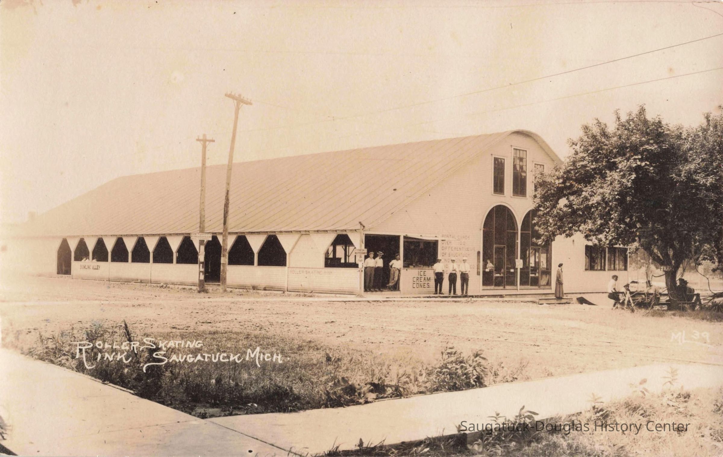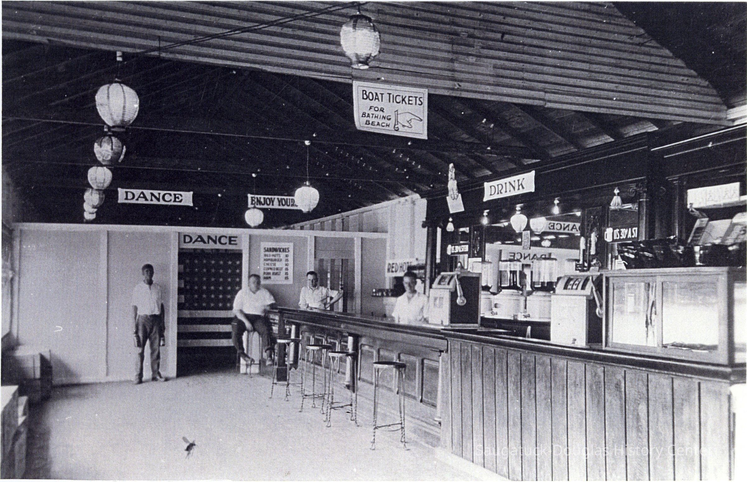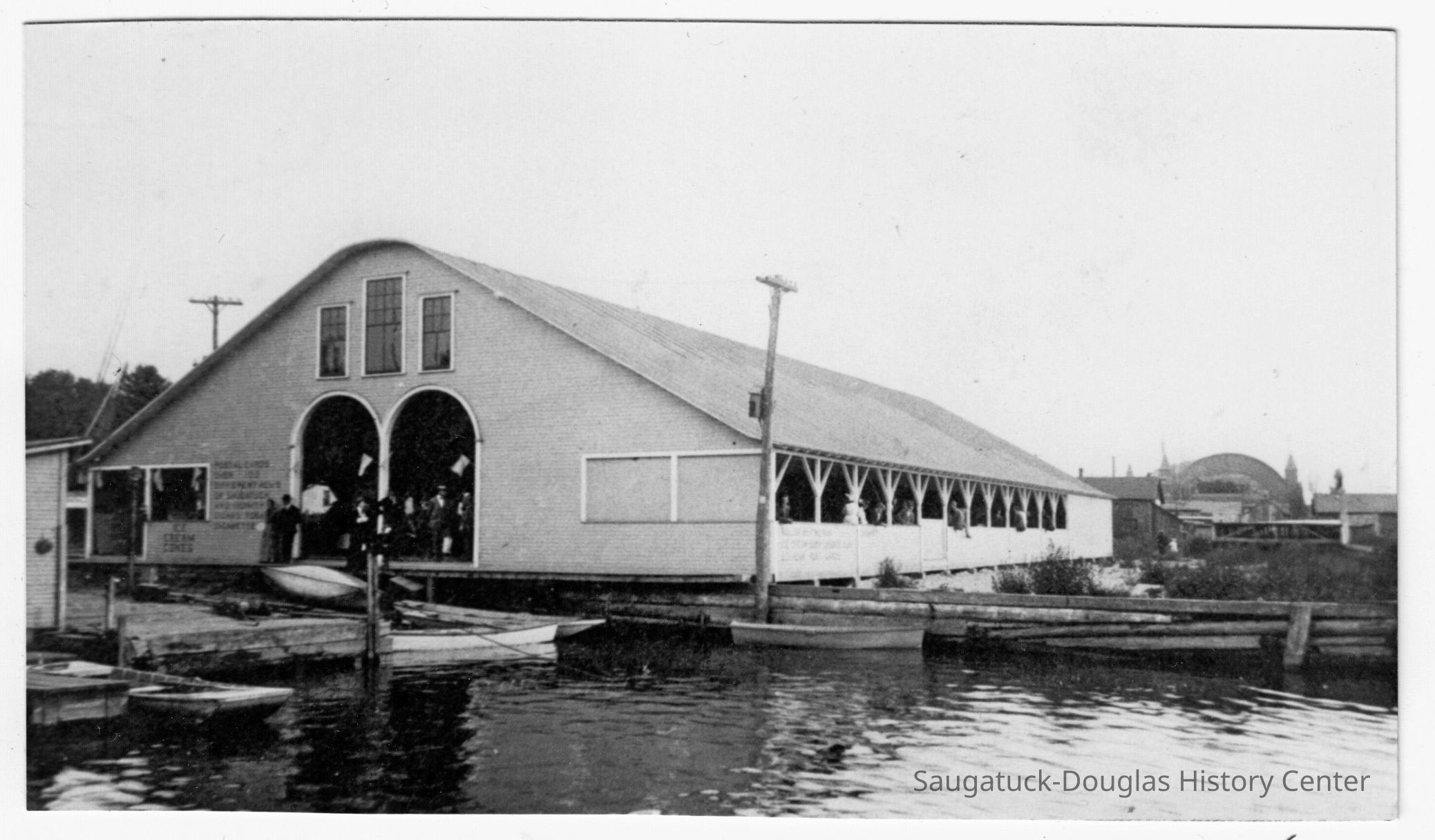 These images were gathered for use in the SDHC publication "The Big Pavilion, The Brightest Spot on the Great Lakes" by Kit Lane, 2009 This image was featured as History Mystery #89 with the solution: The east side Pavilion, next to the ferry landing, was completed in the face of the Big Pavilion competition in 1909. During its twenty year life, It was a dance hall, skating rink, high school basketball court, and steamer terminal. The site is Wicks Park today