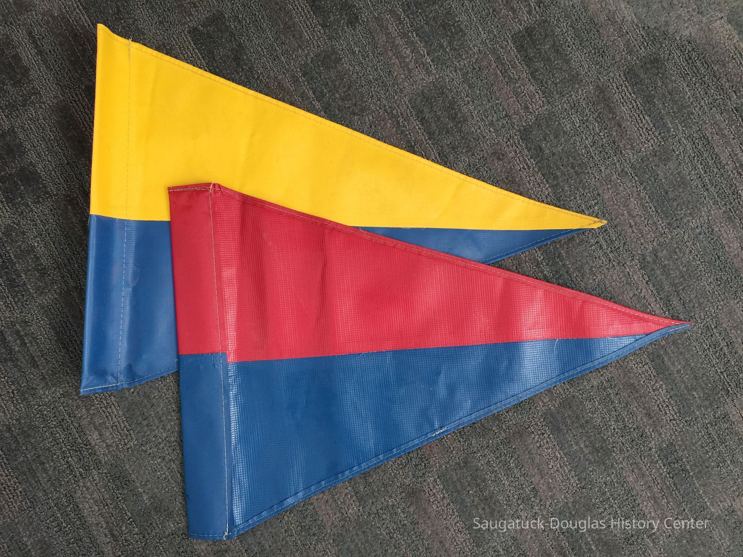 Pair of triangular flags, stitched from two colors of waterproof, heavy vinyl fabric. Flags attached to the buoy's wooden shaft with a stitched pocket that is open on the bottom edge of the flag.
