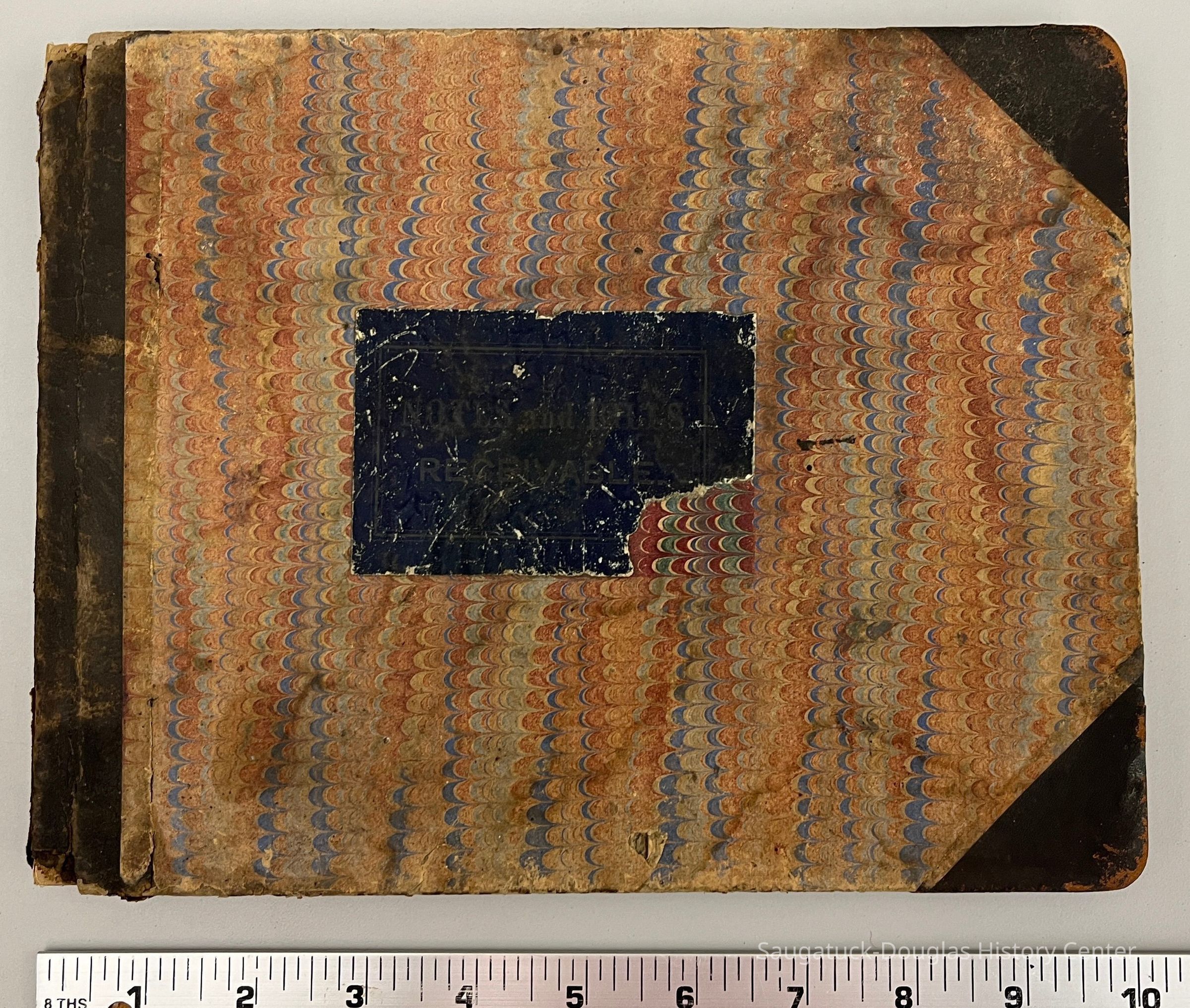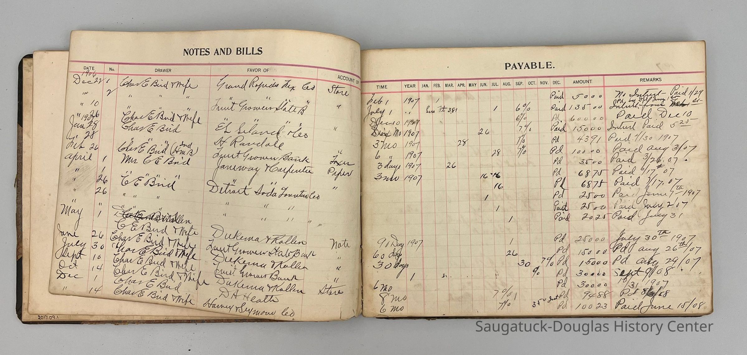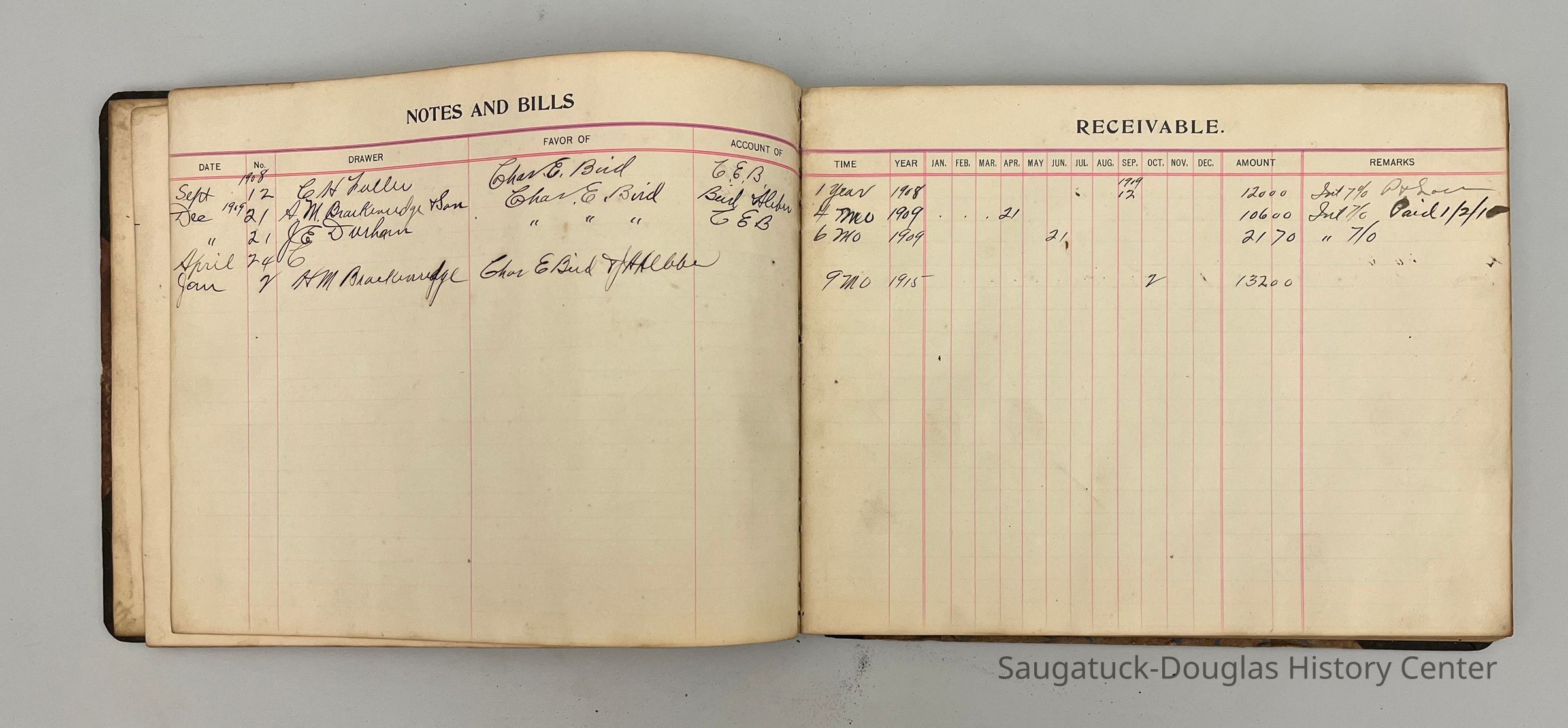Two-sided Notes and Bills Receivable/Payable ledger. The ledger has two covers and no traditional front and back. One cover is for Payables, the other for Receivables. The accountant flipped the ledger 180 degrees to updated the different tallys. Circa 1906-1915