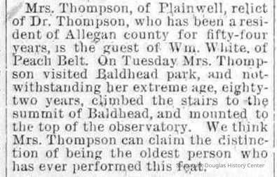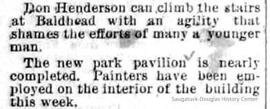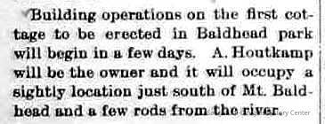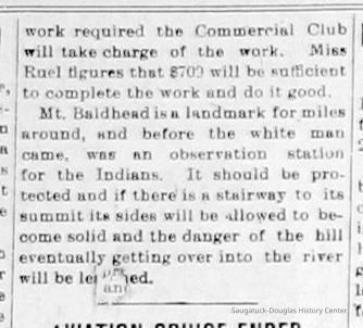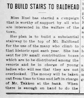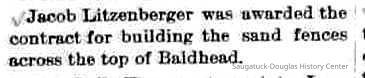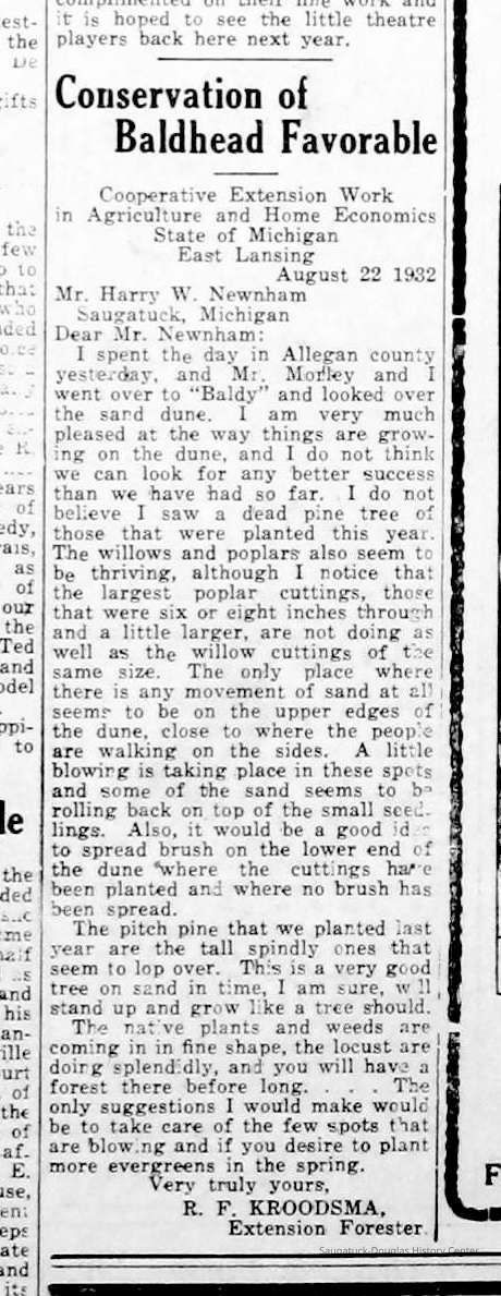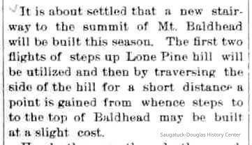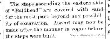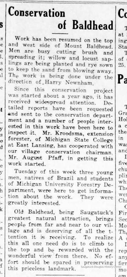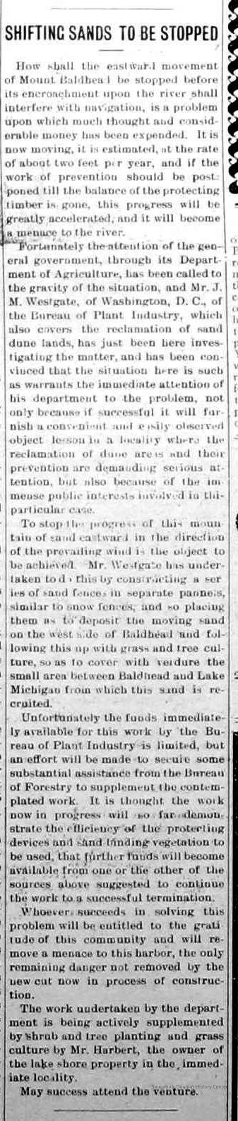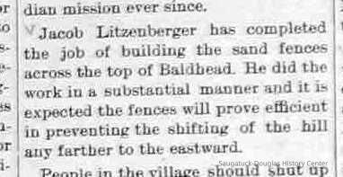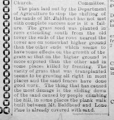 Also clipping about the various stairs and towers built on Mt. Baldhead, the camping grounds and picnic pavilion at the base of the dune, efforts to control the drifting sand, observations, visitors, and early "Park Pointers" articles.