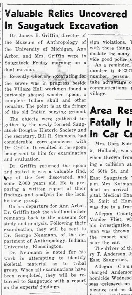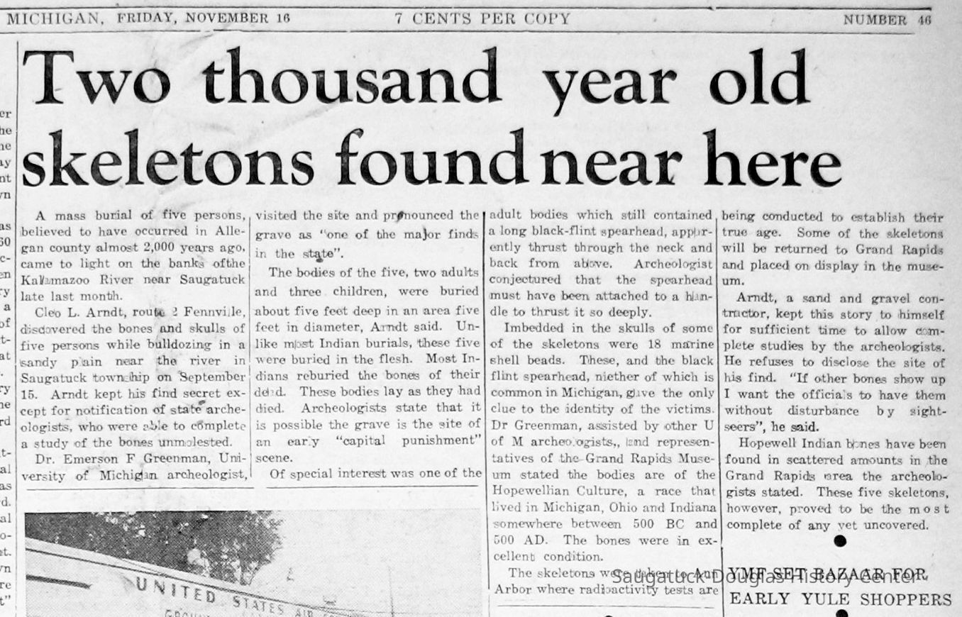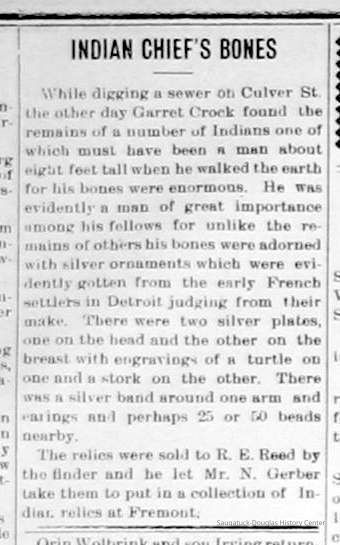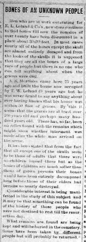 "E.L. Leland & Co. of Saugatuck is getting ready to erect a new store building just south of the Saugatuck post office, on the old Stephen Morrison property. In excavating for the basement work men uncovered the skeletons of nearly 30 Indians that must have been buried from 75 to 100 years, as Mr. Morrison came to that vicinity in 1836. The Indians were buried in a sitting posture, the bones being very large and in perfect condition. They will probably be buried elsewhere." -- Holland City News/The Holland Sentinel, Thursday, Feb. 28, 1097