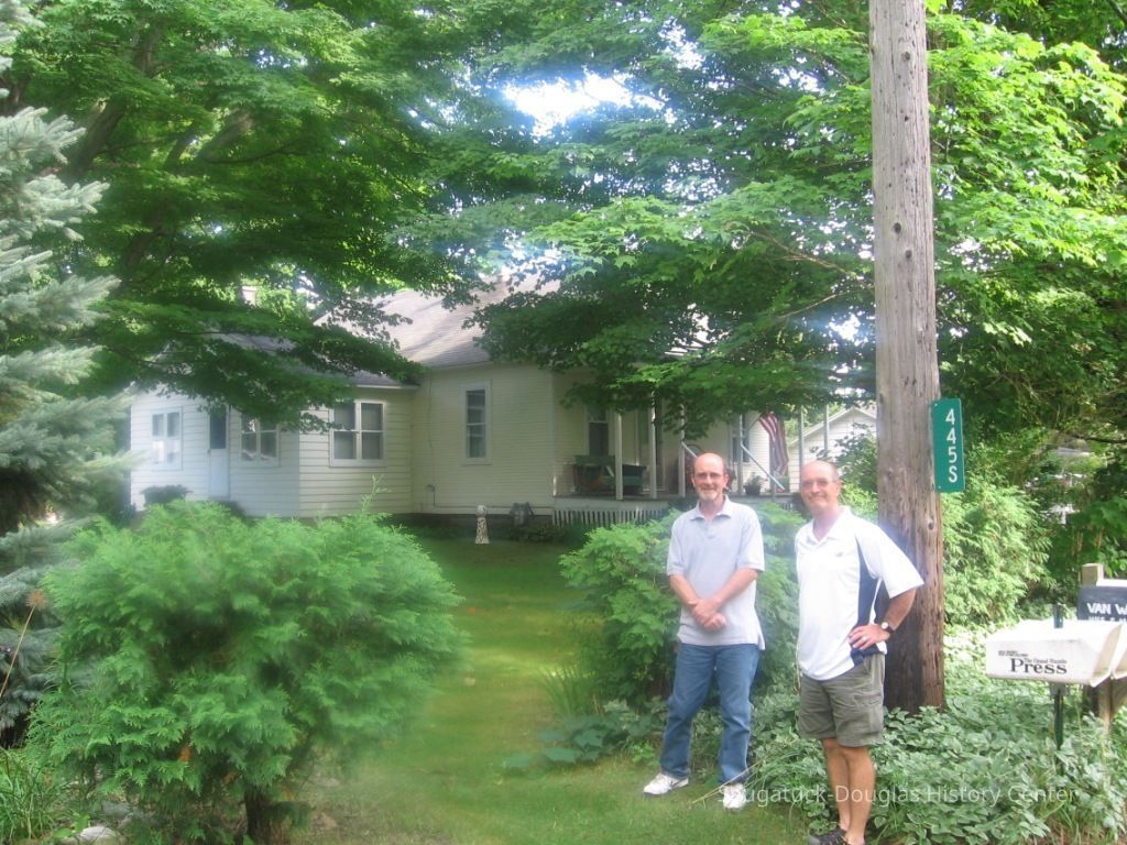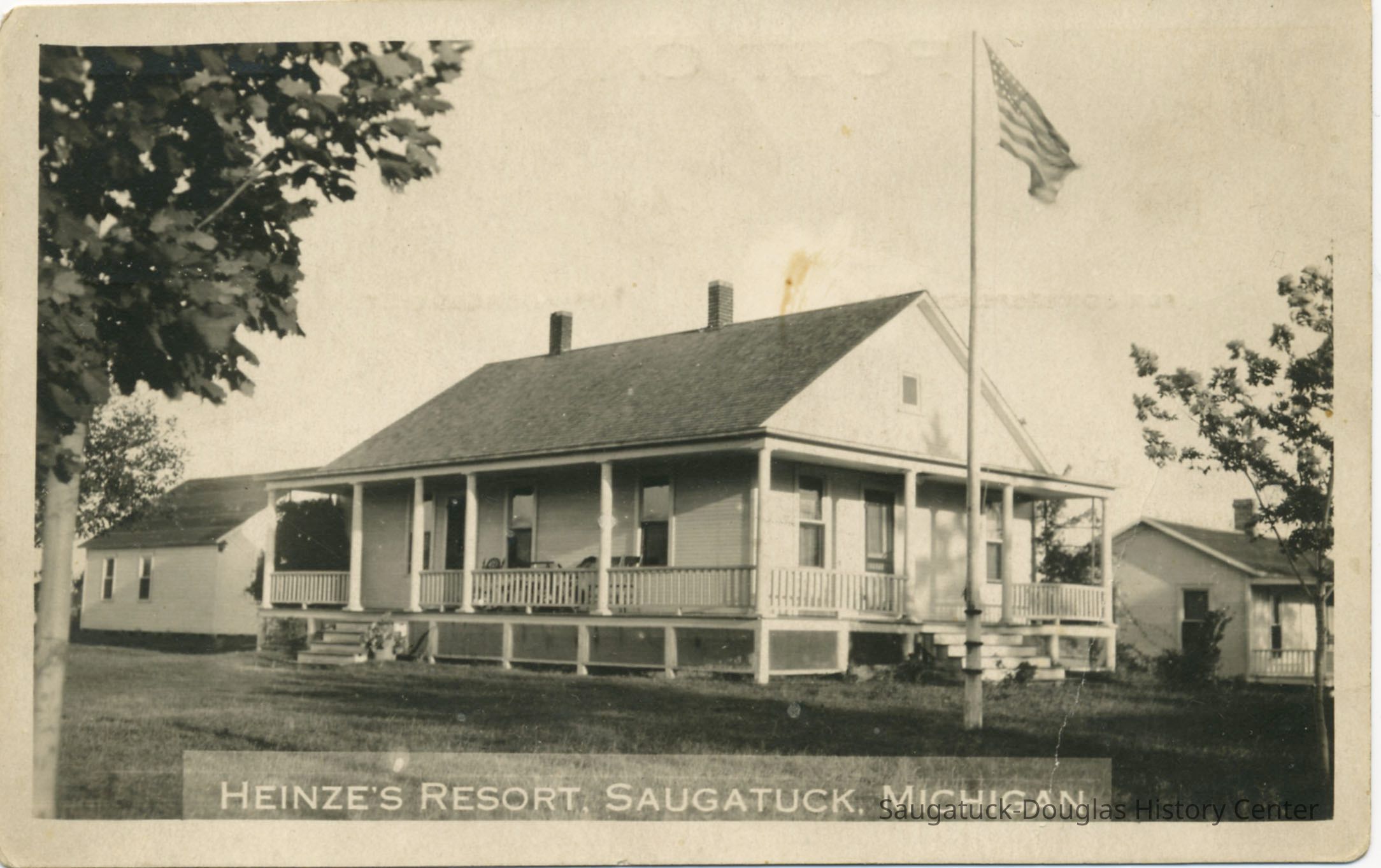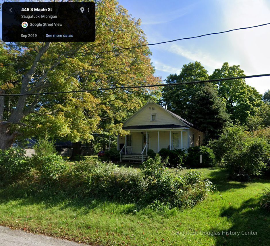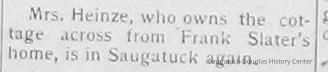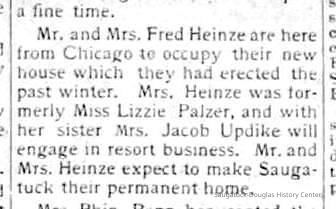 "Heinze's Famous Resort", located at 445 S. Maple, was built by Fred and Lizzie (Palzer) Heinze in the winter of 1911-12. Lizzie was a daughter of 1857 Saugatuck settler Herbert Palzer and had been born in Saugatuck in 1865. Fred would pick up clients from Chicago at the dock in Saugatuck. He would taxi the guests where they wished during their stay. Elizabeth would cook and do housekeeping, it was said she did most of the work. Their resort operated for nearly 20 years and closed in the early 1930s when Lizzie's health began to deteriorate. She died in 1938. Fred spent the remainder of his years cultivating dahlias at his home on South Maple and died in Chicago from injuries resulting when he stepped in front of a car in 1951 at the age of 92. Frederick Anton "Fritz" Heinze was the youngest son of Johann Daniel and Fredericka (Hoffer) Heinze who emigrated from Eisfeld Germany in 1865. Johann was a master soap maker and the family settled in Chicago. In 1871 their home burned in the great Chicago fire and they escaped with what they could carry. After the death of his first wife, Fred Heinze married Elizabeth "Lizzie" Palzer of Saugatuck on Aug. 24, 1908 in Chicago. They lived there several years before moving permanently to Saugatuck. Fred and Elizabeth rest in the Riverside Cemetery. (info. provided by Ray & Chuck Foster & Whitney Gulbrandson descendants of Fred's brother Emil. The Fosters are shown in the 2009 photo of the home.) -Submitted by Chris Yoder, Feb 2010