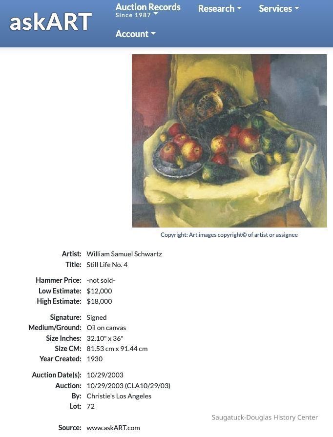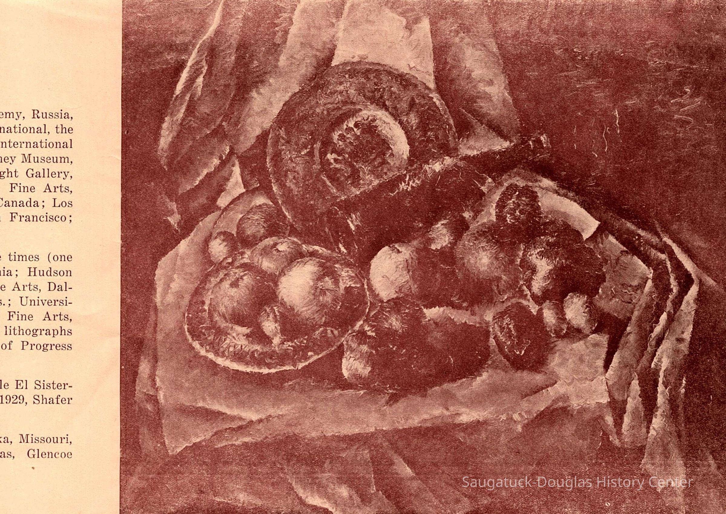 The other side of the page has a brown-ink image of a still life painting by William Samuel Schwartz (1896 - 1977).