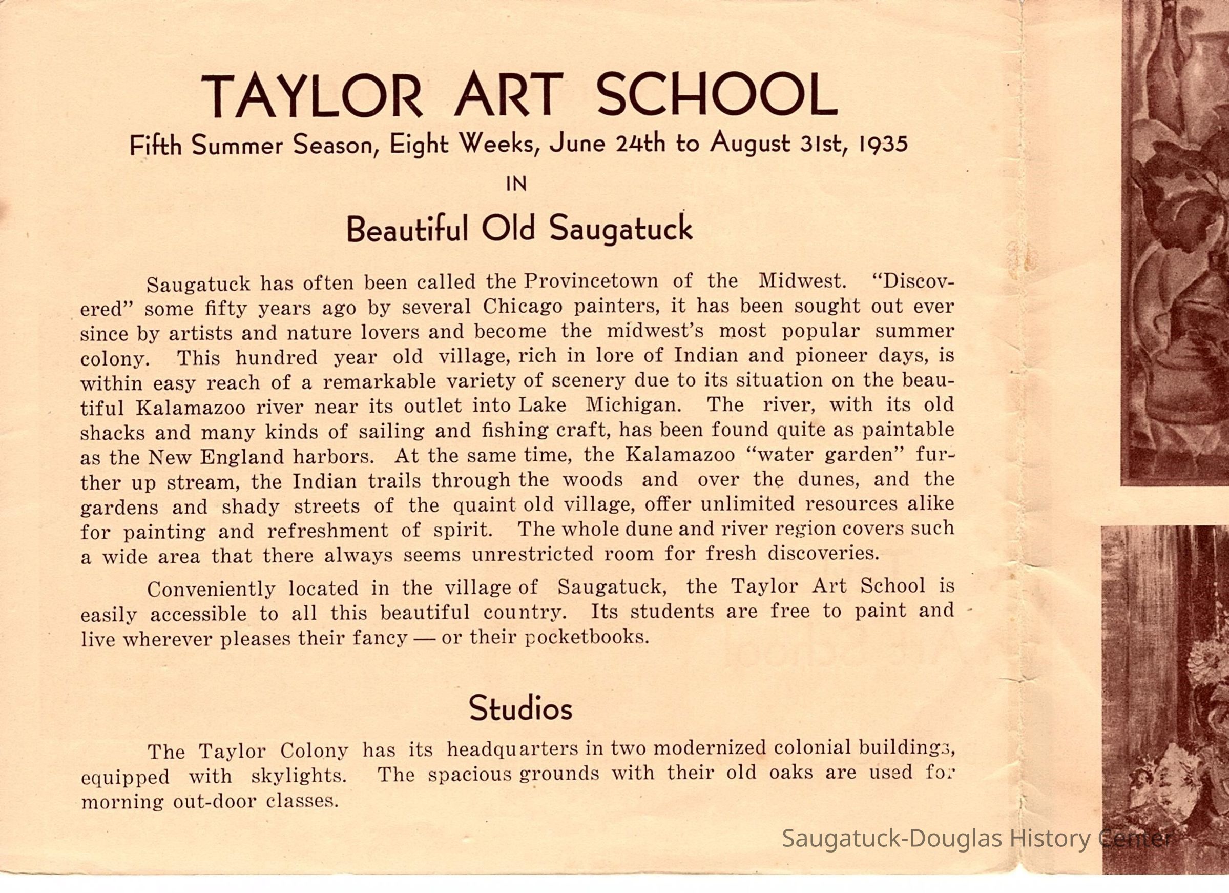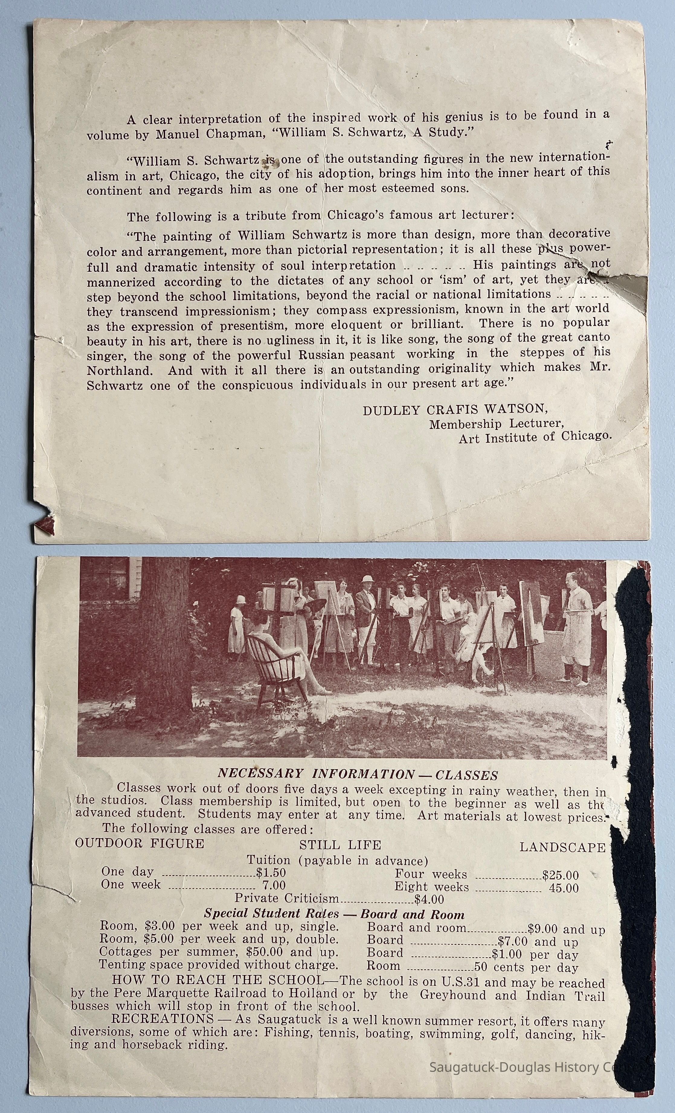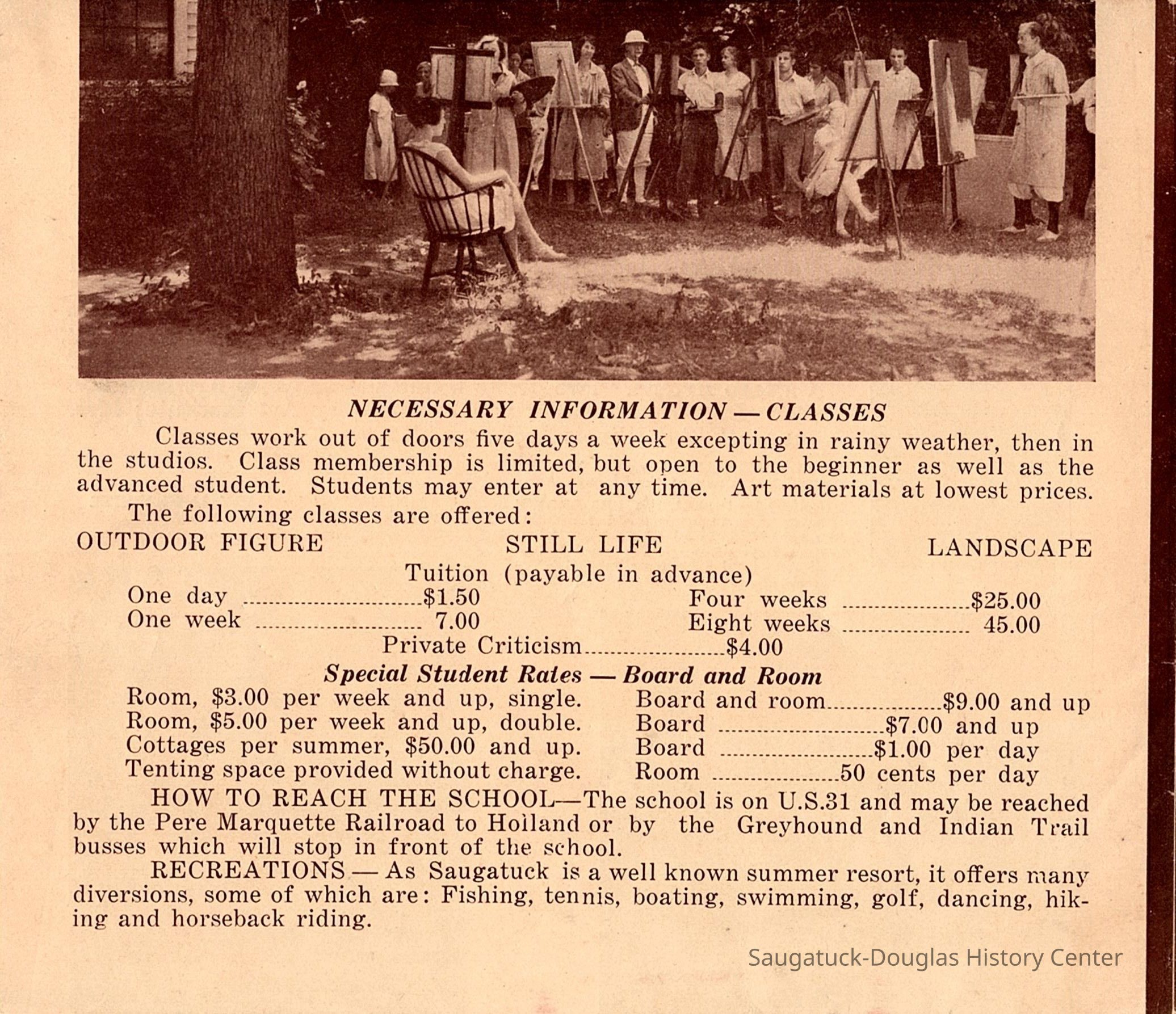 Page two has "Necessary Information -- Classes" describing tuition, transportation and recreations in Saugatuck. The school is described as being "on U.S. 31" and that buses will stop in front of the school. The top of the page has a Herman Simonson photo of artists painting at the Taylor Art Studio (see below).