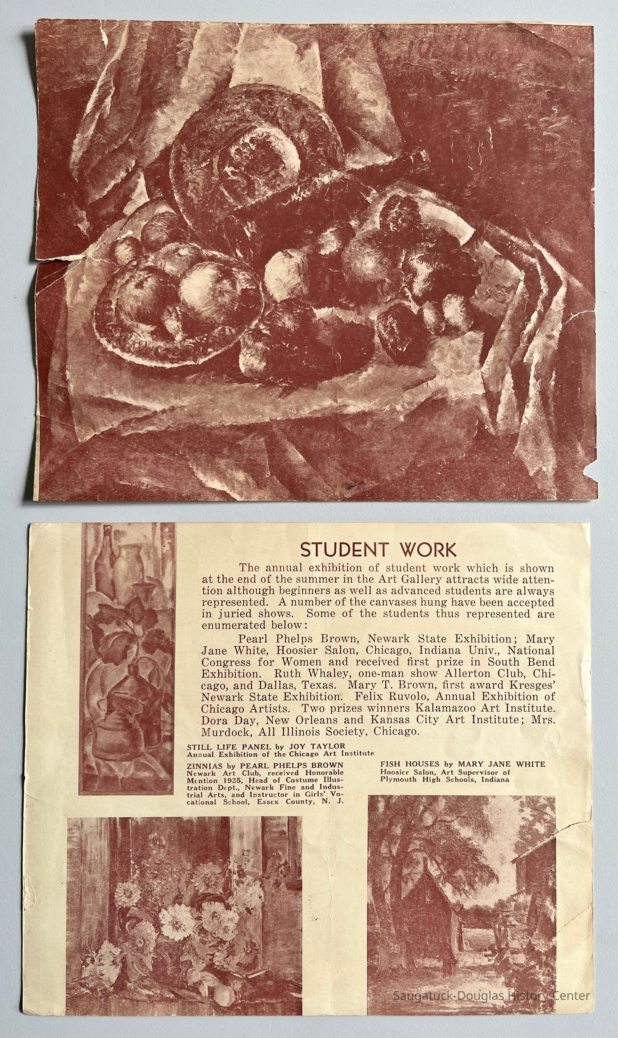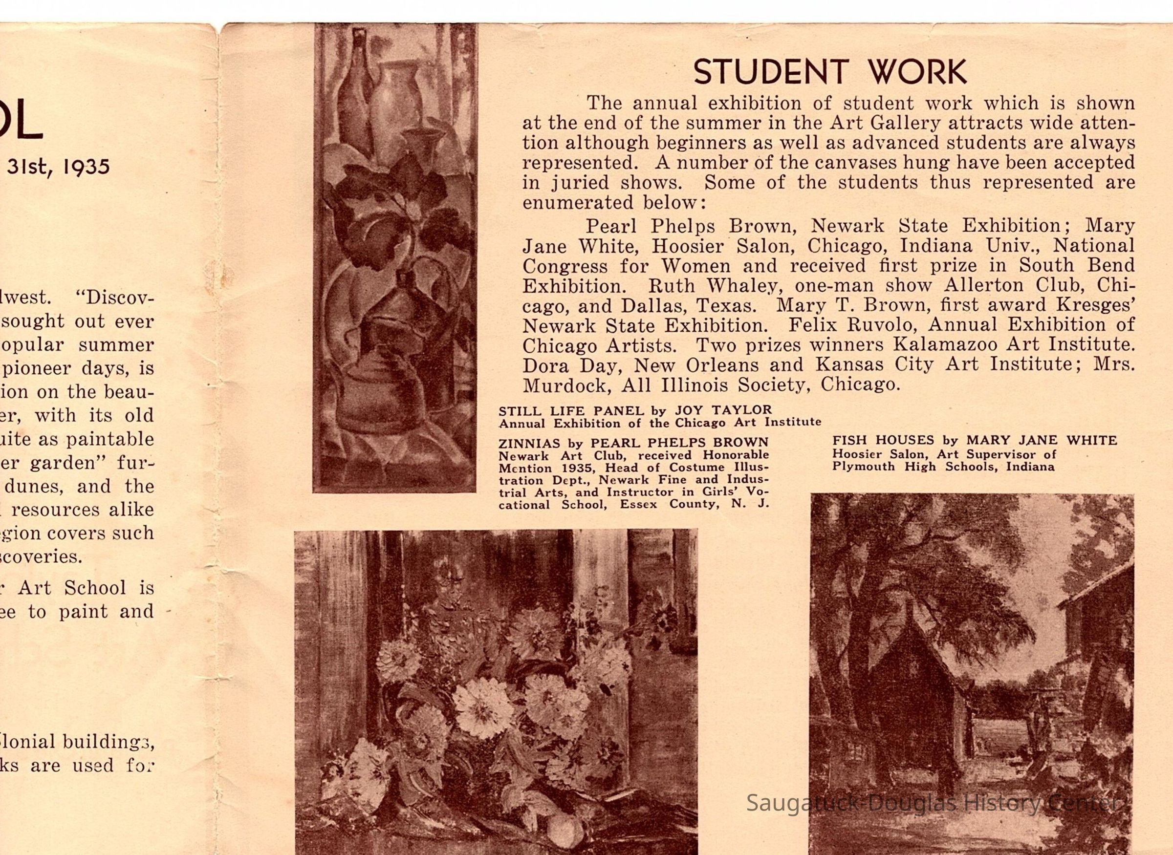 The other side of the page is titled "Student work" and mentions artists Pearl Phelps Brown, Mary Jane White, Ruth Whaley, Mary T. Brown, Dora Day, Mrs. Murdock and photos of paintings by Joy Taylor, Pearl Phelps Brown and Mary Jane White.