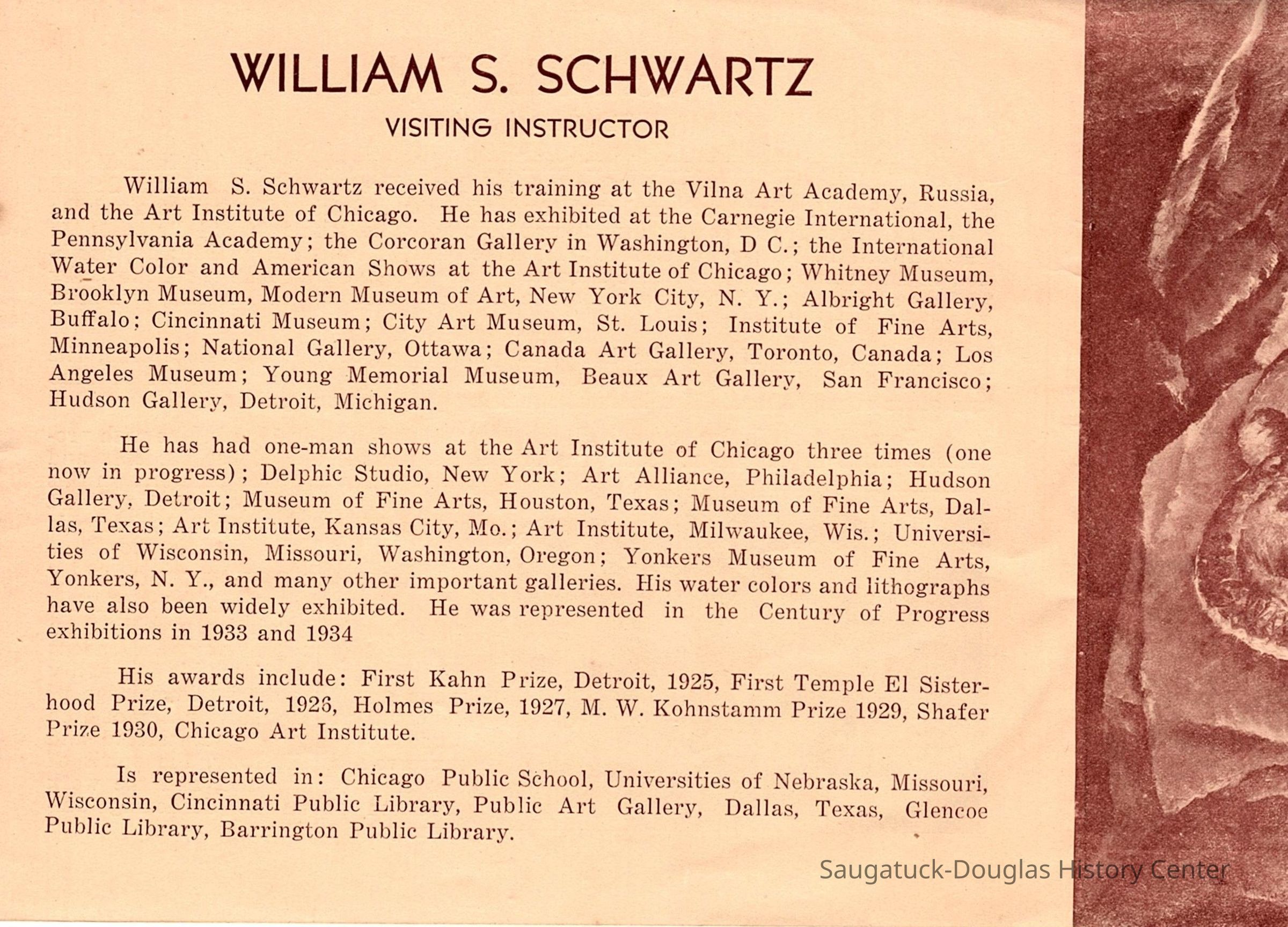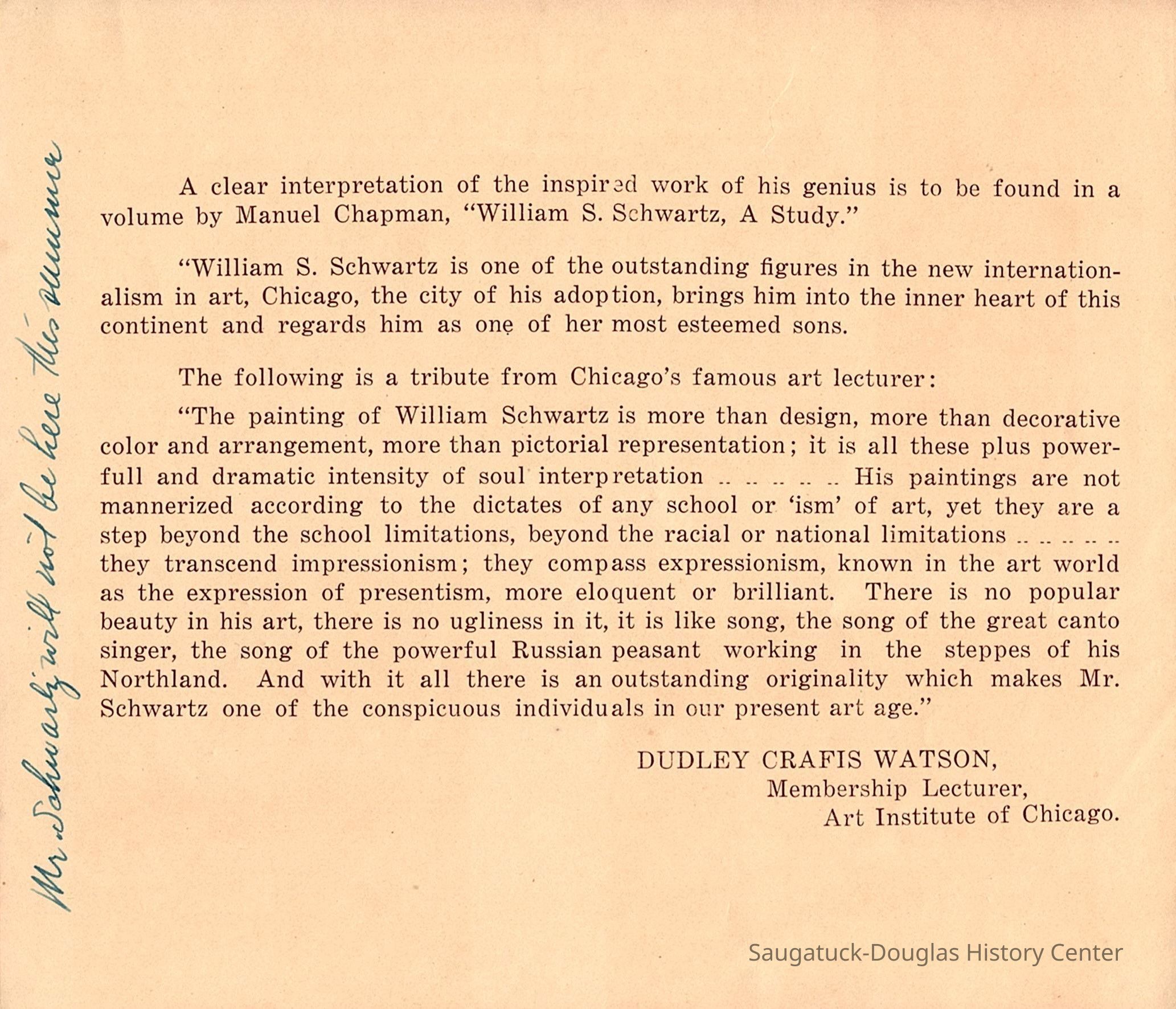 Page one has quotes praising artist William S. Schwartz by author by Manuel Chapman and by Dudley Crafis Watson, membership lecturer, Art Institute to Chicago.